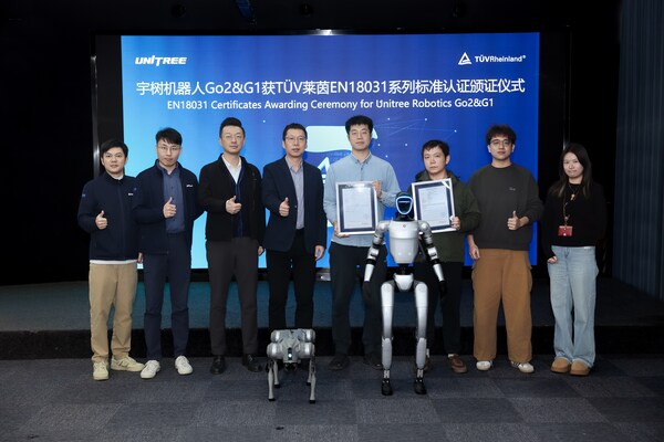 杭州2025年12月19日--12月17日,国际独立第三方检测、检验和认证机构德国莱茵TÜV大中华区(简称"TÜV莱茵")为宇树科技股份有限公司(简称"宇树")旗下G1双足机器人和Go2机器狗颁发了基于EN18031标准的网络安全符合性证书。