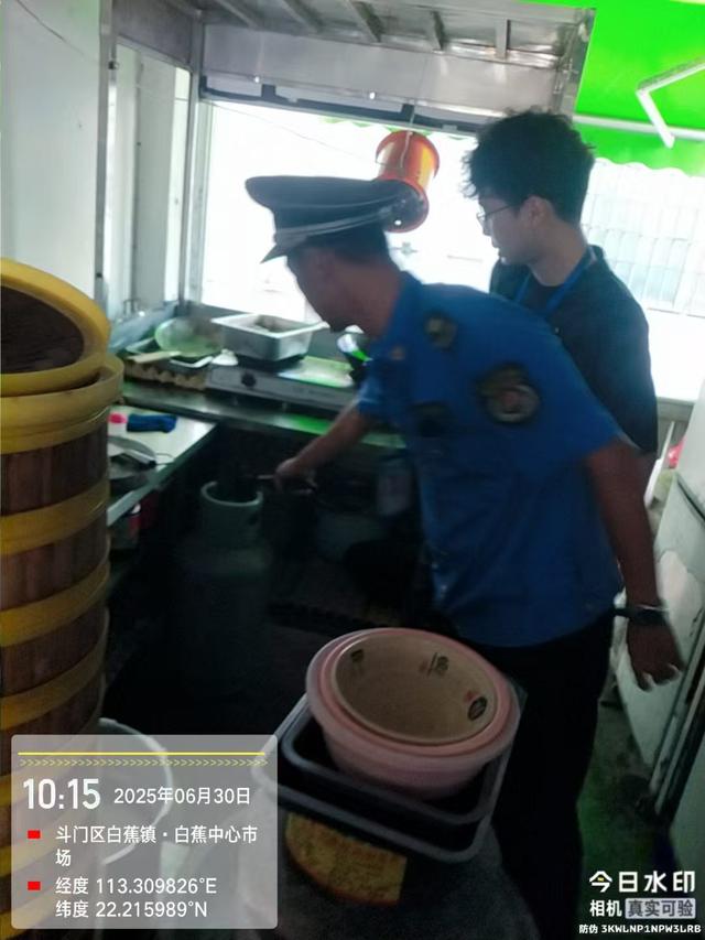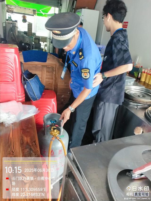 2025年6月27日,珠海市斗门区白蕉镇执法人员巡查发现辖区内某早餐店使用液化石油气时未按照国家标准规定使用过流切断安全装置,当场责令改正。