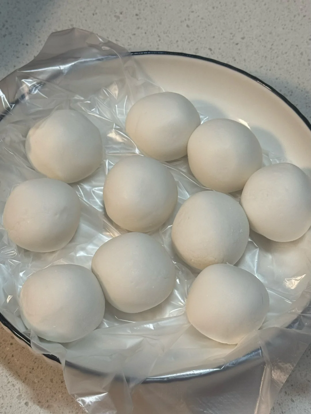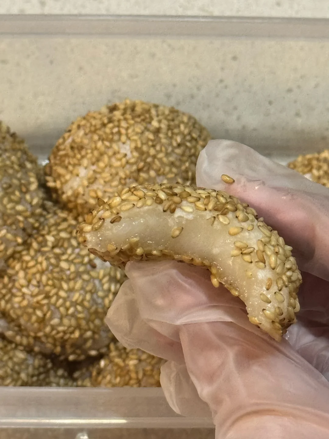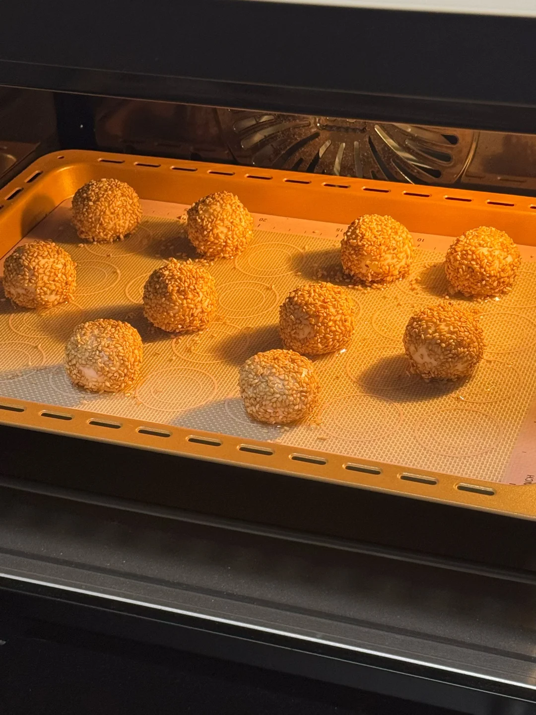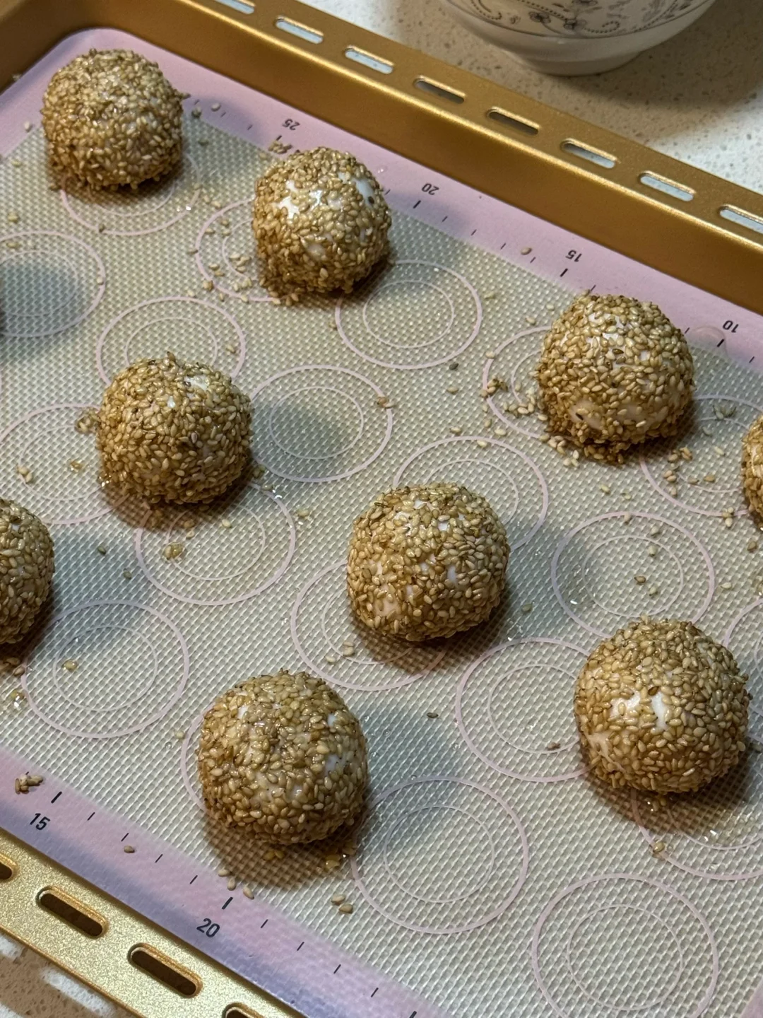 🌷食材(此配方可做10个芝麻球) 糯米粉 150g 白芝麻 50g 白糖 20g 热水 120g 🌷做法: 1.糯米粉、细砂糖,加入热水(少量多次加)先用筷子搅拌成絮状,再揉成一个不粘手的面团(如果粘,可以在手上抹一点糯米粉,好操作!) 2.面团均分成约 10 份,搓成小圆球,每个糯米球先在凉水里快速过一下,再放进芝麻里滚一圈,芝麻会粘得特别牢。 3.烤盘铺上烘焙纸,轻轻刷一层薄油,依次摆上芝麻球。 4.烤箱提前预热,170度烘烤20分钟。刚出炉是外脆里糯的,一口一个超级糯叽叽!!!