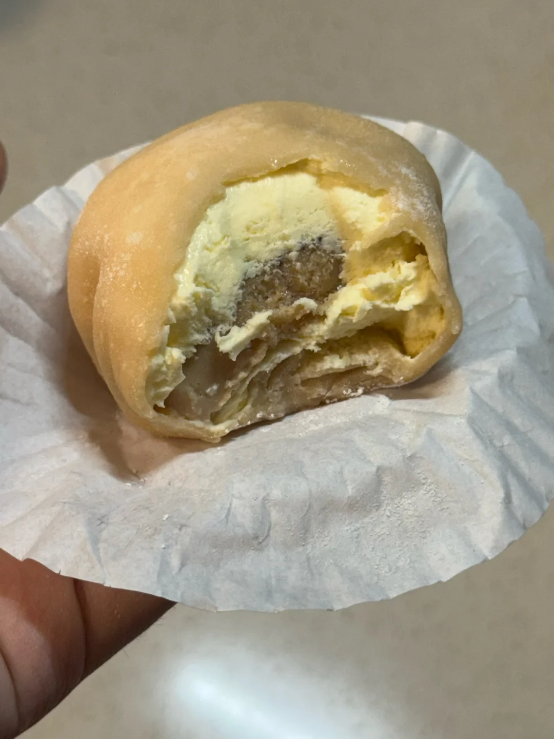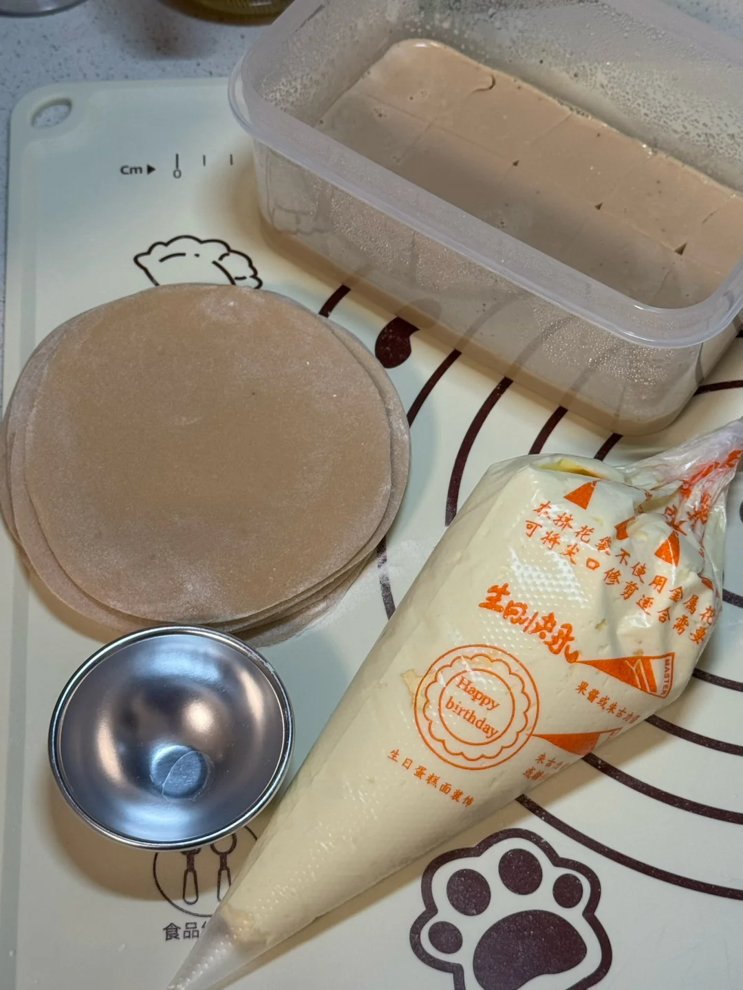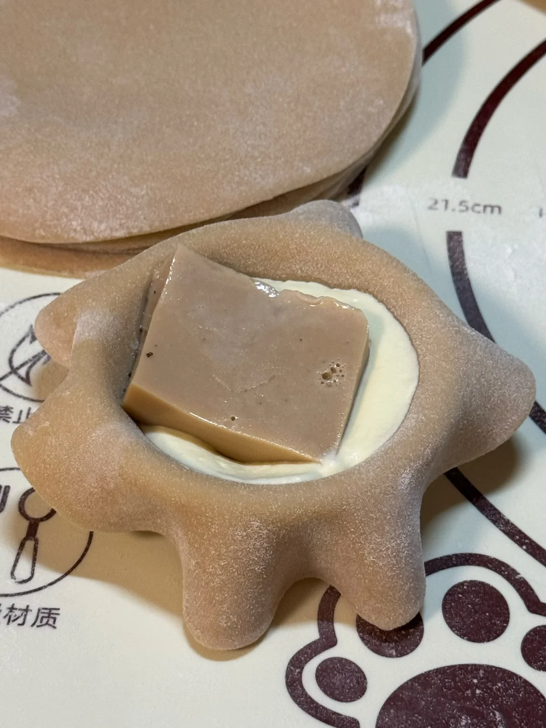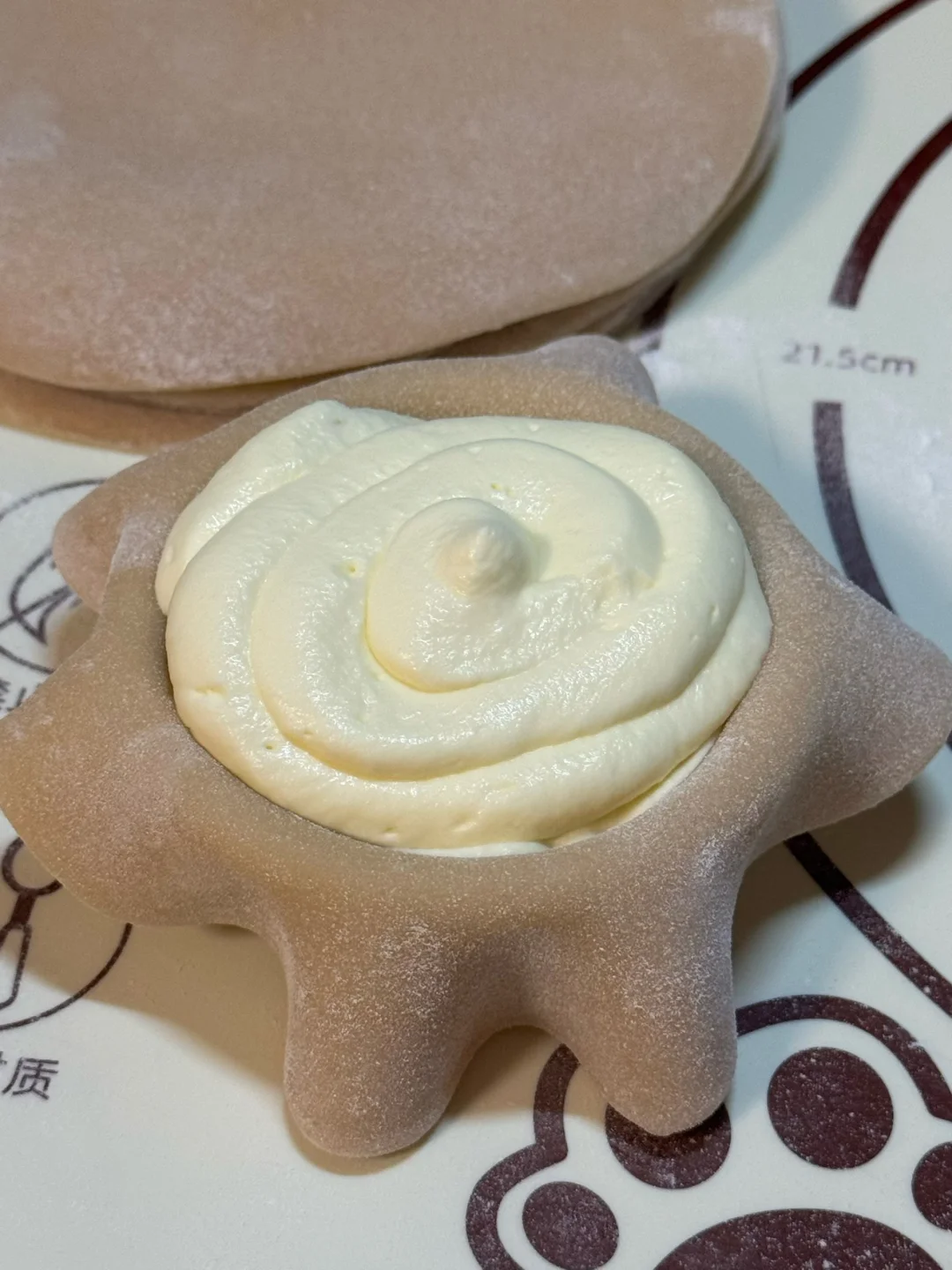 6.擀好的面皮放入模具中,挤上奶油、放入奶冻,再挤上奶油,包包子一样包住,多余的用剪刀剪掉。做好的雪媚娘可以放冰箱冷藏一小时后再享用(也可以放冷冻,吃起来就很冰淇淋一样)