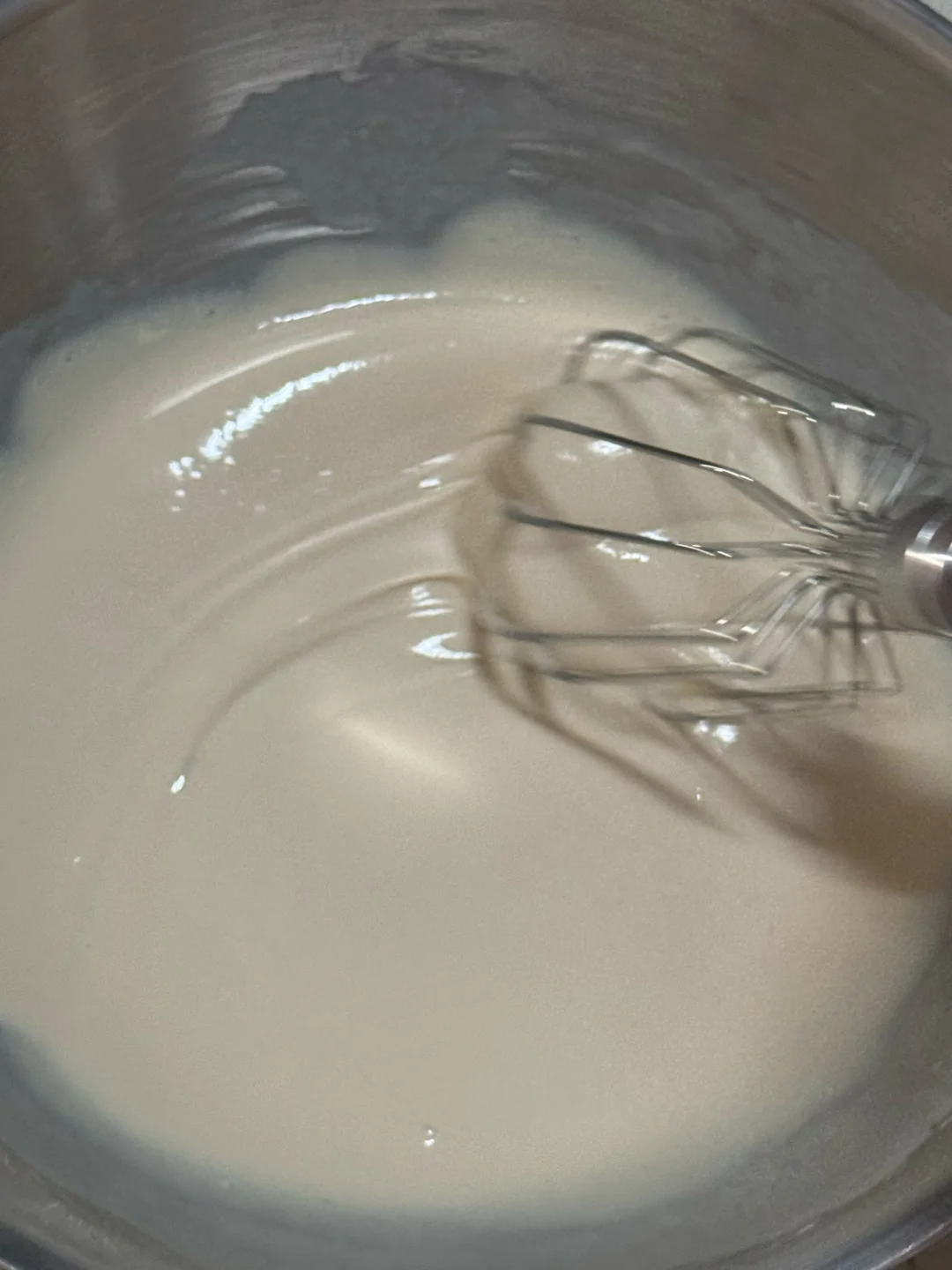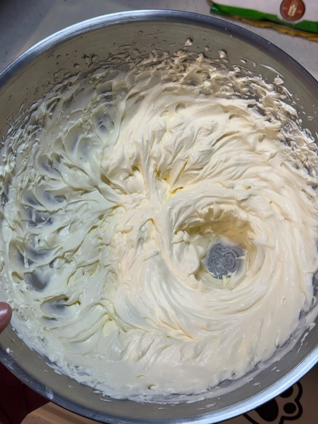 5.奶油250g,细砂糖20g打发至硬挺(打发奶油的时候可以放一包伯爵红茶,我当时忘记放了)