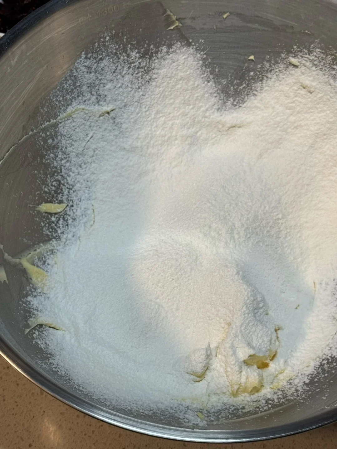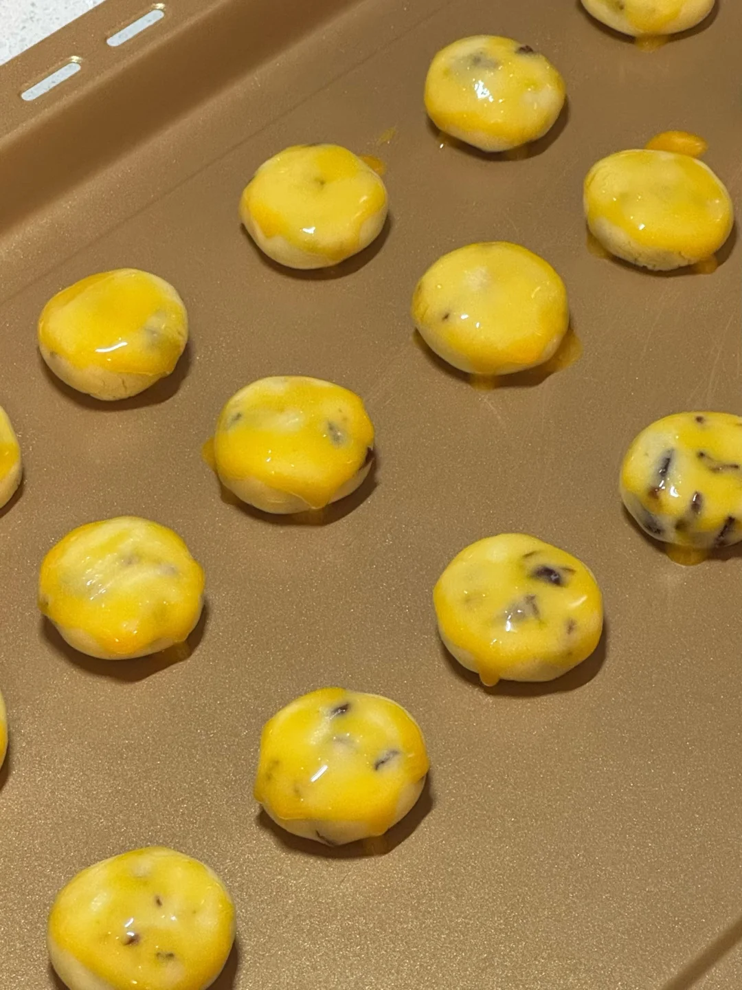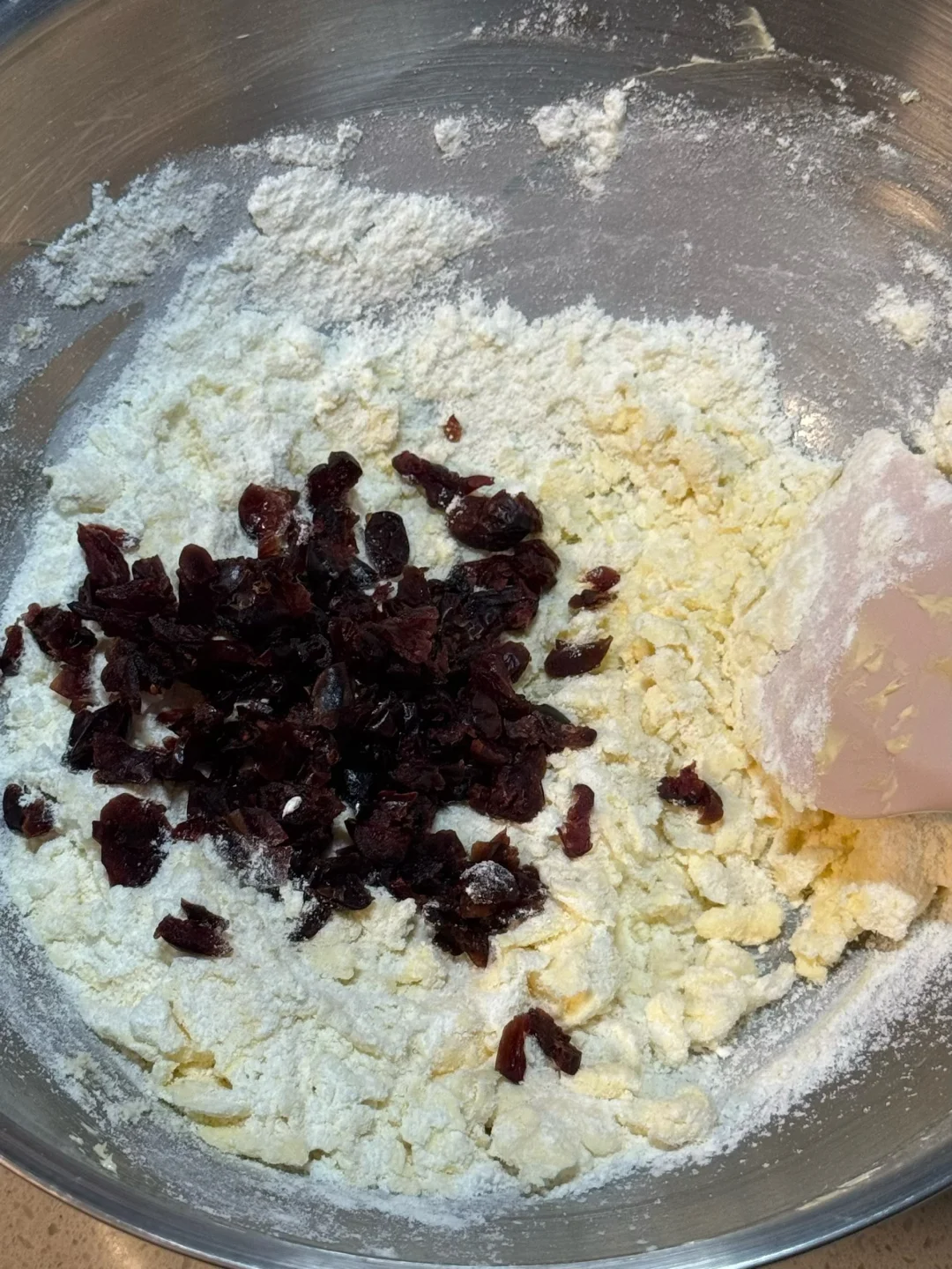2.筛入奶粉、低筋面粉用硅胶铲翻拌均匀,加入切碎的蔓越莓干碎,戴上手套混合成团,均分成10g一个揉圆,然后稍微按扁一下,表面刷蛋黄液。