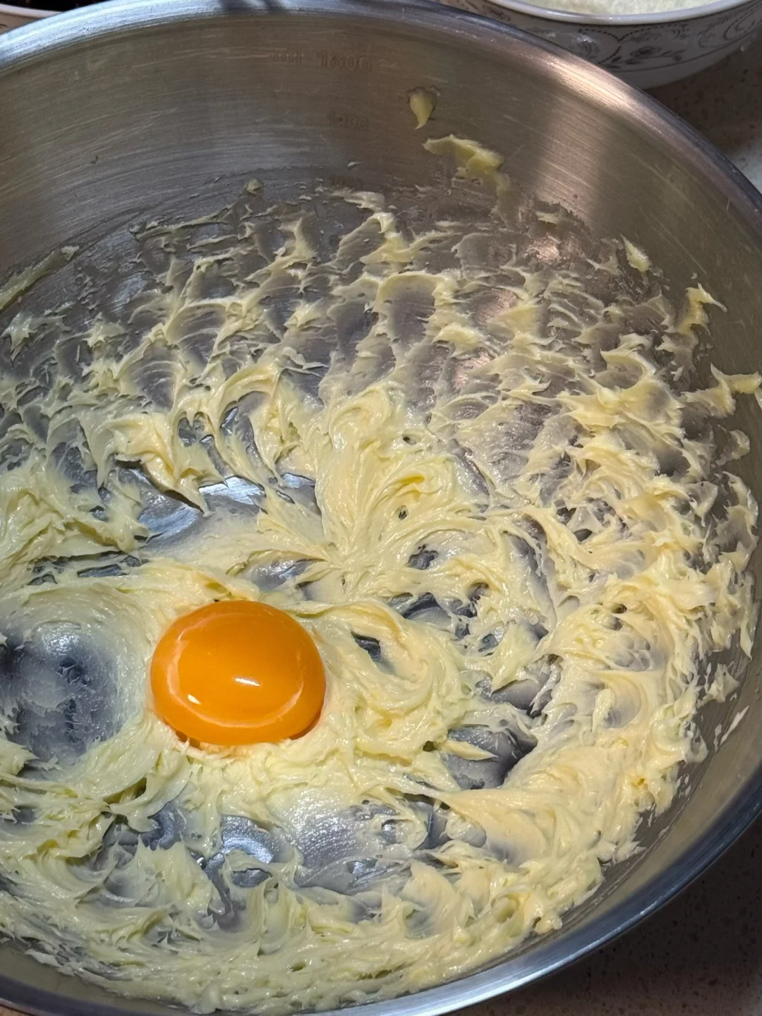 1.黄油软化后,加入糖粉先用硅胶铲大致混匀,再用打蛋器打发均匀,加入一颗蛋黄打发均匀,没打到的地方用硅胶铲刮到中间继续打发均匀。