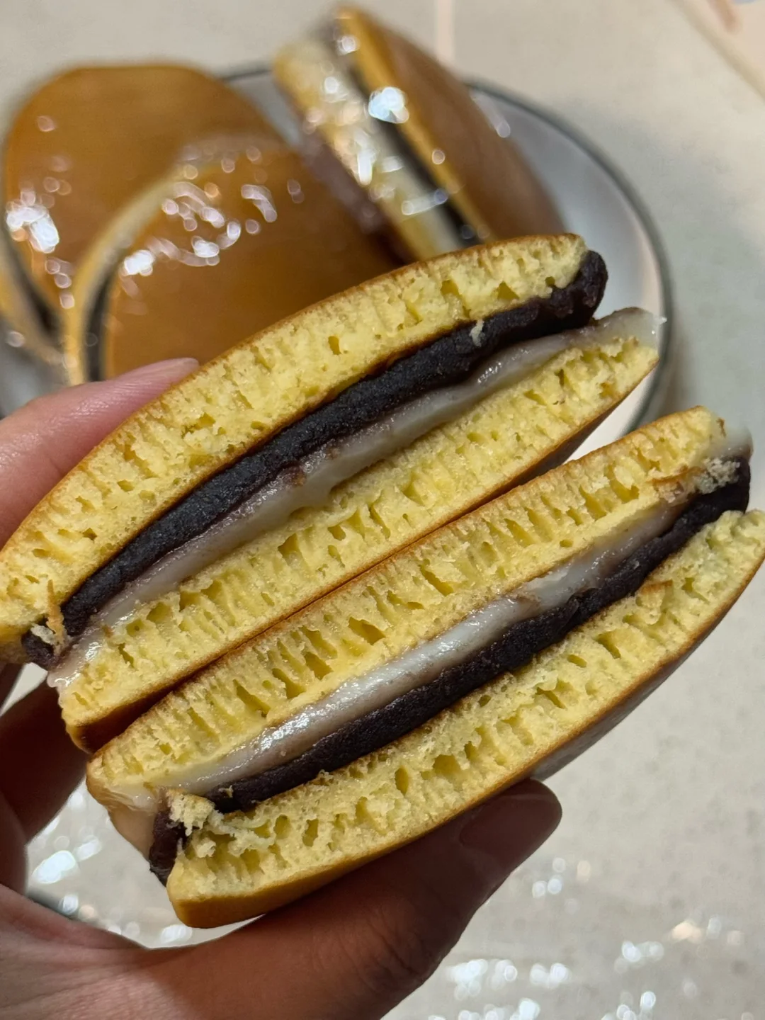 2.全部煎好后,进行组装,先铺一层麻薯,再铺一层红豆沙(也可以放自己爱吃的馅料(比如肉松、奶酪、芋泥)