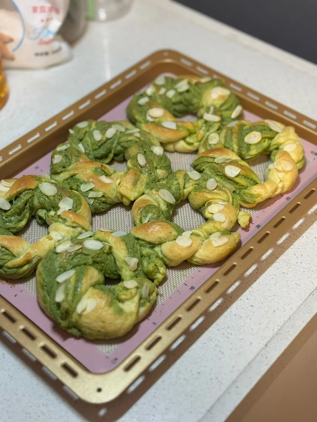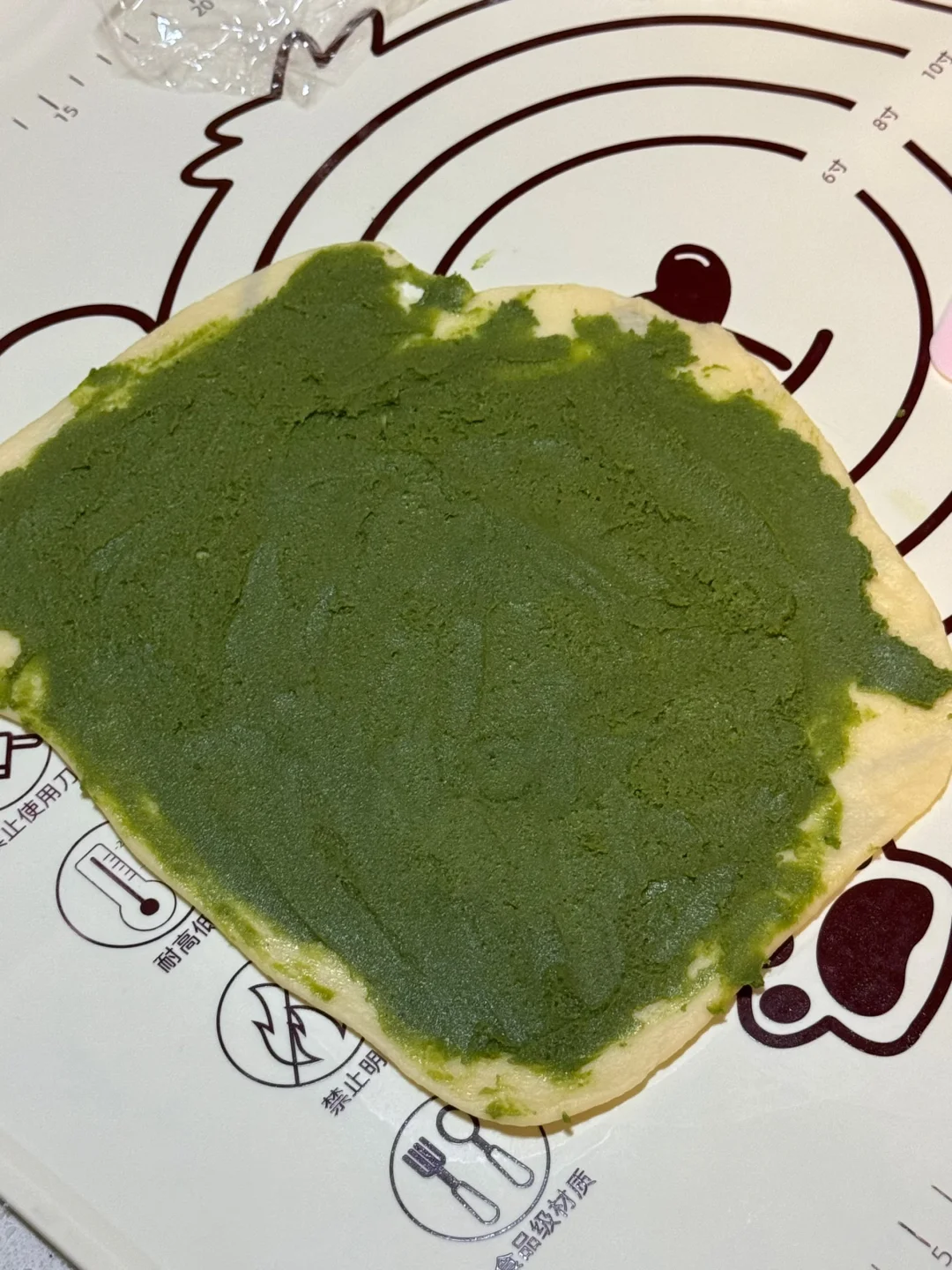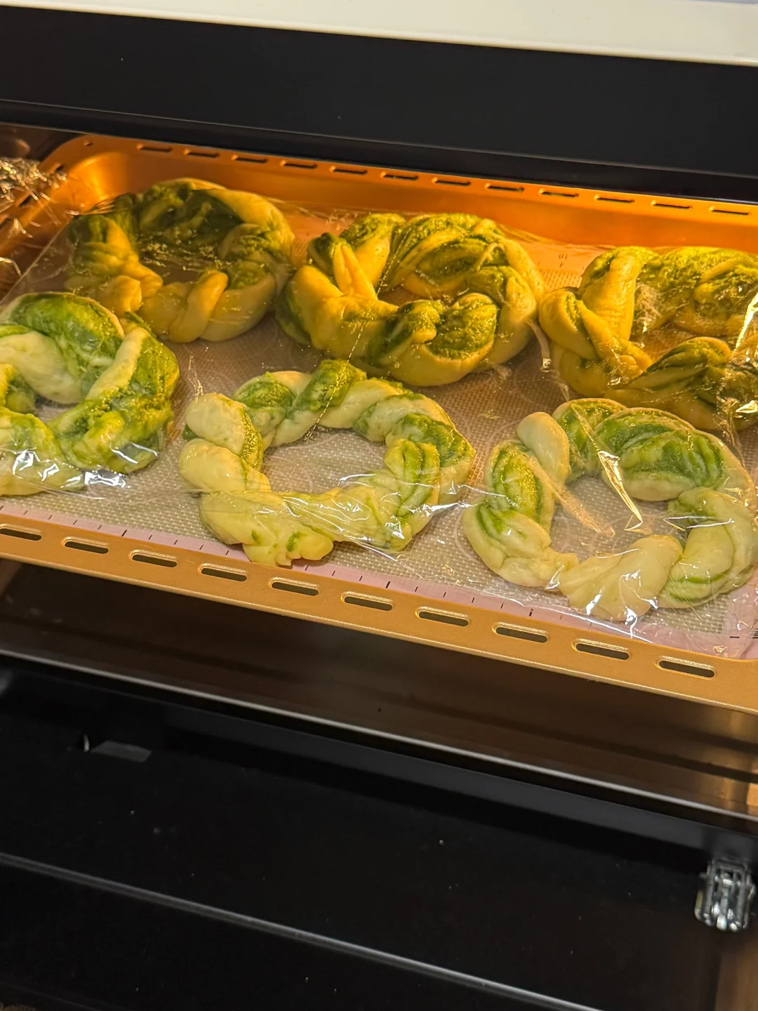 4.发酵好的面团按压排气,平均分成6份,依次揉圆,盖保鲜膜松弛20分钟,松弛好取出第一个面团,按扁擀薄,翻个面,擀成长方形,抹上抹茶奶酥馅,从上往下卷起,接口处捏紧,搓长一点,从中间分成两条,像扭麻花一样把它扭起来,扭好后接口处捏紧,放入烤盘,盖上保鲜膜,放一杯热水增加湿度,35度发酵30分钟。
