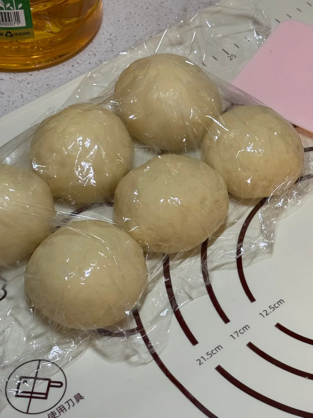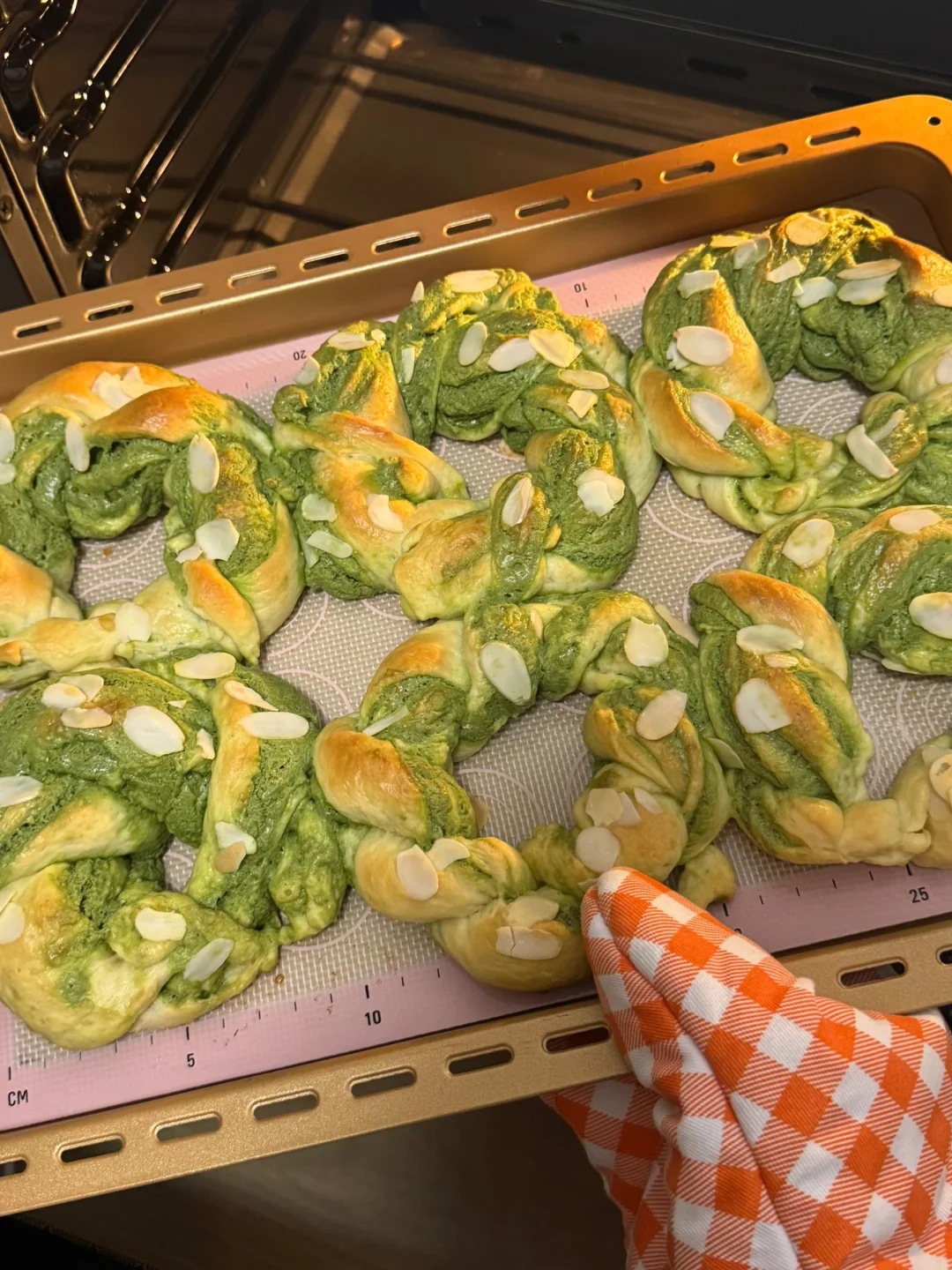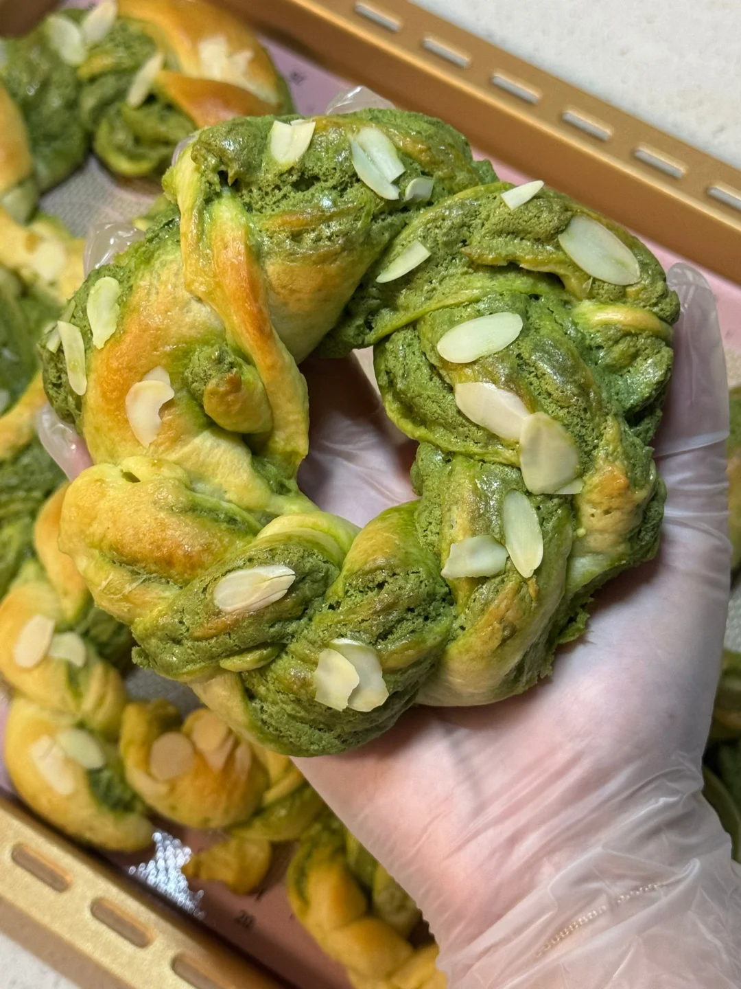 4.发酵好的面团按压排气,平均分成6份,依次揉圆,盖保鲜膜松弛20分钟,松弛好取出第一个面团,按扁擀薄,翻个面,擀成长方形,抹上抹茶奶酥馅,从上往下卷起,接口处捏紧,搓长一点,从中间分成两条,像扭麻花一样把它扭起来,扭好后接口处捏紧,放入烤盘,盖上保鲜膜,放一杯热水增加湿度,35度发酵30分钟。