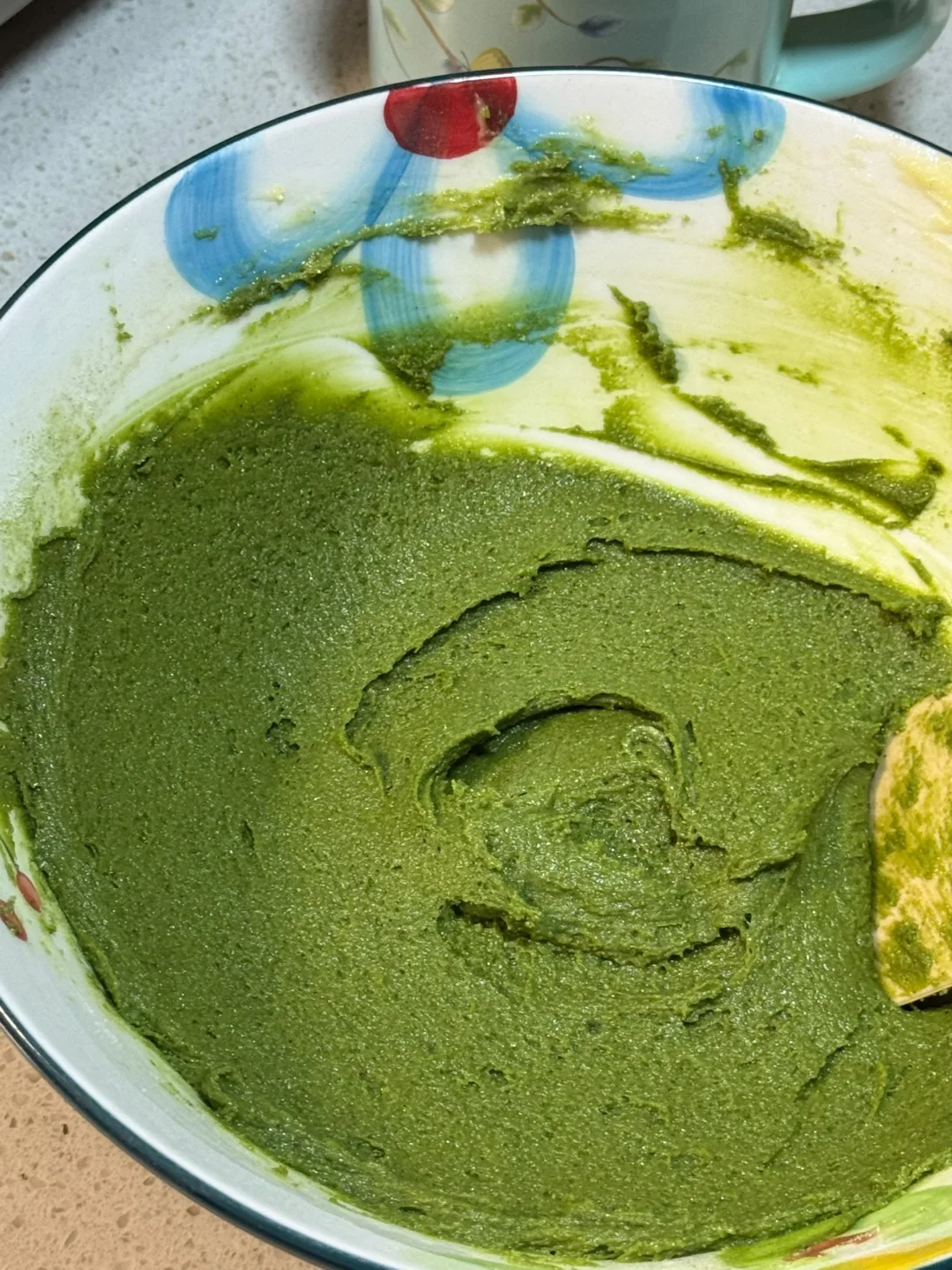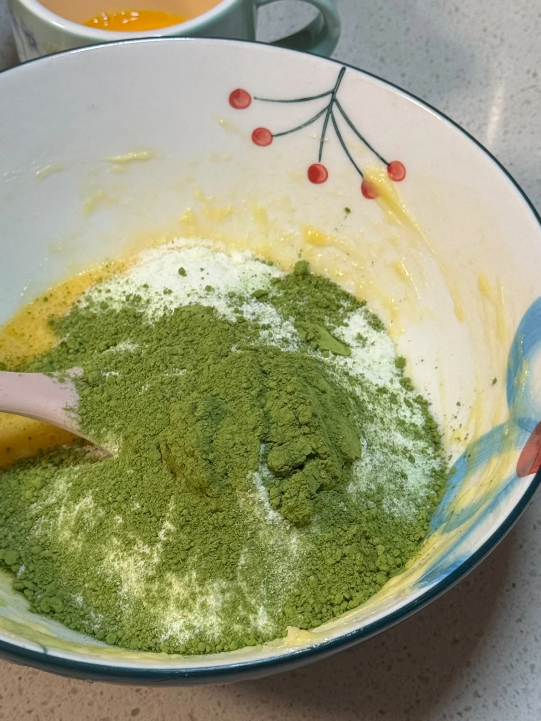 3.在发酵面团时候可以来准备抹茶奶酥馅,软化后的黄油,加入糖粉搅拌至顺滑,分两次加入蛋液,再加入抹茶粉、奶粉翻拌至无干粉(放冷藏备用)