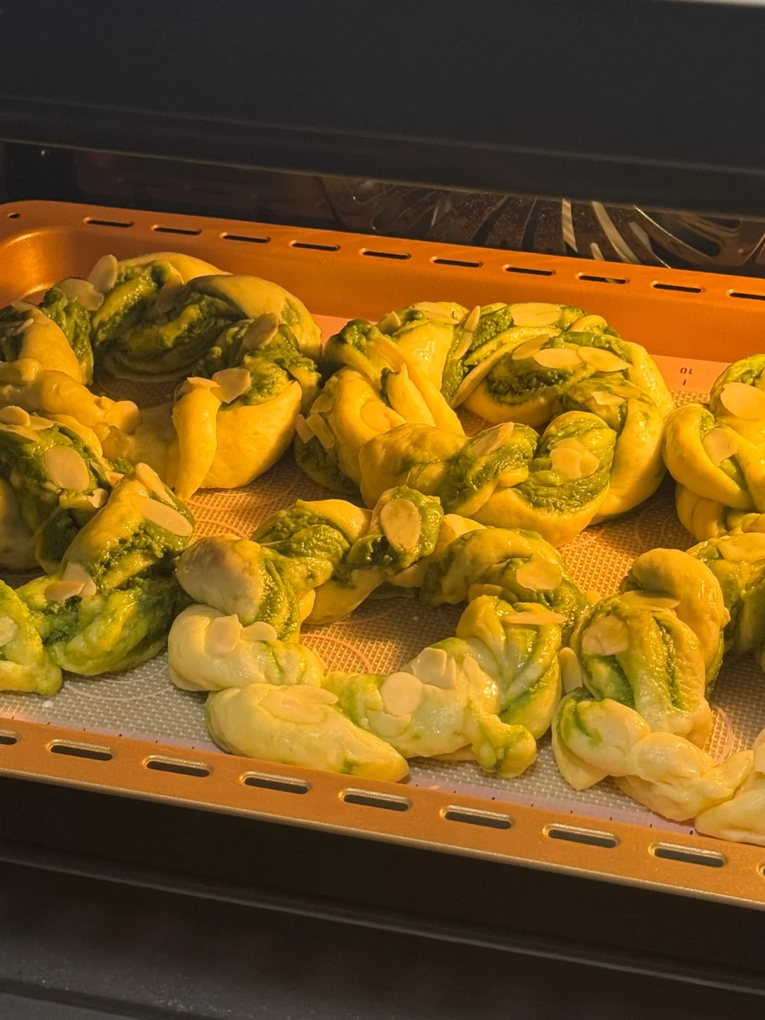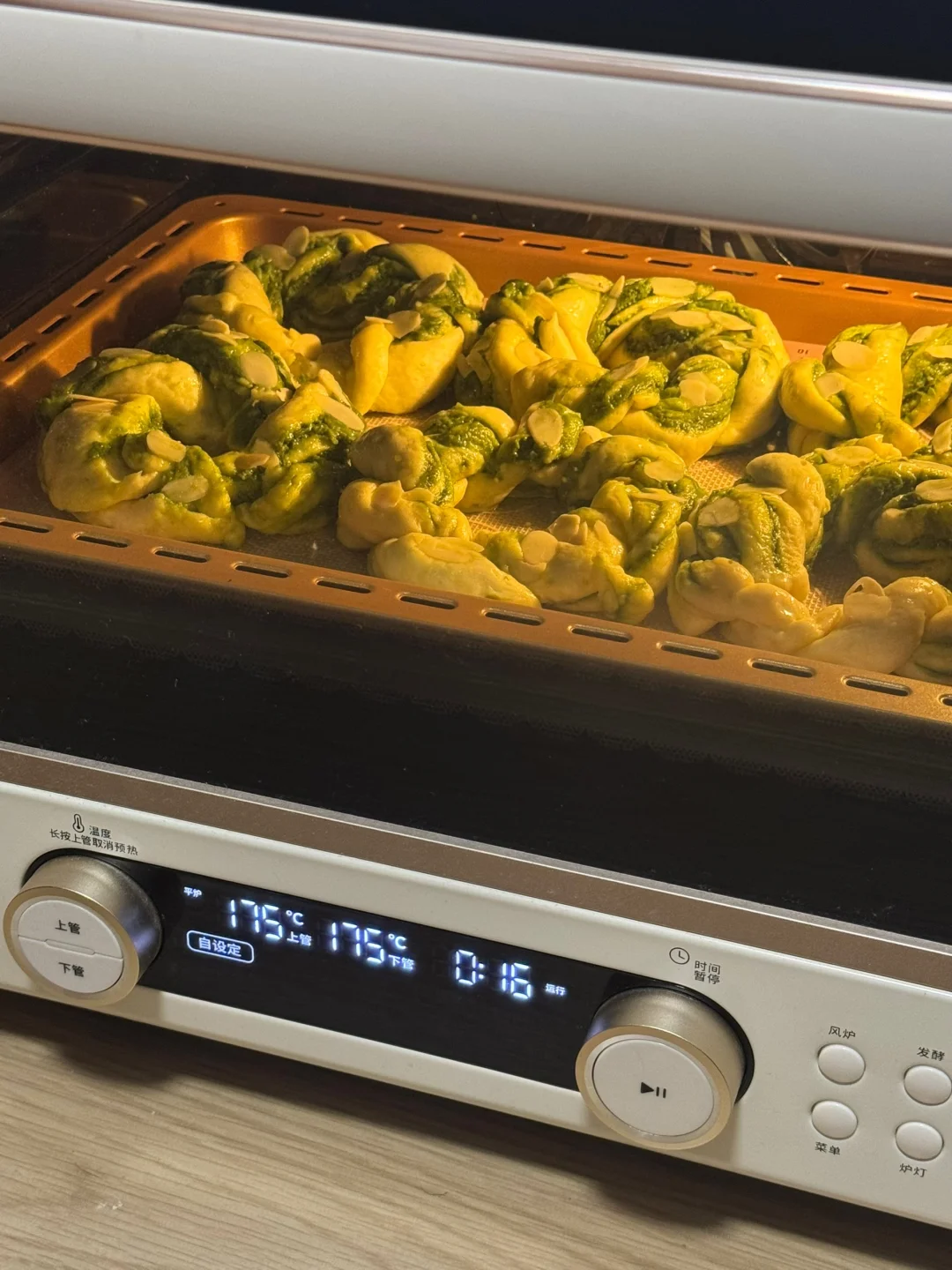 5.发酵好后拿出,表面刷一层牛奶,撒上些杏仁片,放入预热好的烤箱,175度16分钟。