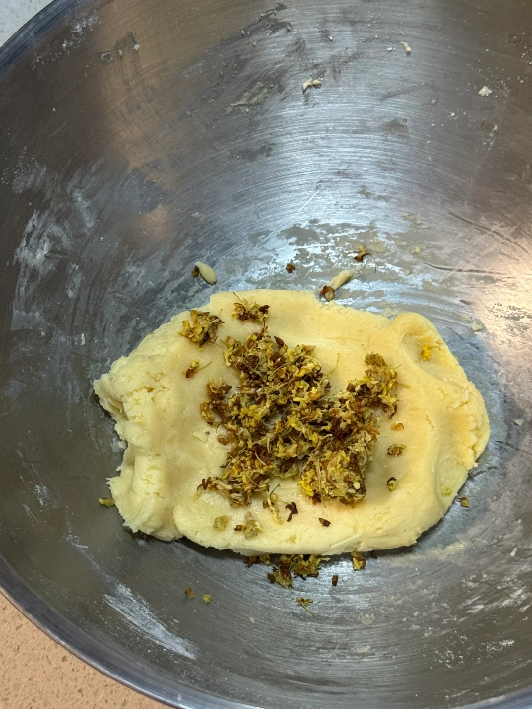 1.做曲奇软化黄油是很重要的(不可省略哦)干桂花提前用水浸泡(可以防止烘烤的时候焦糊)