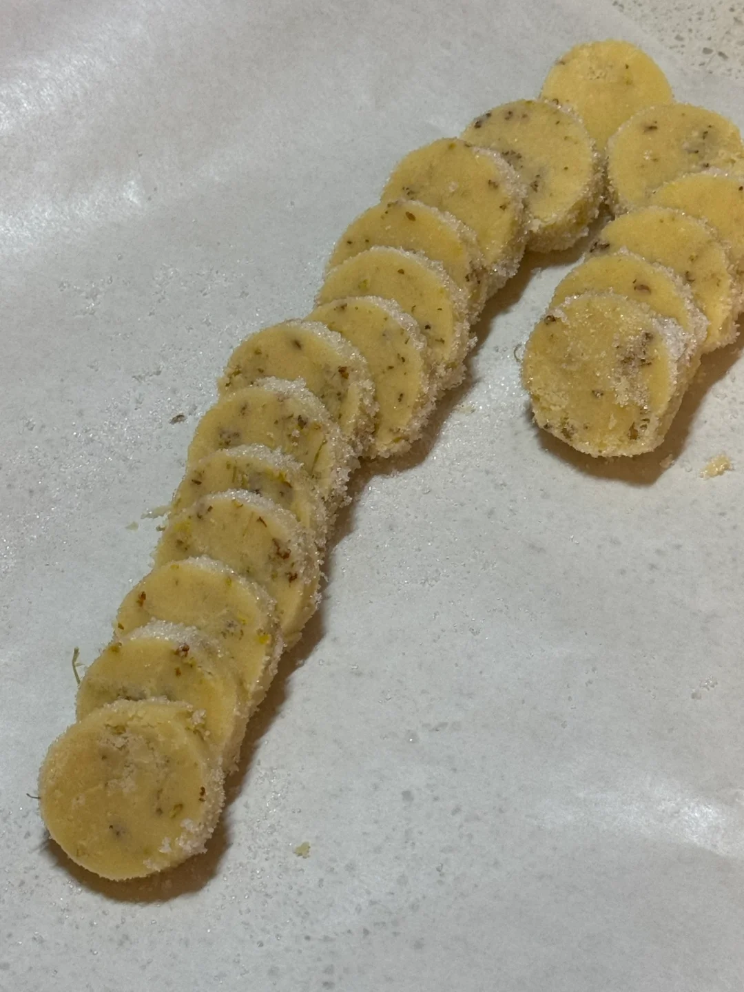 4.取出,回温10分钟,沾一层细砂糖,切块,烤箱提前预热,放入烤盘,160度烘烤20分钟。