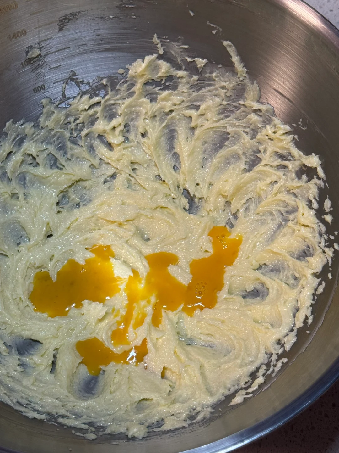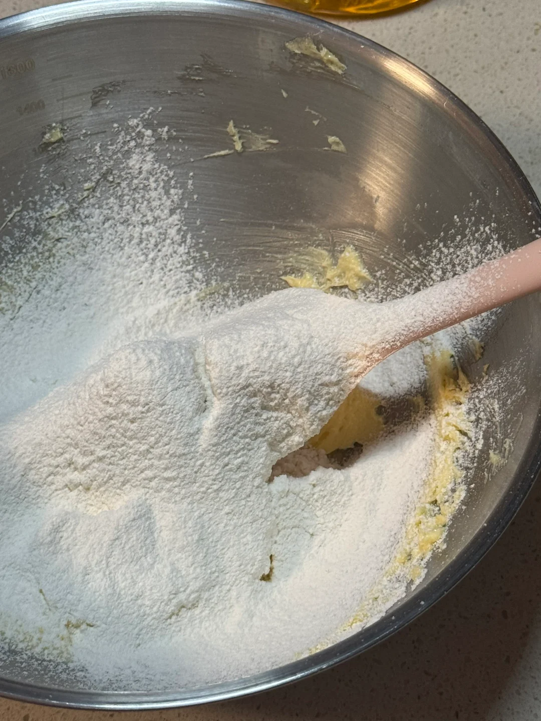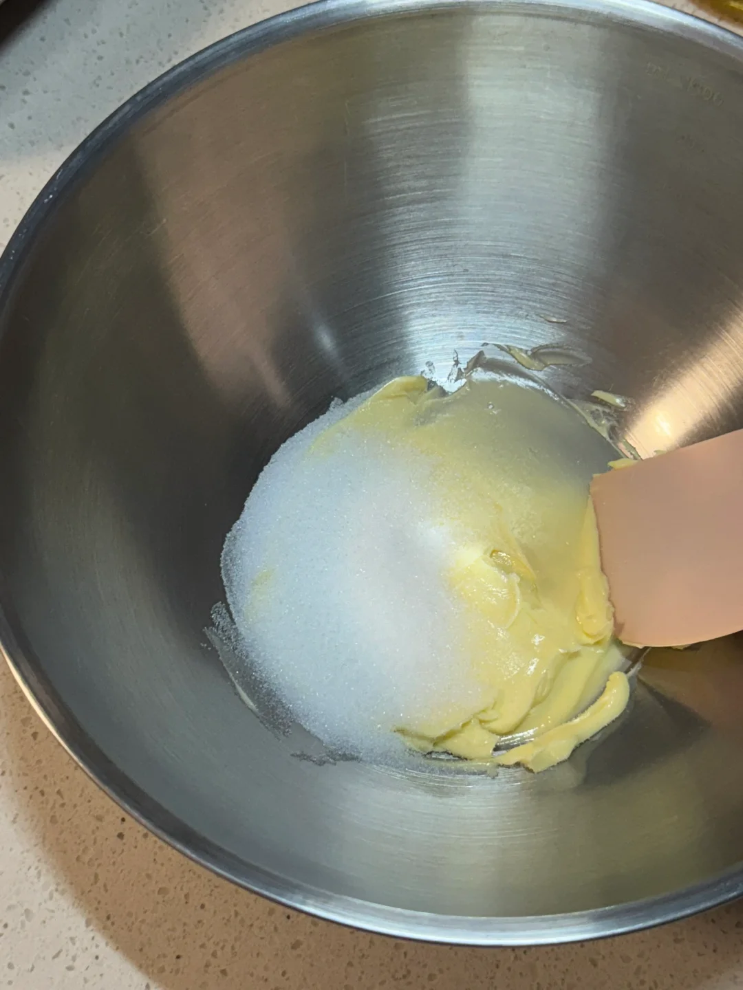 2.软化好的黄油加入细砂糖翻拌均匀,打蛋器打发至蓬松发白的状态,加入全蛋液继续打发,筛入低筋面粉用切拌的手法,切拌至无干粉再加入桂花(浸泡好之后挤干水分)继续切拌混合均匀。