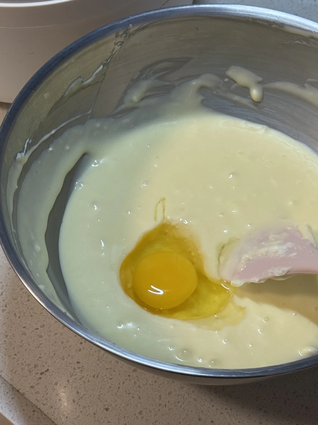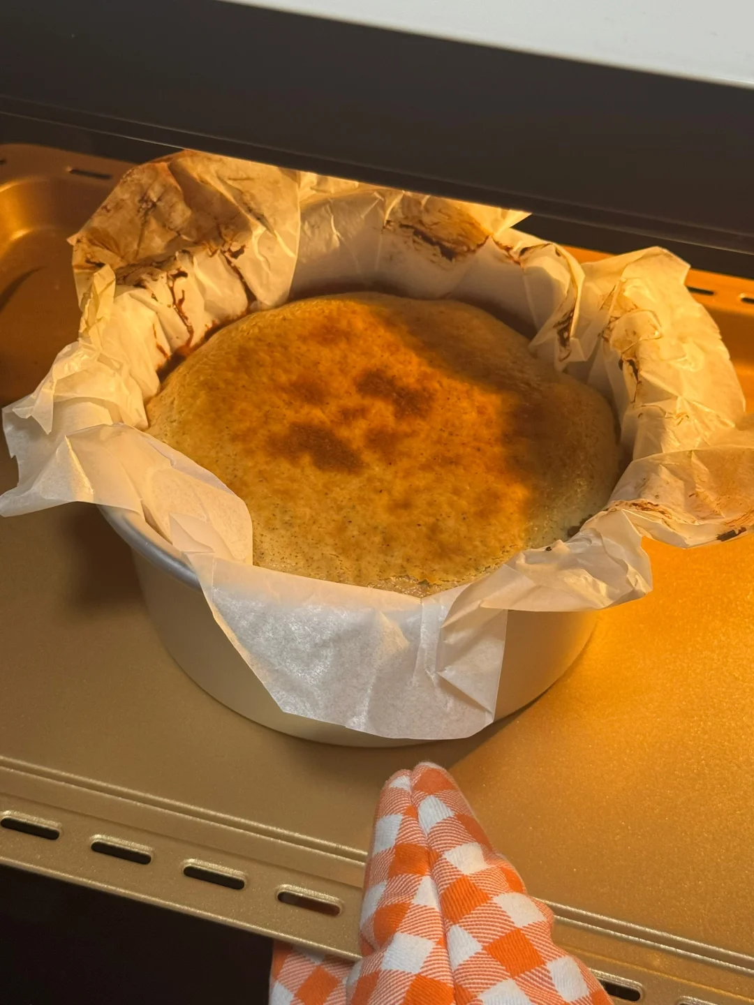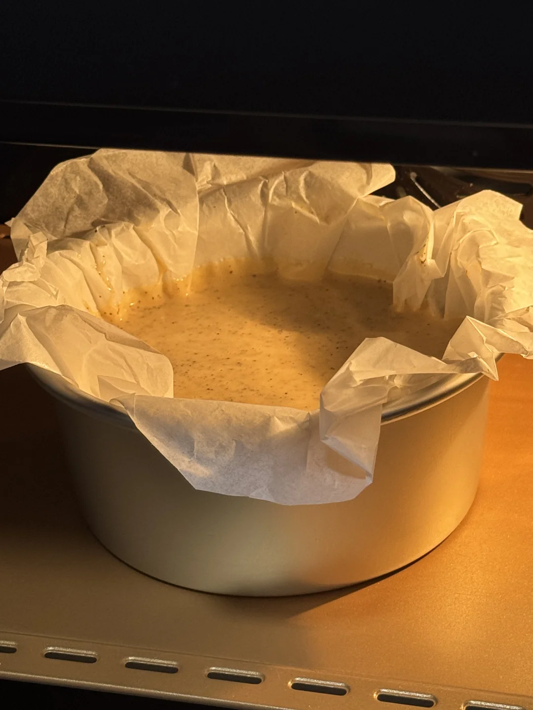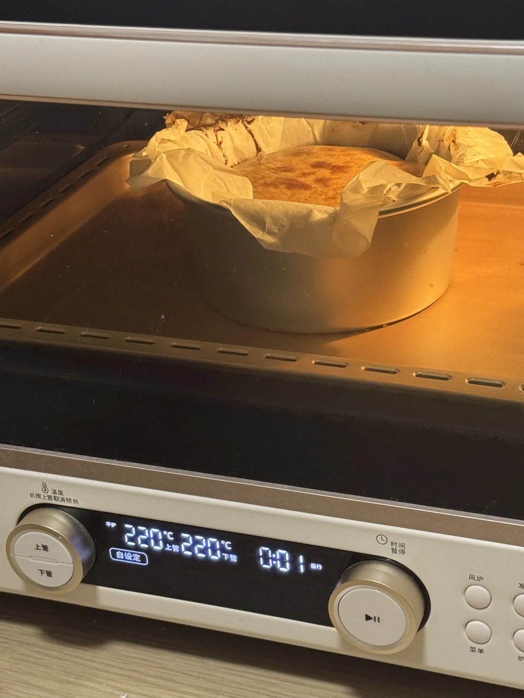 3.烤箱提前预热,将蛋糕糊倒入模具中,200度烘烤25分钟(中途观察,如果上色不够就调高一点迅速上色)出炉后晾凉,密封放冰箱冷藏4小时以上或者冷藏过夜。
