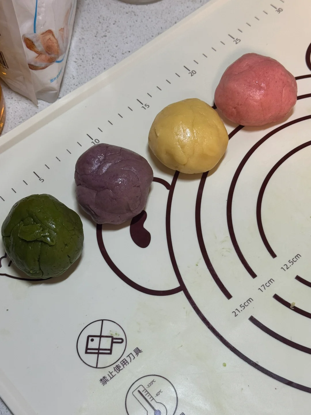 3.筛入低筋面粉按压成团(不要过度揉搓防止面团起筋)将面团均分成4份,另外3份分别加入仙人掌果粉、抹茶粉、紫薯粉按压均匀。