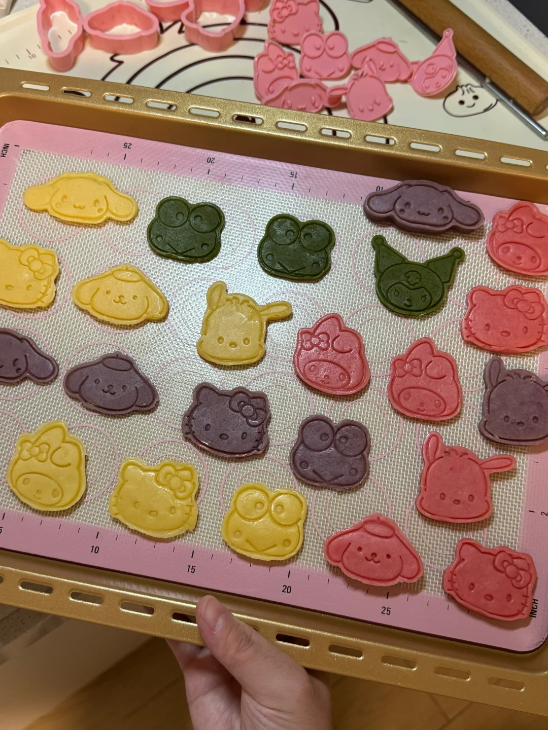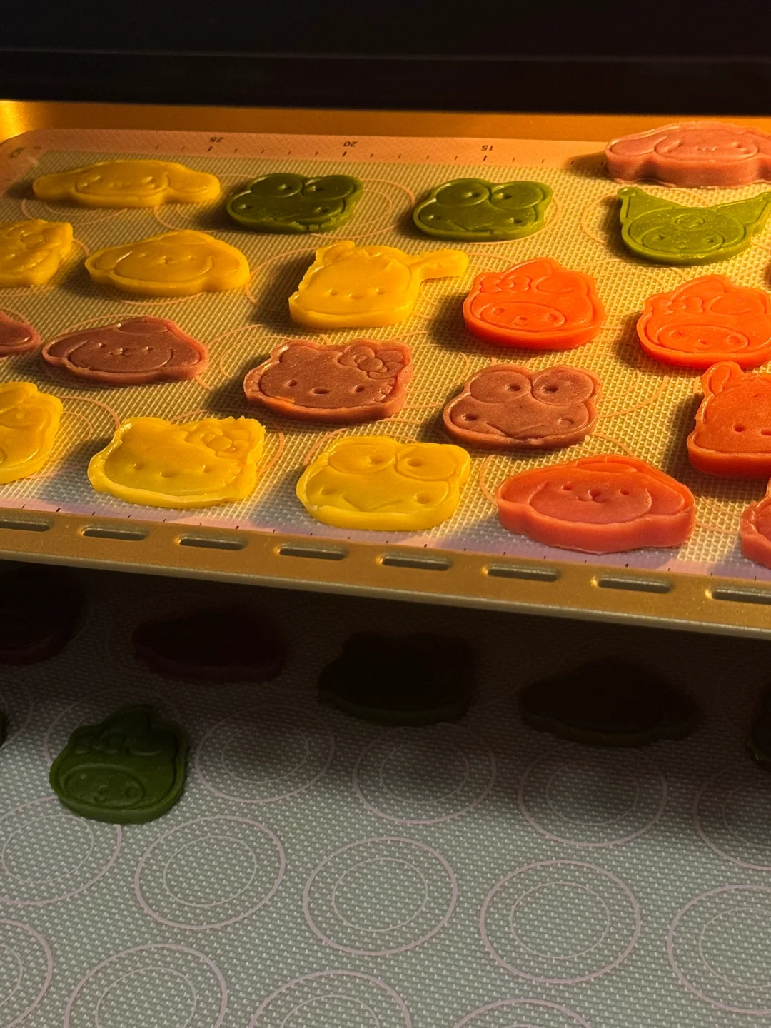 4.上下两面盖油纸,将面团依次擀成面片,放入冰箱冷冻10分钟,拿出来刻模,如果面团软了可以继续放冷冻个几分钟(这个过程需要耐心)刻好后放入烤盘。