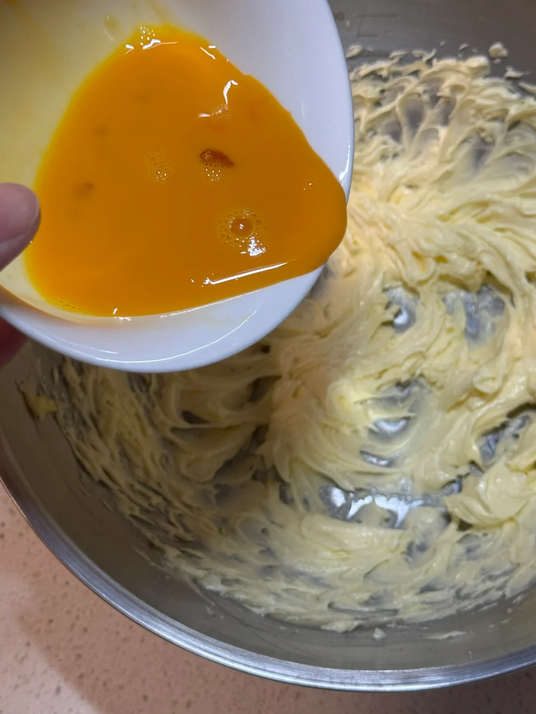 2.分三次加入常温全蛋液打发至吸收,每次打发至完全吸收后再加下一次,避免一次性加入导致水油分离。