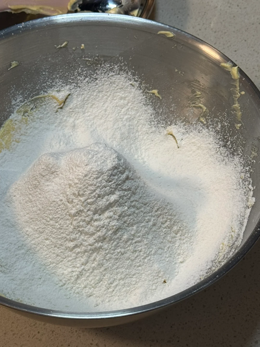 1.黄油软化后加入糖粉先用刮刀翻拌均匀,再用打蛋器打发至蓬松发白
