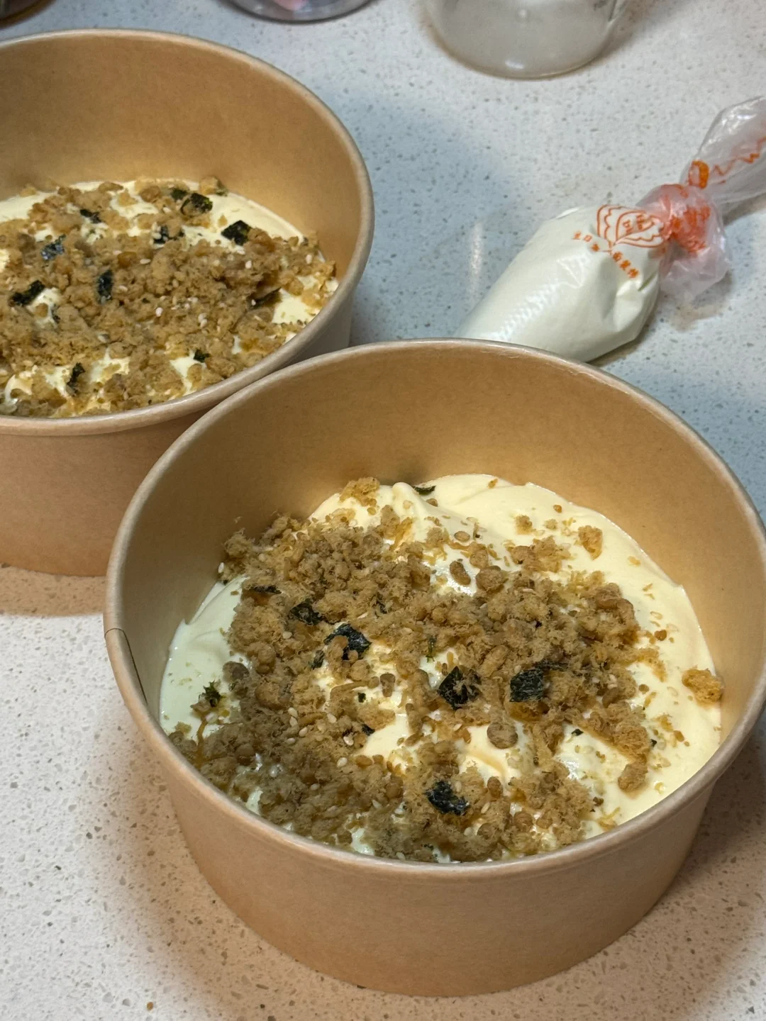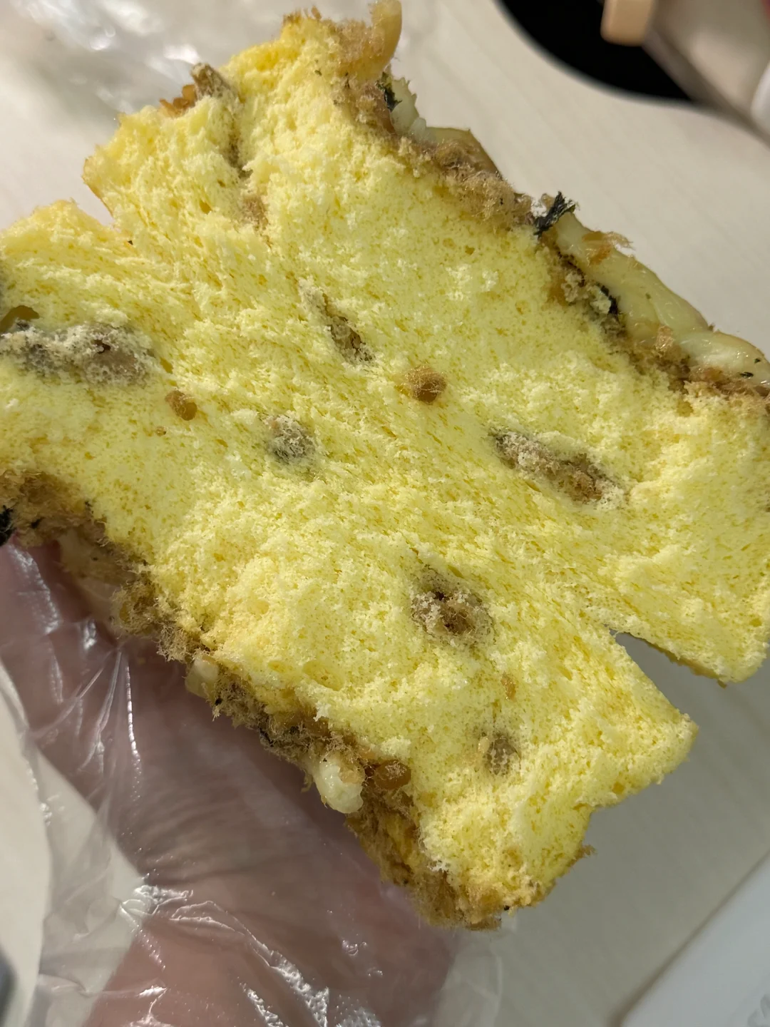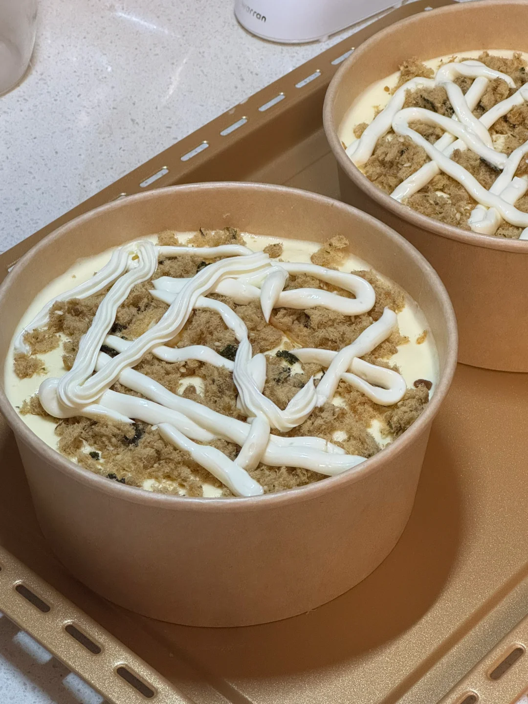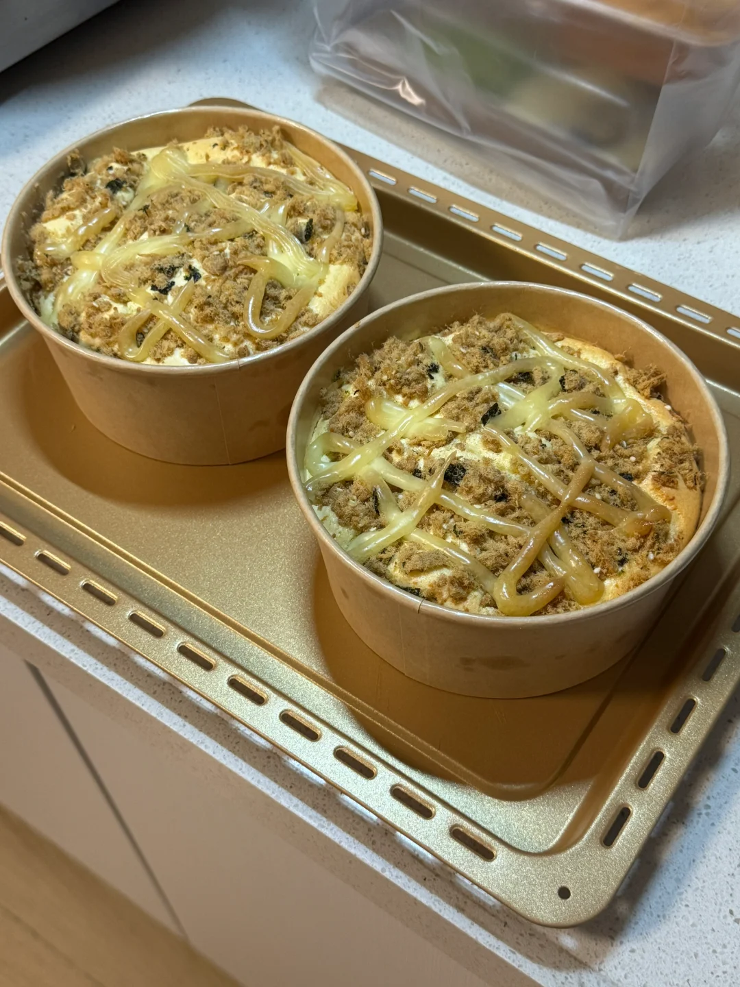 5.先倒入140g的面糊,放点海苔肉松,再倒入160g的面糊,表面再放入海苔肉松(如果有火腿也可以加一些火腿丁增添下风味)