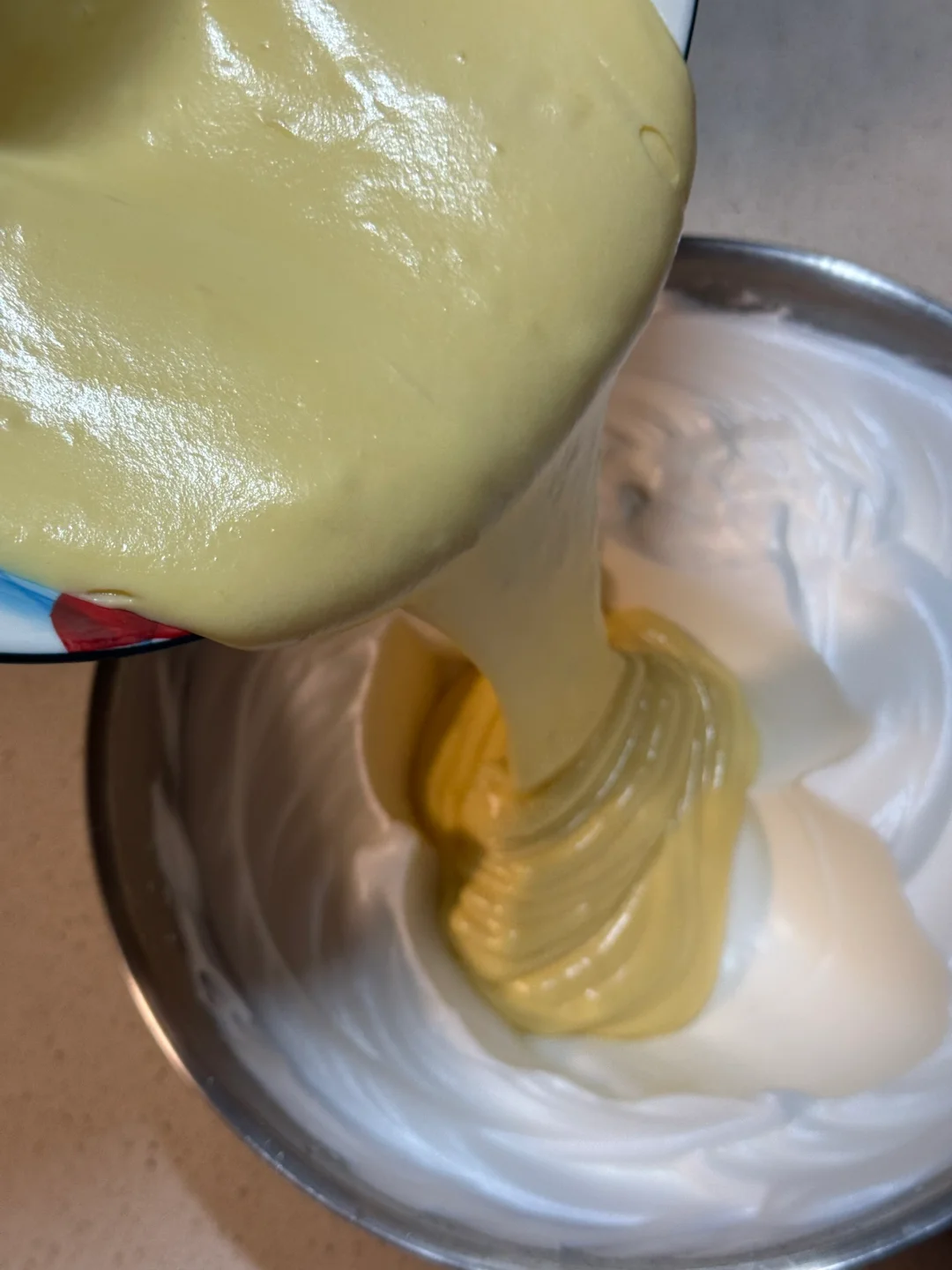 4.冻好的蛋白,打发至提起有小尖角,取一部分蛋白霜与蛋黄糊糊翻拌均匀,再倒入蛋白霜翻拌均匀。