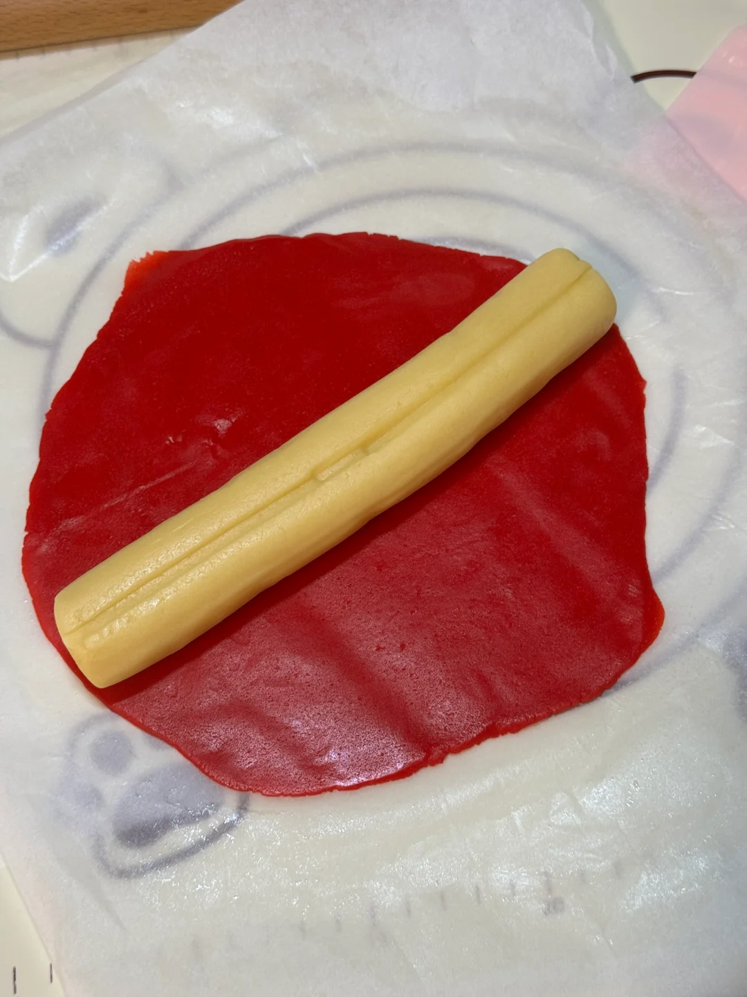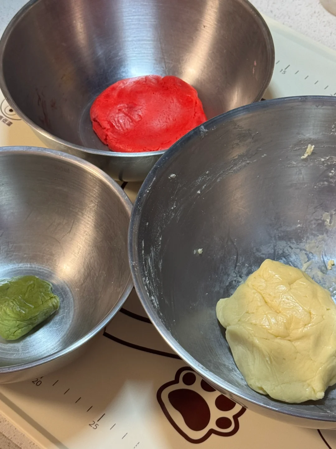 3.分出三份,110g加入红丝绒色素,30g加入抹茶粉调色,剩下的原味面团整成圆柱形,红色面团擀成大面片,绿色面团整成水滴形。