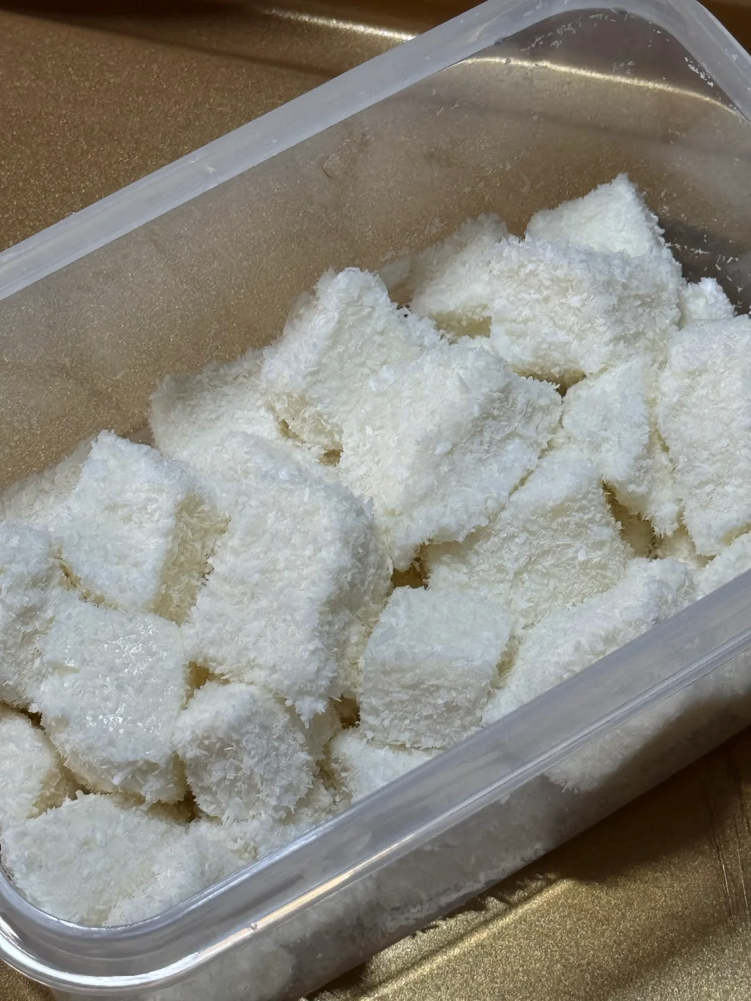 🌷食材: 淡奶油150ml 纯牛奶250ml 椰浆200ml 吉利丁片13g 细砂糖40g 椰蓉 🌷做法: 1.奶锅中加入纯牛奶、椰浆、淡奶油、细砂糖小火煮至细砂糖融化微微沸腾。 2.加入泡软的吉利丁片,搅拌均匀,搅拌至吉利丁片完全融化,倒入容器中,晾凉放冰箱冷藏一夜。 3.第二天拿出切块,裹上椰蓉。