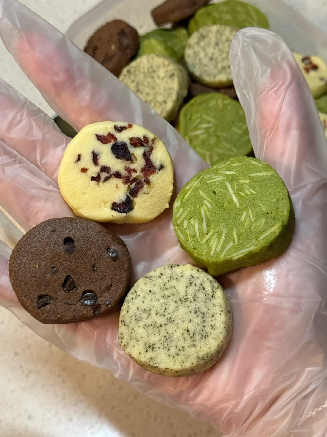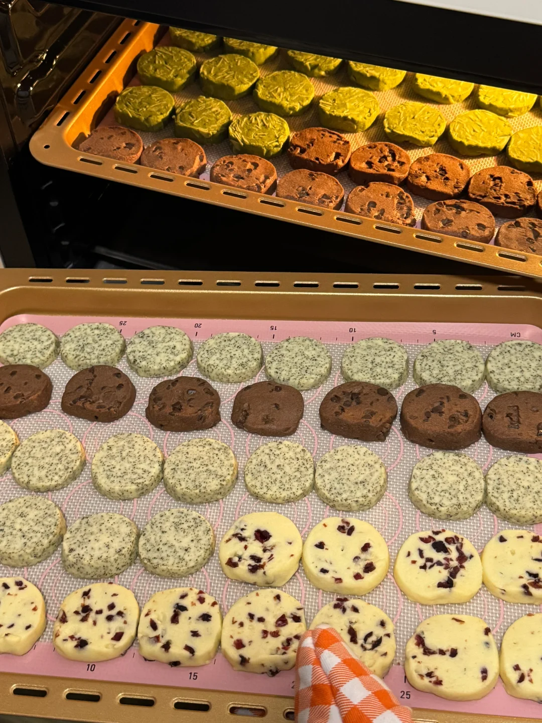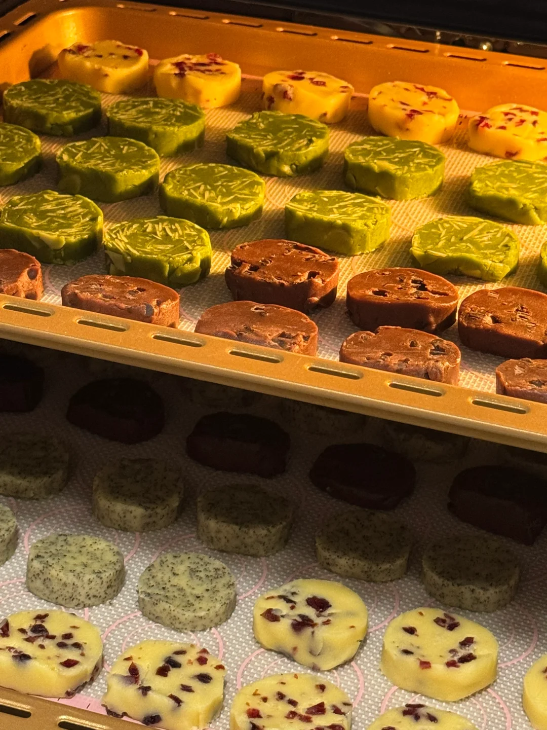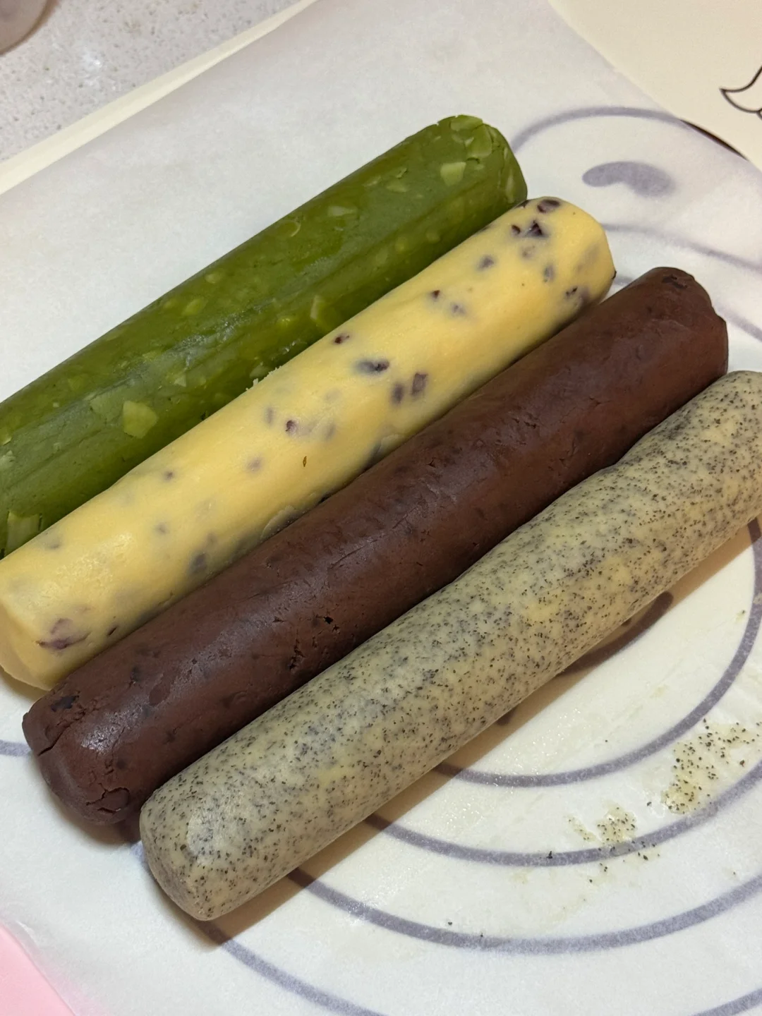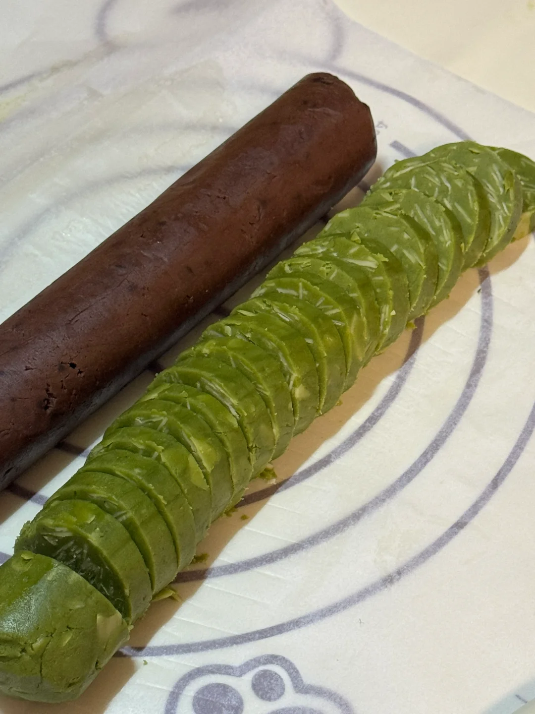🌷分别揉搓混合均匀,底部铺烘焙纸,将面团整成圆柱形,冷冻一小时切片,摆入烤盘。