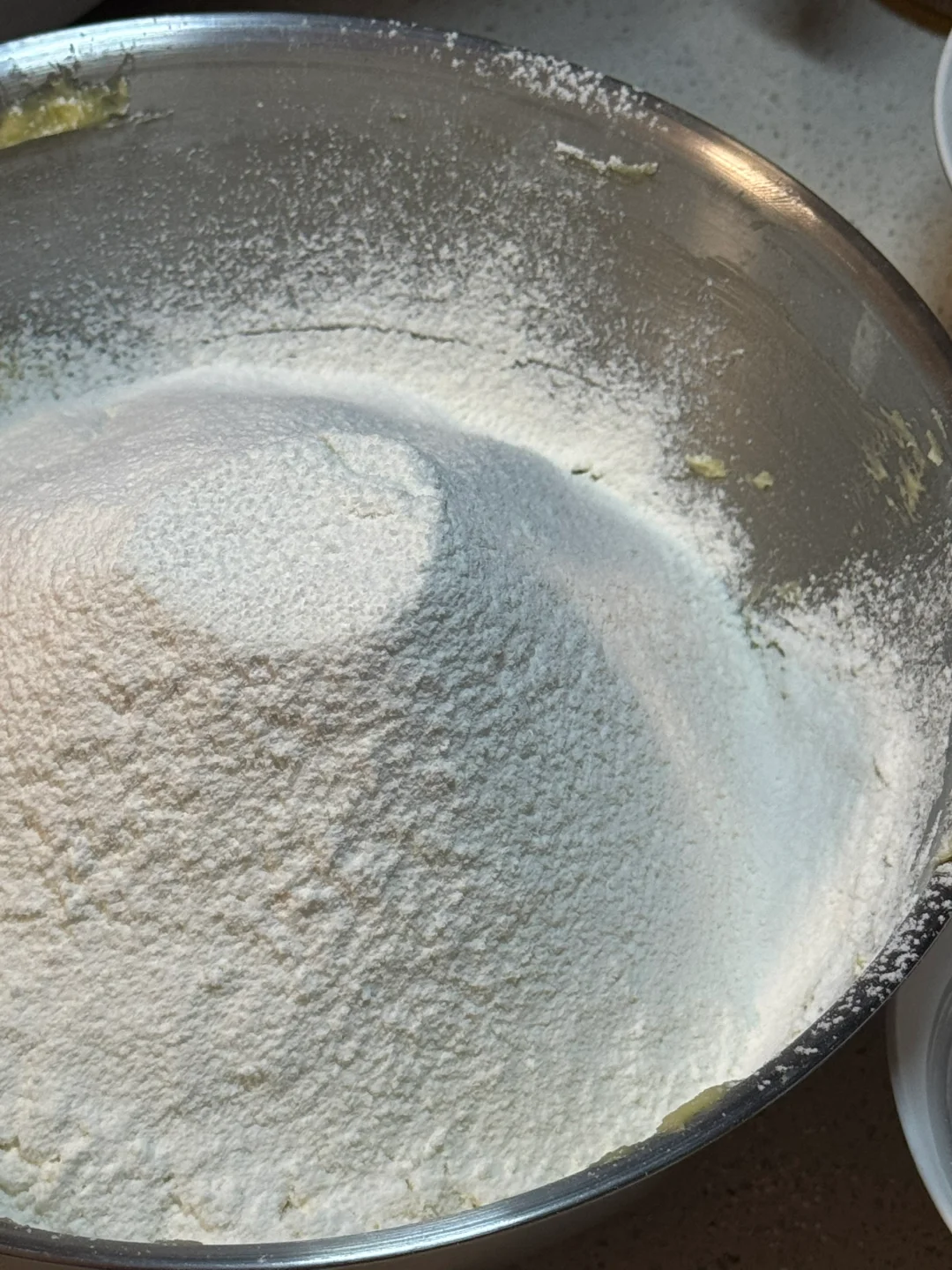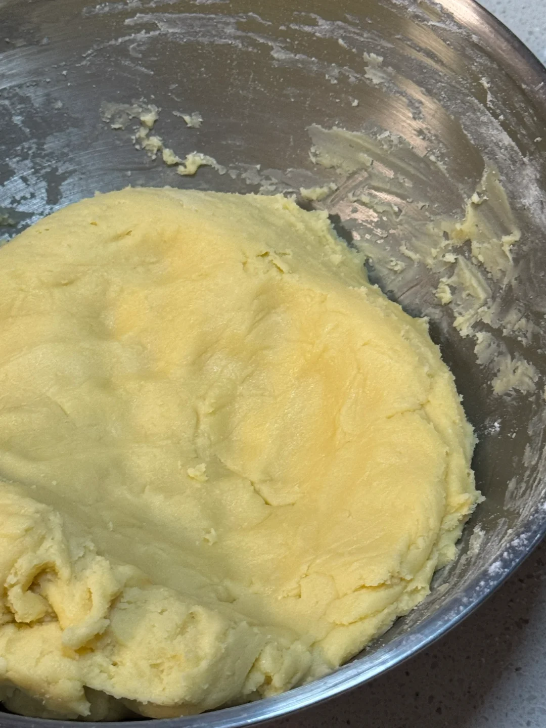 3.筛入低粉,先用刮刀大致翻拌至无干粉,再用手混合成团。