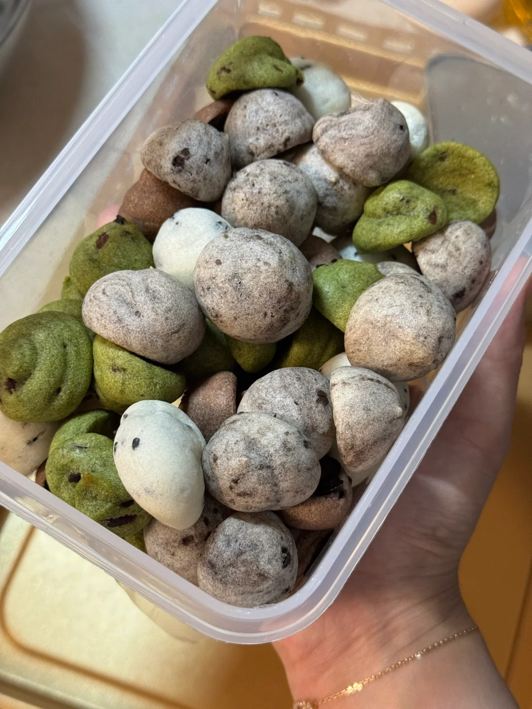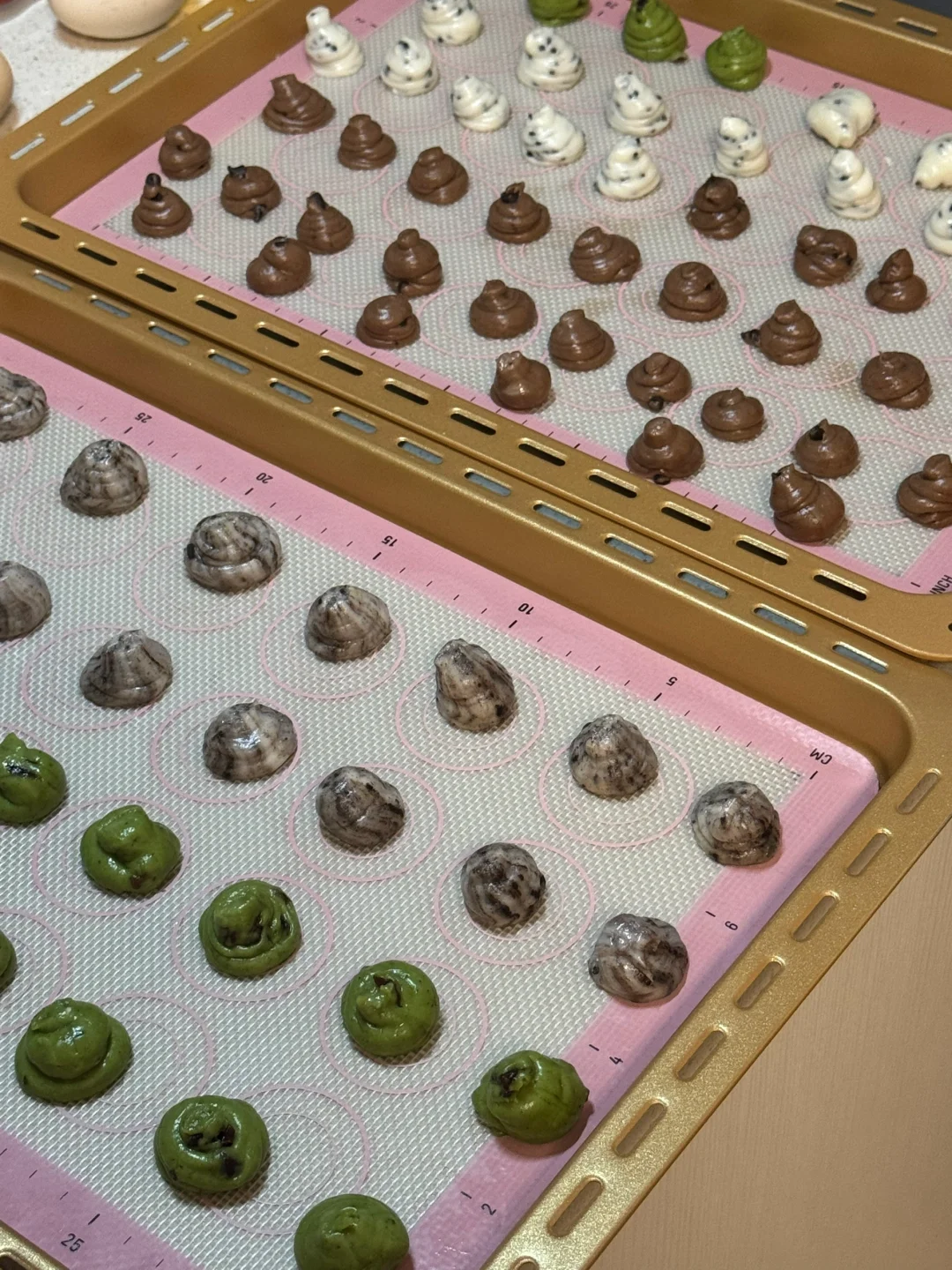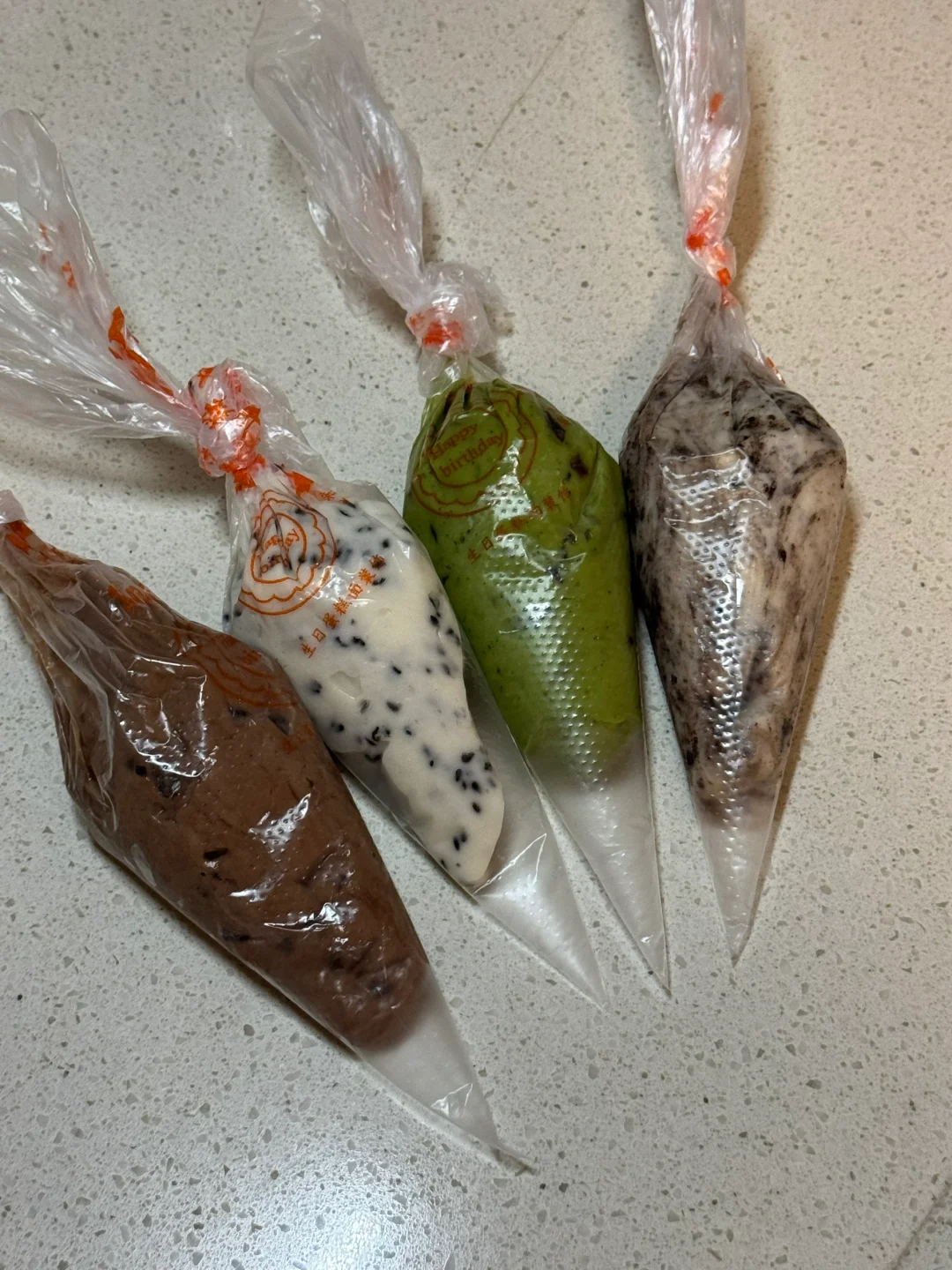 🌷食材: 麻薯预拌粉200g 水133g 全蛋液20g 玉米油50g 🌷做法: 1.预拌粉中加入水、玉米油、鸡蛋液先搅拌至无干粉,再用打蛋器搅打3分钟左右,戴手套揉至光滑(戴手套就不会粘) 2.均分成4份(每一份大概100g) 3.分别加入抹茶粉1.5g,蔓越莓干10g,可可粉2.5g,耐高温巧克力豆10g,奥利奥碎6g,翻拌均匀,装入裱花袋,均匀的挤在烤盘上。 4.烤箱提前预热,165度烘烤25分钟。 🌷刚出炉外酥里糯,放一晚也好好吃,超级糯叽叽,姐妹们一定要去试试[赞R][赞R][赞R]