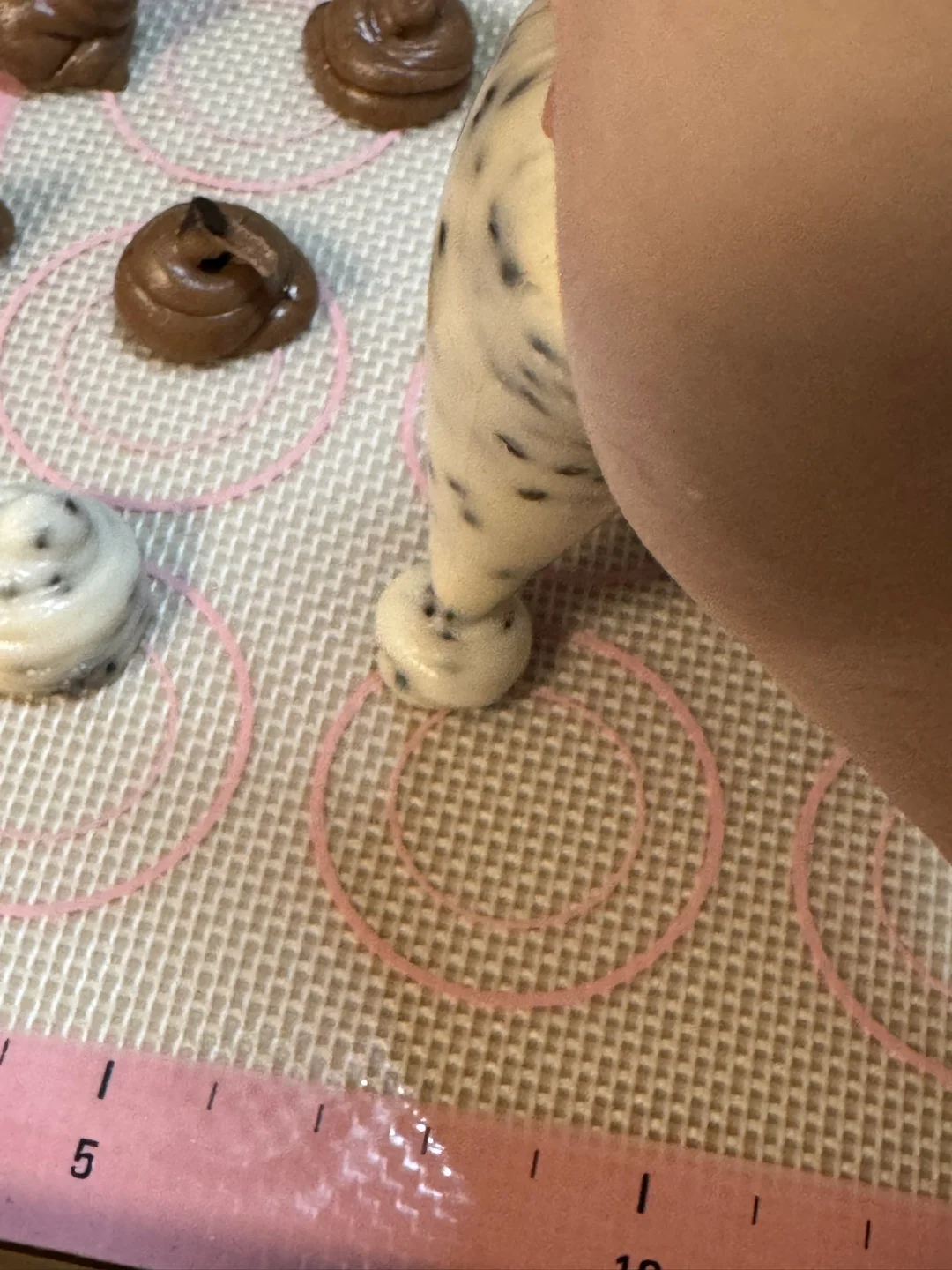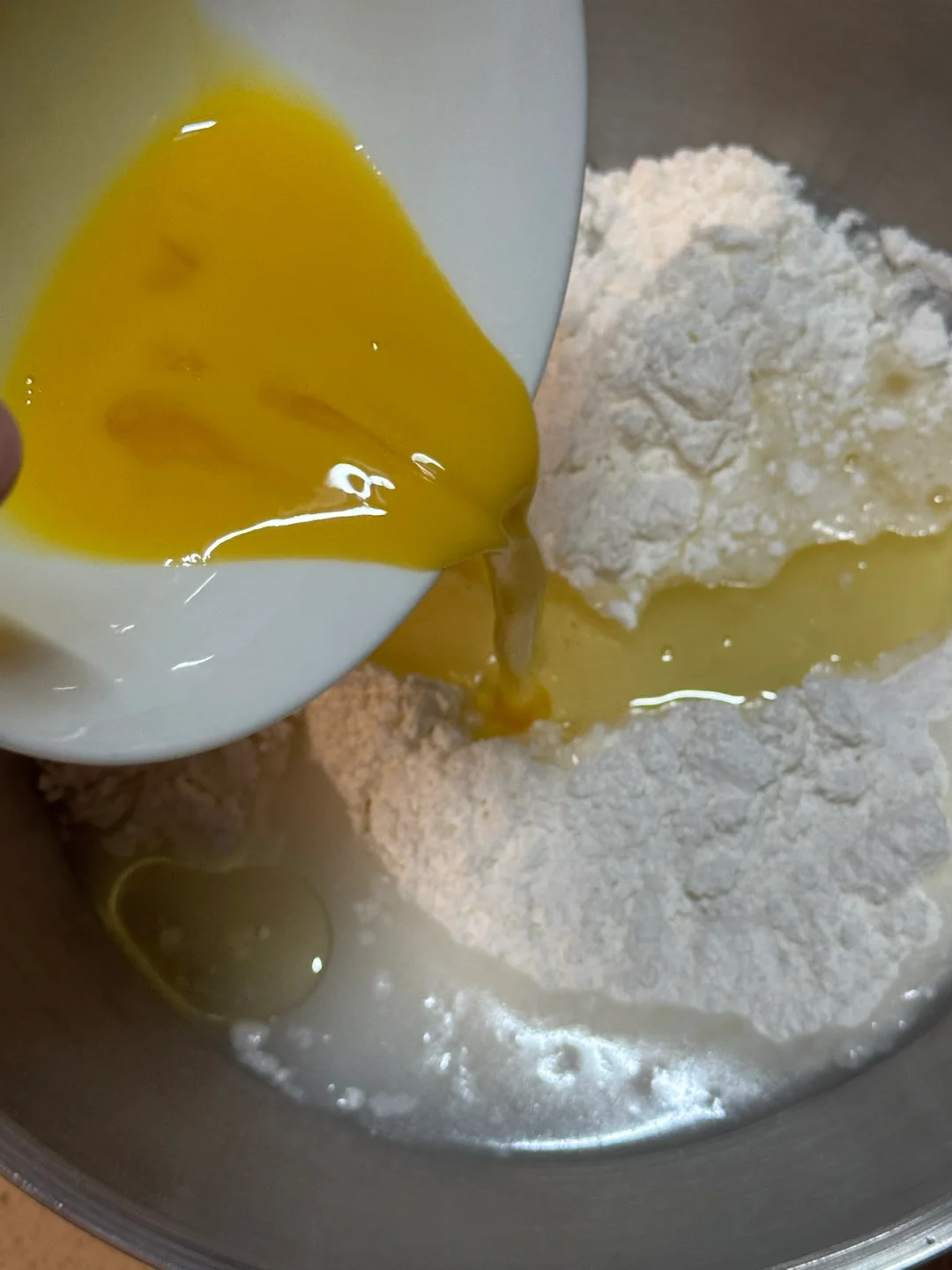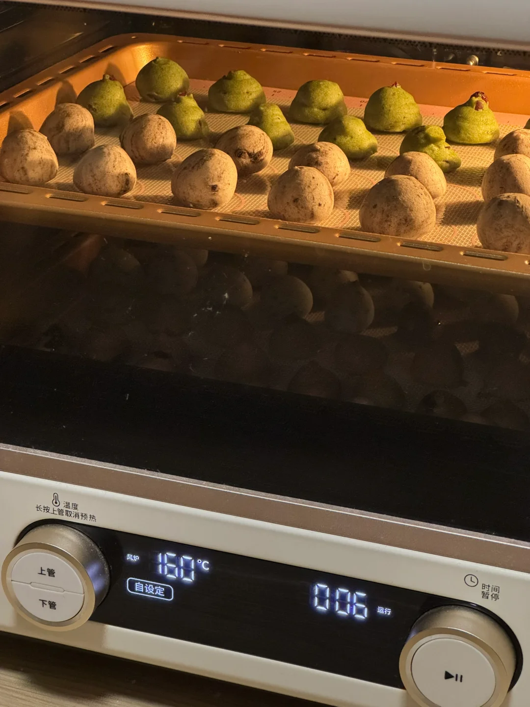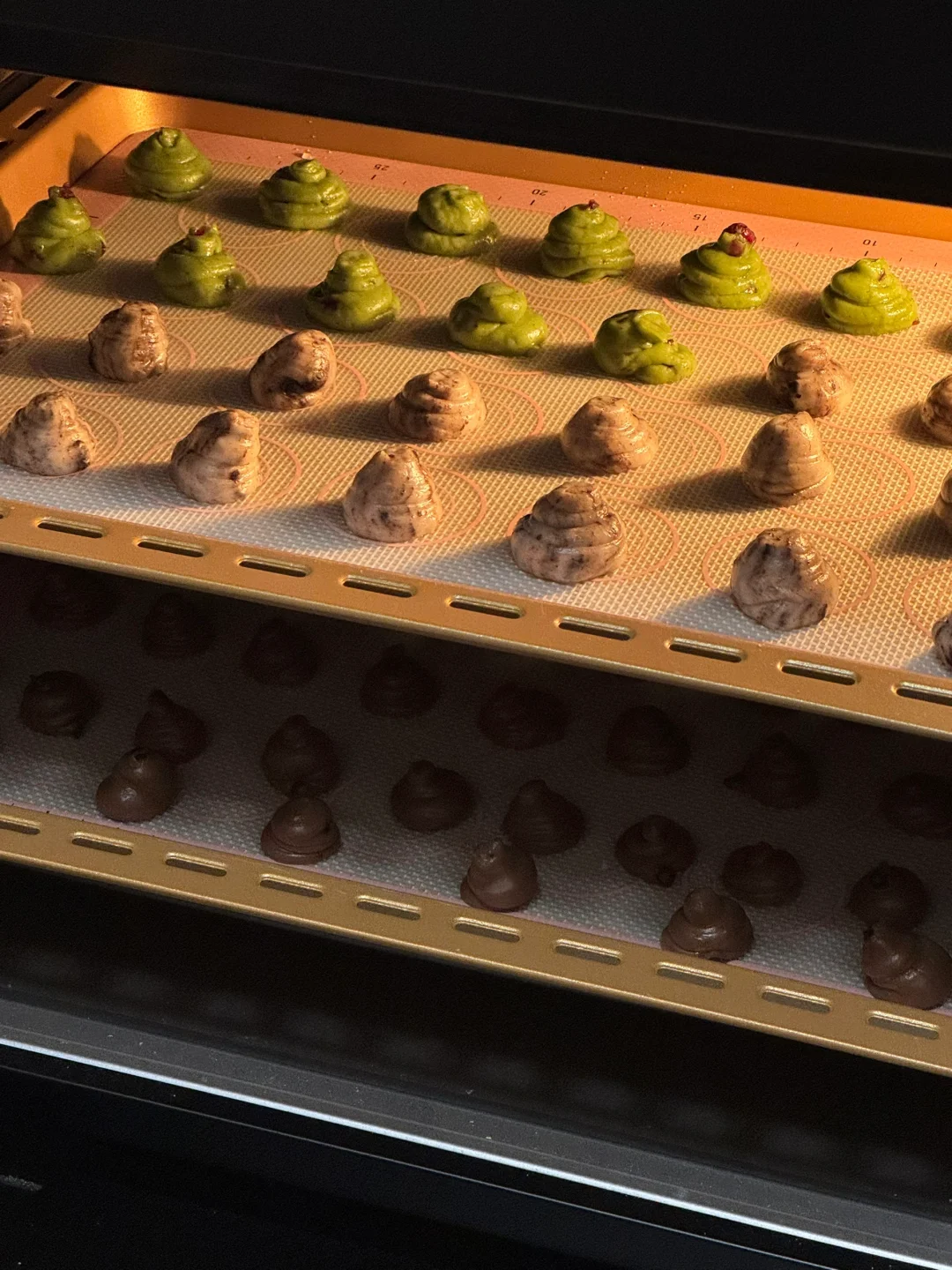 🌷食材: 麻薯预拌粉200g 水133g 全蛋液20g 玉米油50g 🌷做法: 1.预拌粉中加入水、玉米油、鸡蛋液先搅拌至无干粉,再用打蛋器搅打3分钟左右,戴手套揉至光滑(戴手套就不会粘) 2.均分成4份(每一份大概100g) 3.分别加入抹茶粉1.5g,蔓越莓干10g,可可粉2.5g,耐高温巧克力豆10g,奥利奥碎6g,翻拌均匀,装入裱花袋,均匀的挤在烤盘上。 4.烤箱提前预热,165度烘烤25分钟。 🌷刚出炉外酥里糯,放一晚也好好吃,超级糯叽叽,姐妹们一定要去试试[赞R][赞R][赞R]