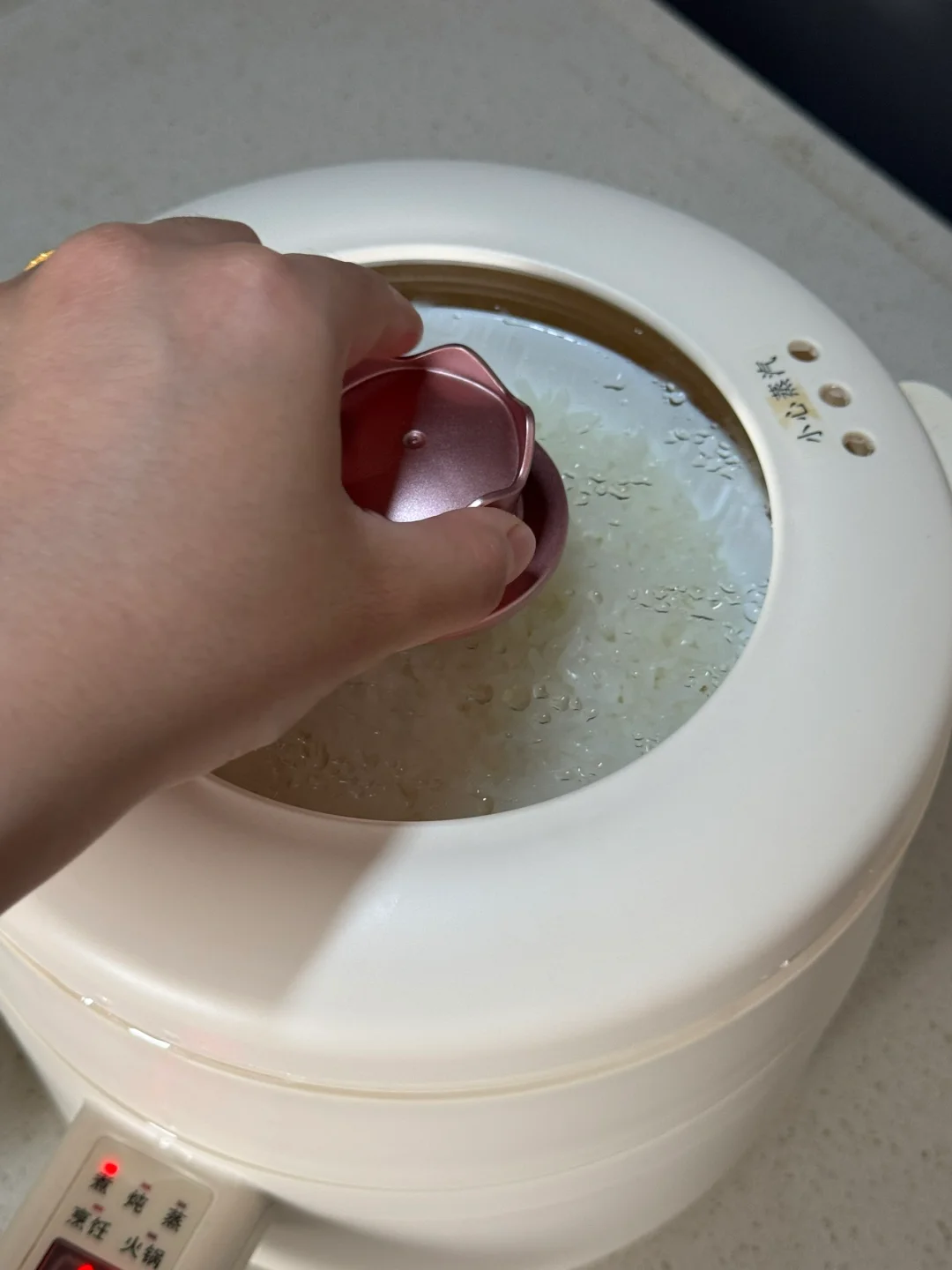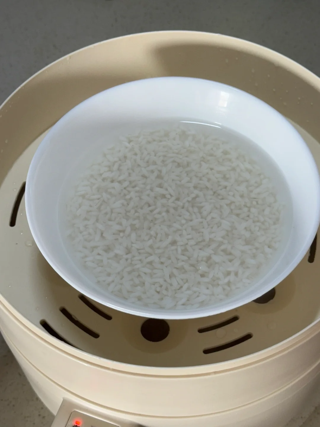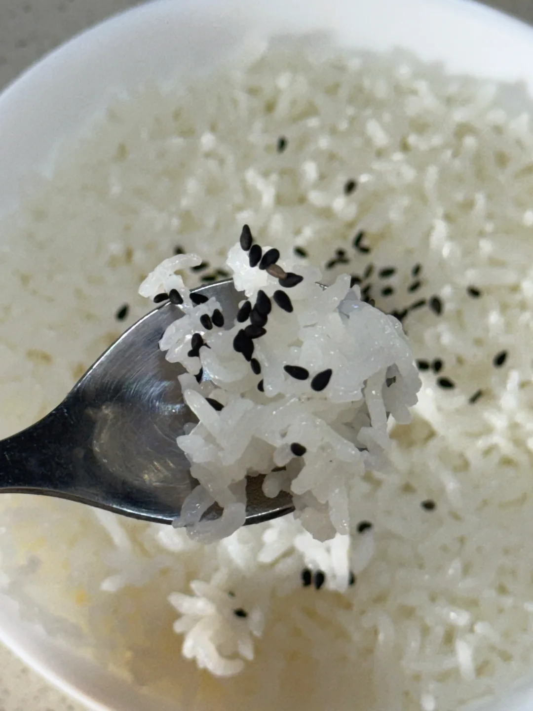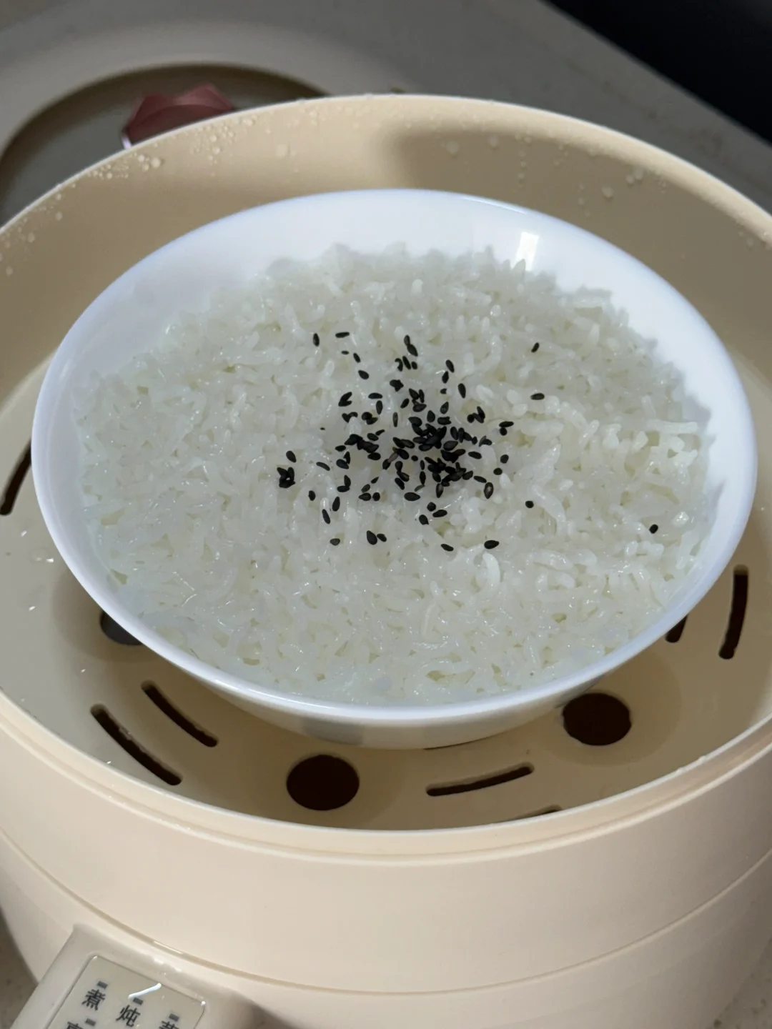 🌷食材: 大米 水 黑芝麻 🌷做法: 1.半碗米提前泡半个小时。 2.洗净加水(水没过一个指甲的高度) 3.水开后,盖盖开始蒸,大概蒸25分钟左右(具体时间根据状态来看哦) 4.香喷喷的米饭就熟啦!!!可以撒些黑的熟芝麻点缀一下,这样做不用担心糊底,米饭软硬刚刚合适。