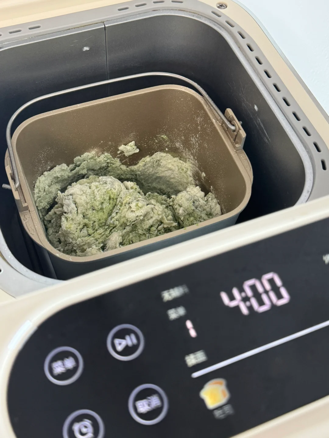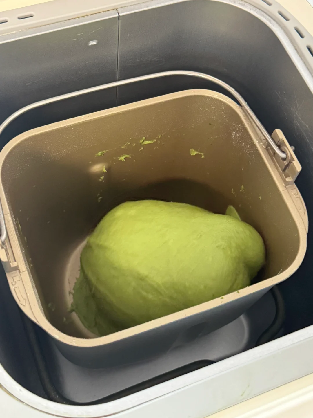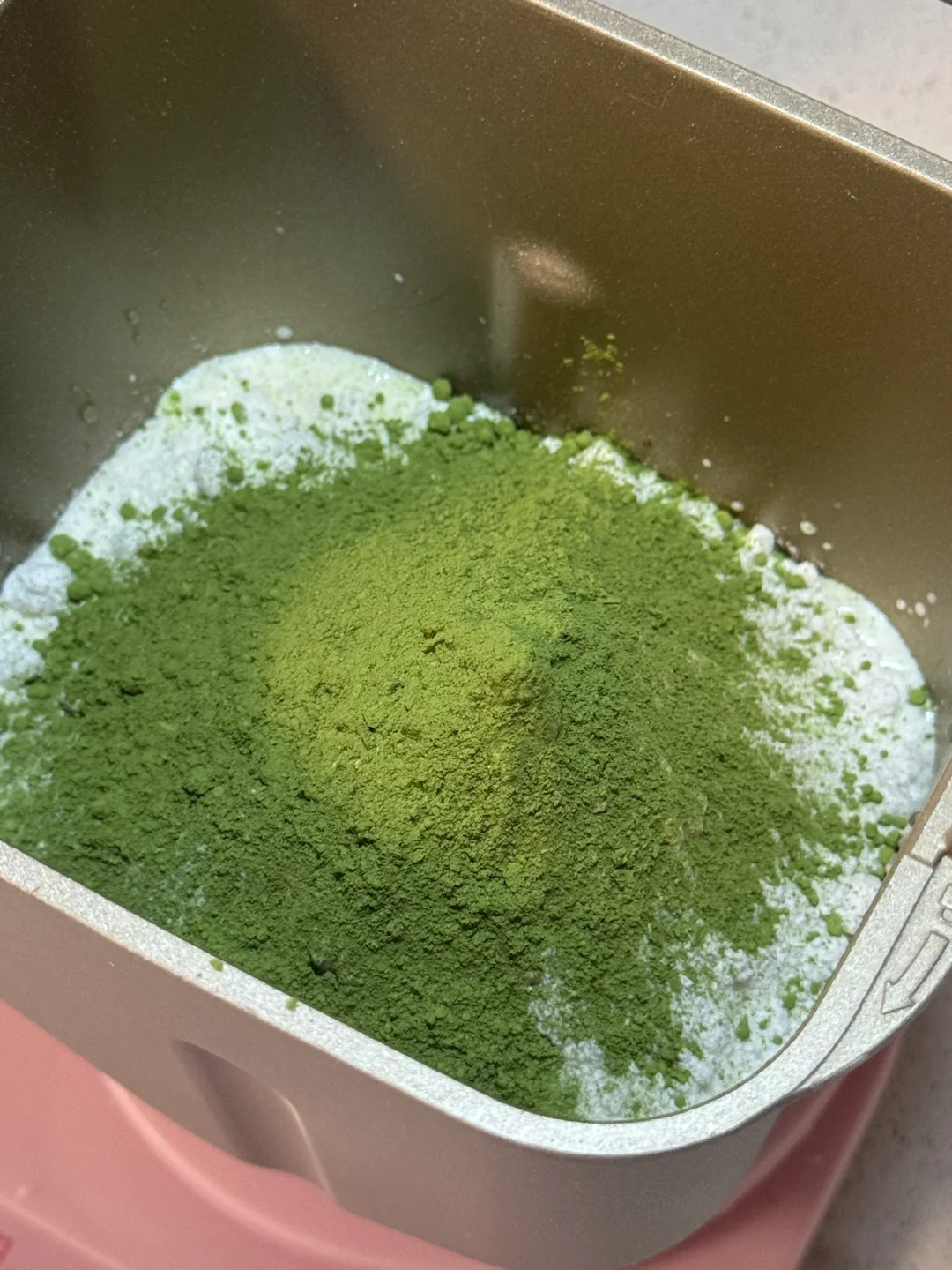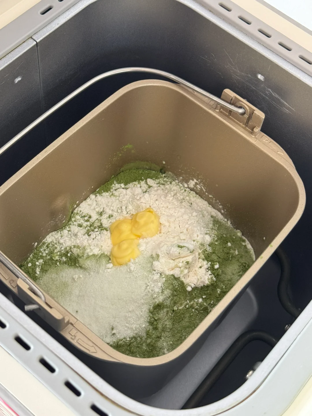 面包桶里先倒入液体部分(淡奶油、炼乳、清水)再加入高筋面粉、抹茶粉、细砂糖、盐、黄油(一锅放就行)进面包机,将酵母投进投机盒中,选择菜单1吐司模式4小时,五十铃的抹茶粉颜色好好看!!!