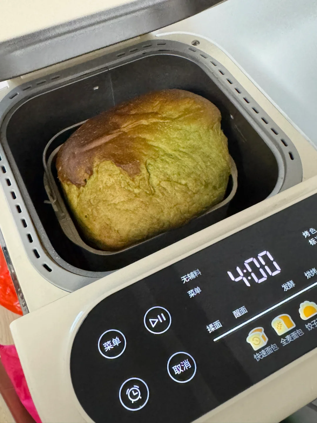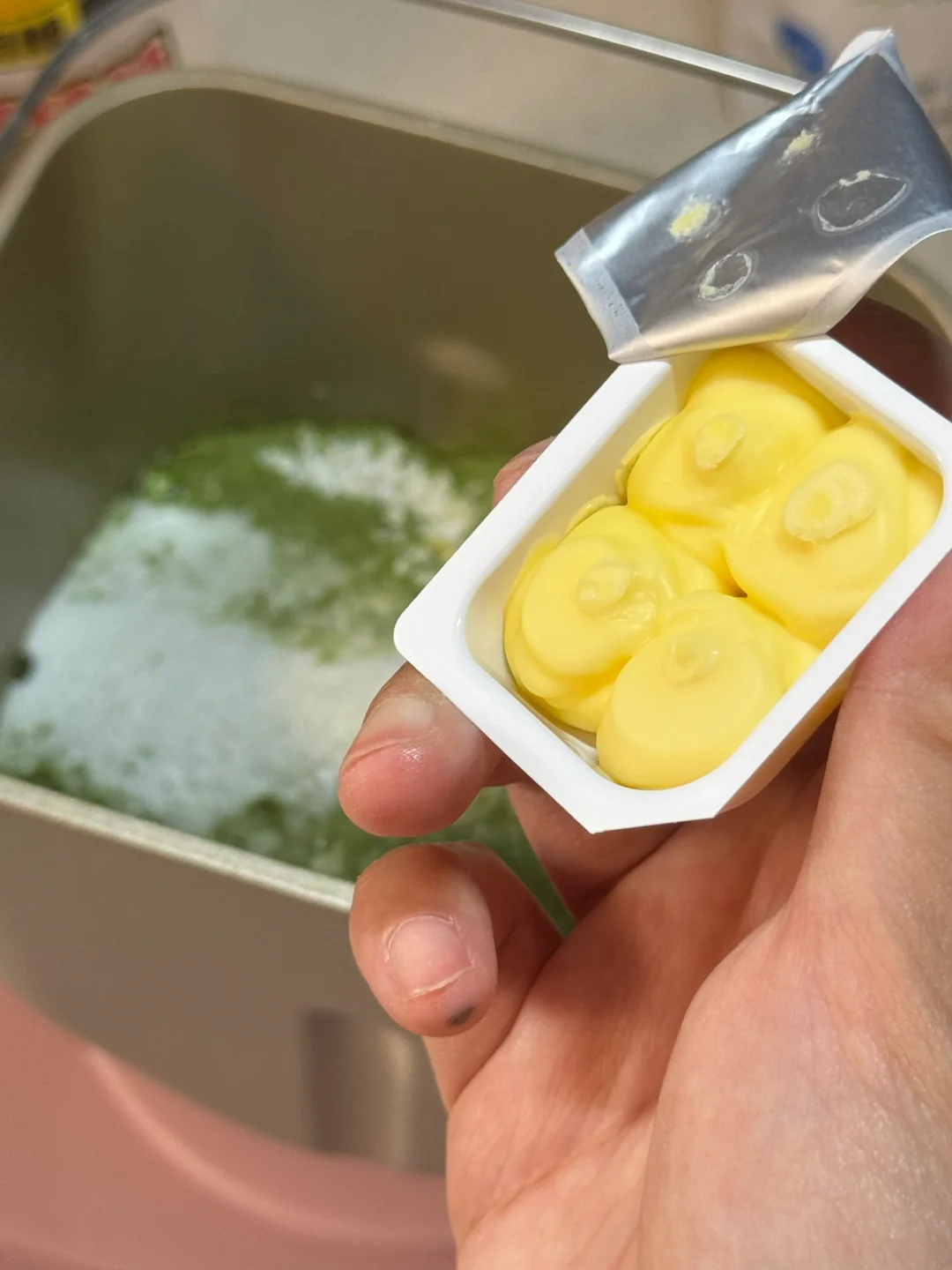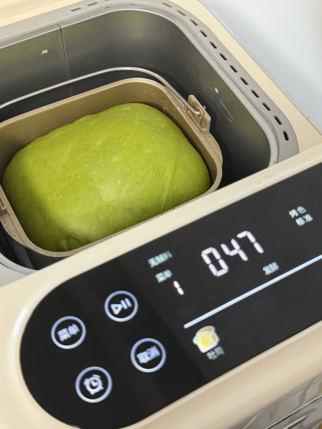 面包桶里先倒入液体部分(淡奶油、炼乳、清水)再加入高筋面粉、抹茶粉、细砂糖、盐、黄油(一锅放就行)进面包机,将酵母投进投机盒中,选择菜单1吐司模式4小时,五十铃的抹茶粉颜色好好看!!!