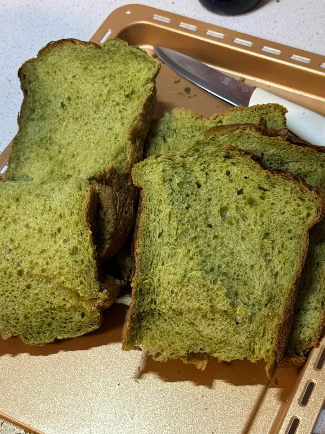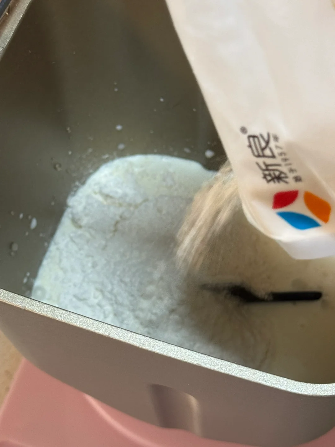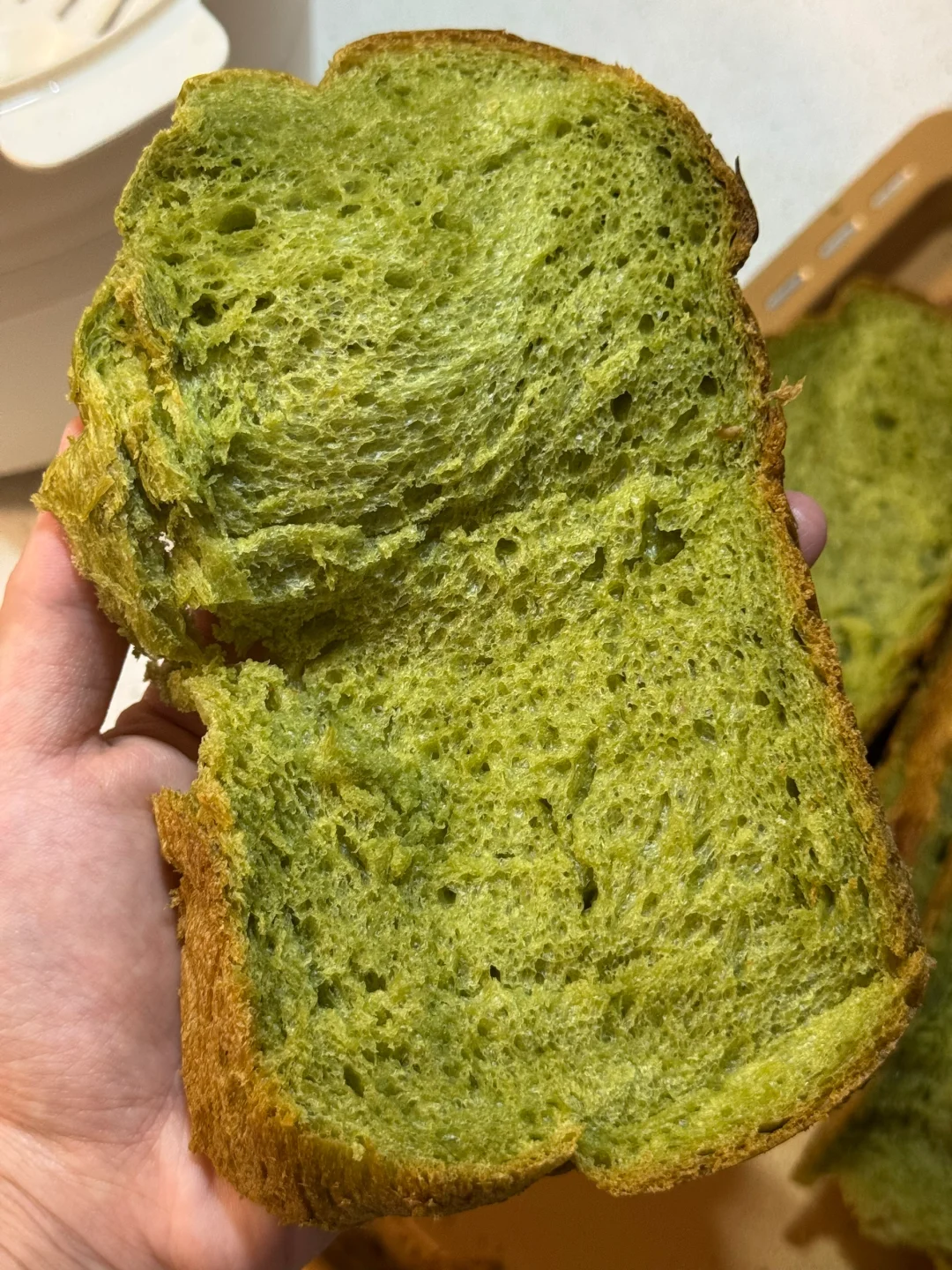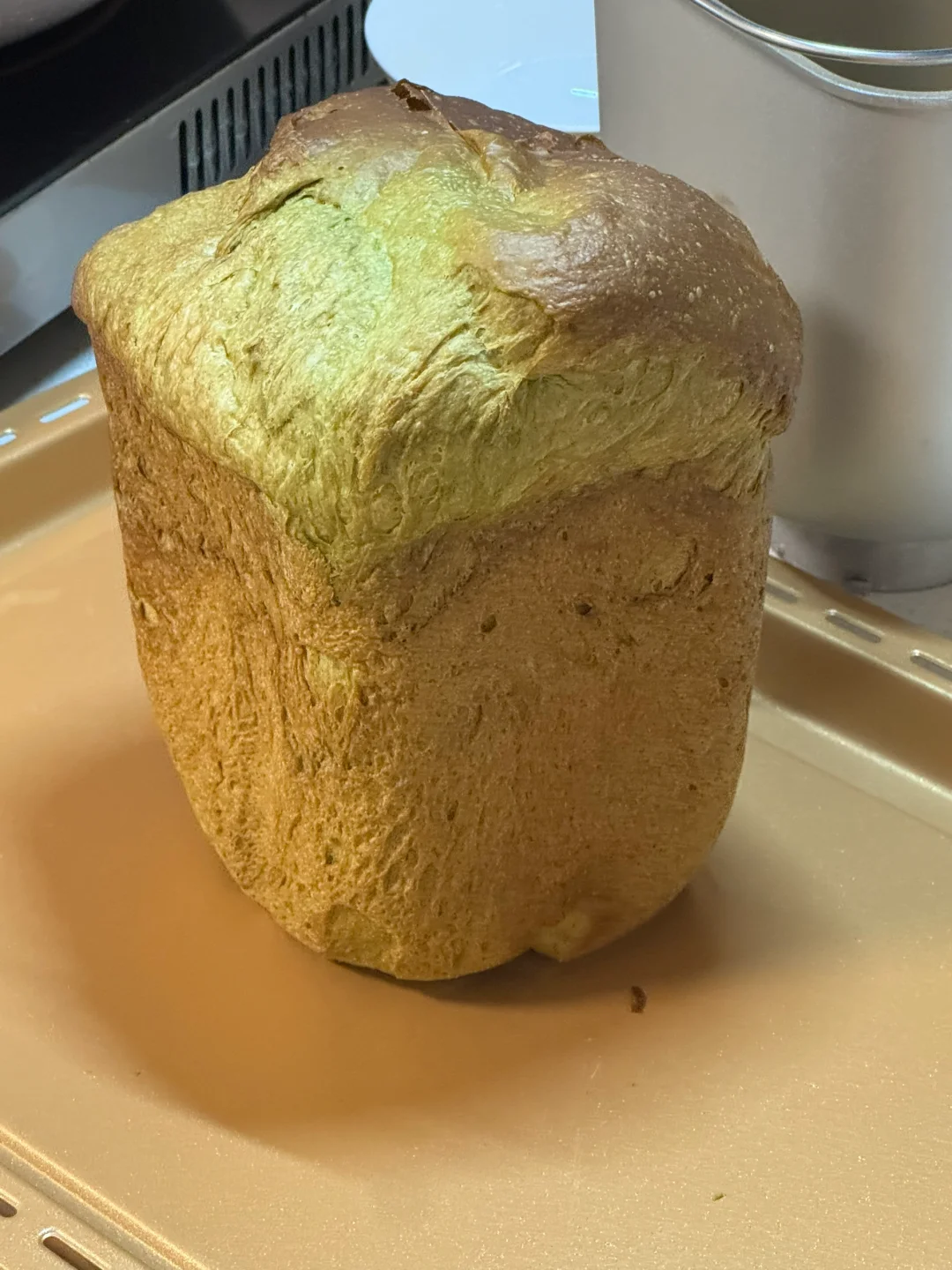 面包桶里先倒入液体部分(淡奶油、炼乳、清水)再加入高筋面粉、抹茶粉、细砂糖、盐、黄油(一锅放就行)进面包机,将酵母投进投机盒中,选择菜单1吐司模式4小时,五十铃的抹茶粉颜色好好看!!!