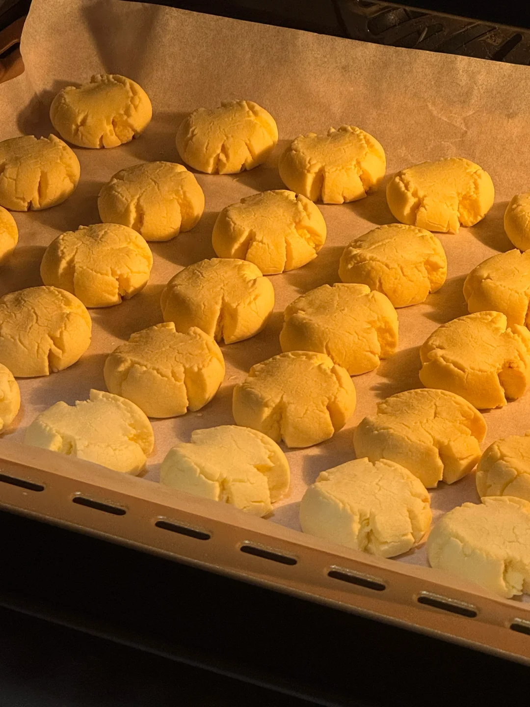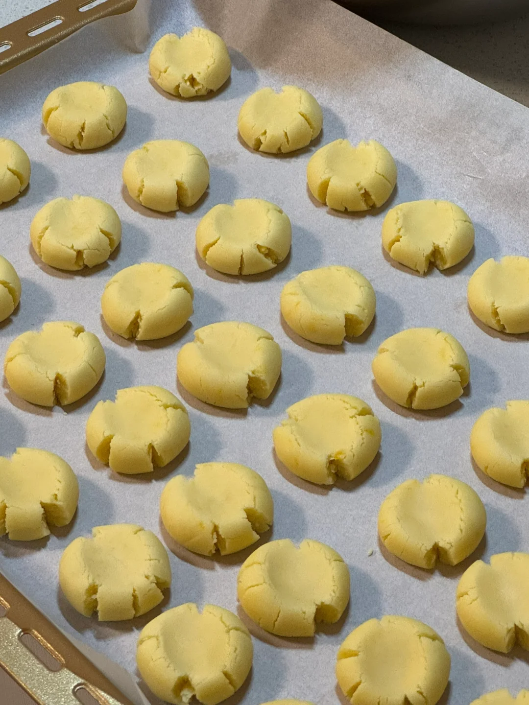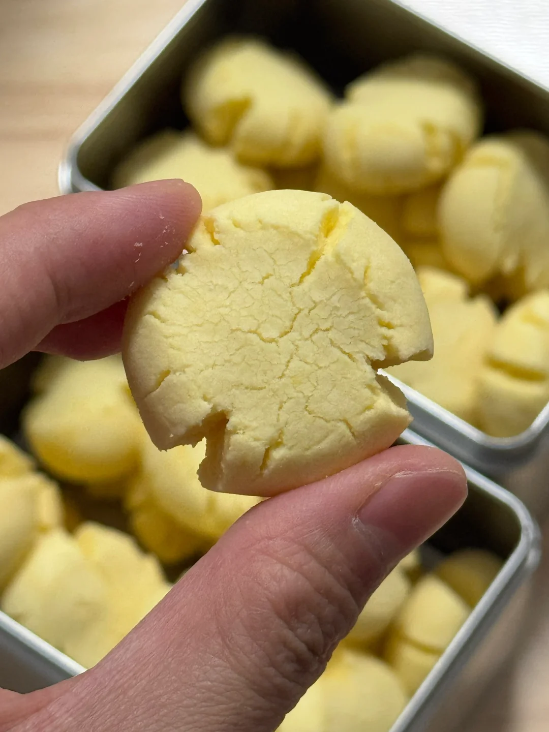 🌷食材: 黄油100g 糖粉50g 熟蛋黄2个 低筋面粉100g 玉米淀粉100g 🌷做法: 1.黄油提前软化,加入糖粉混合均匀。 2.再用打蛋器打发至蓬松发白。 3.过筛两个蛋黄混合均匀。 4.再筛入低筋面粉、玉米淀粉,切拌成絮状,再下手抓成团(不要过度揉,防止起筋) 5.均分成10g一个的小剂子,揉成球,放入烤盘,再用手指按压一下,烤箱提前预热,160度烘烤20分钟。 🌷满屋飘香,出炉后晾凉密封起来,奶香味十足,入口即化,大人小孩都爱吃[哇R][哇R][哇R]