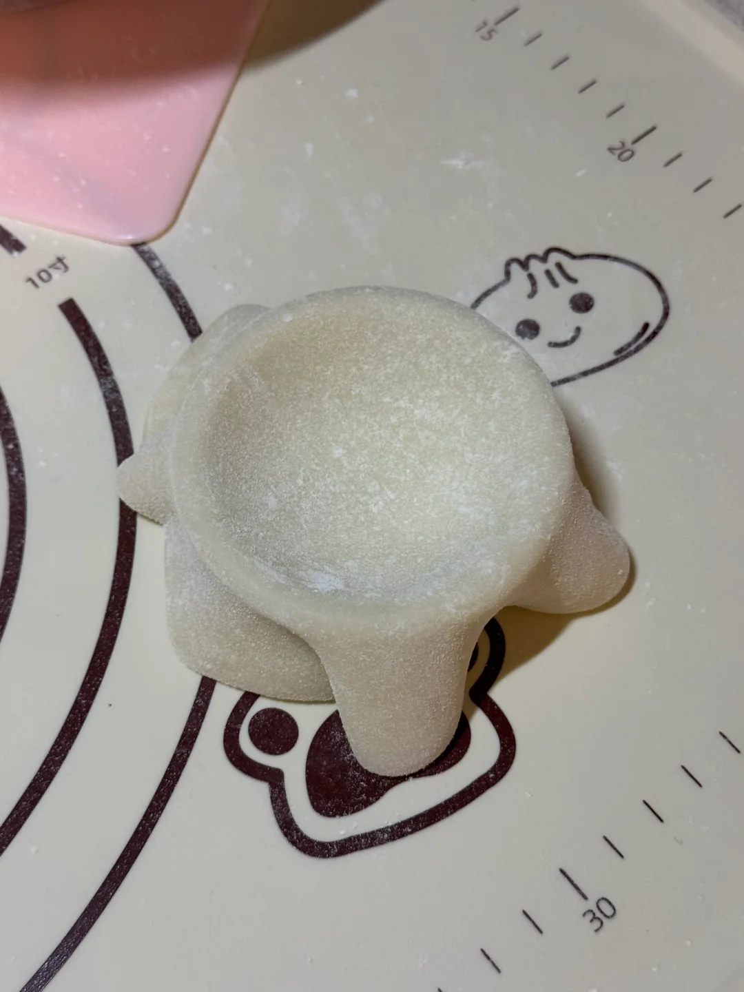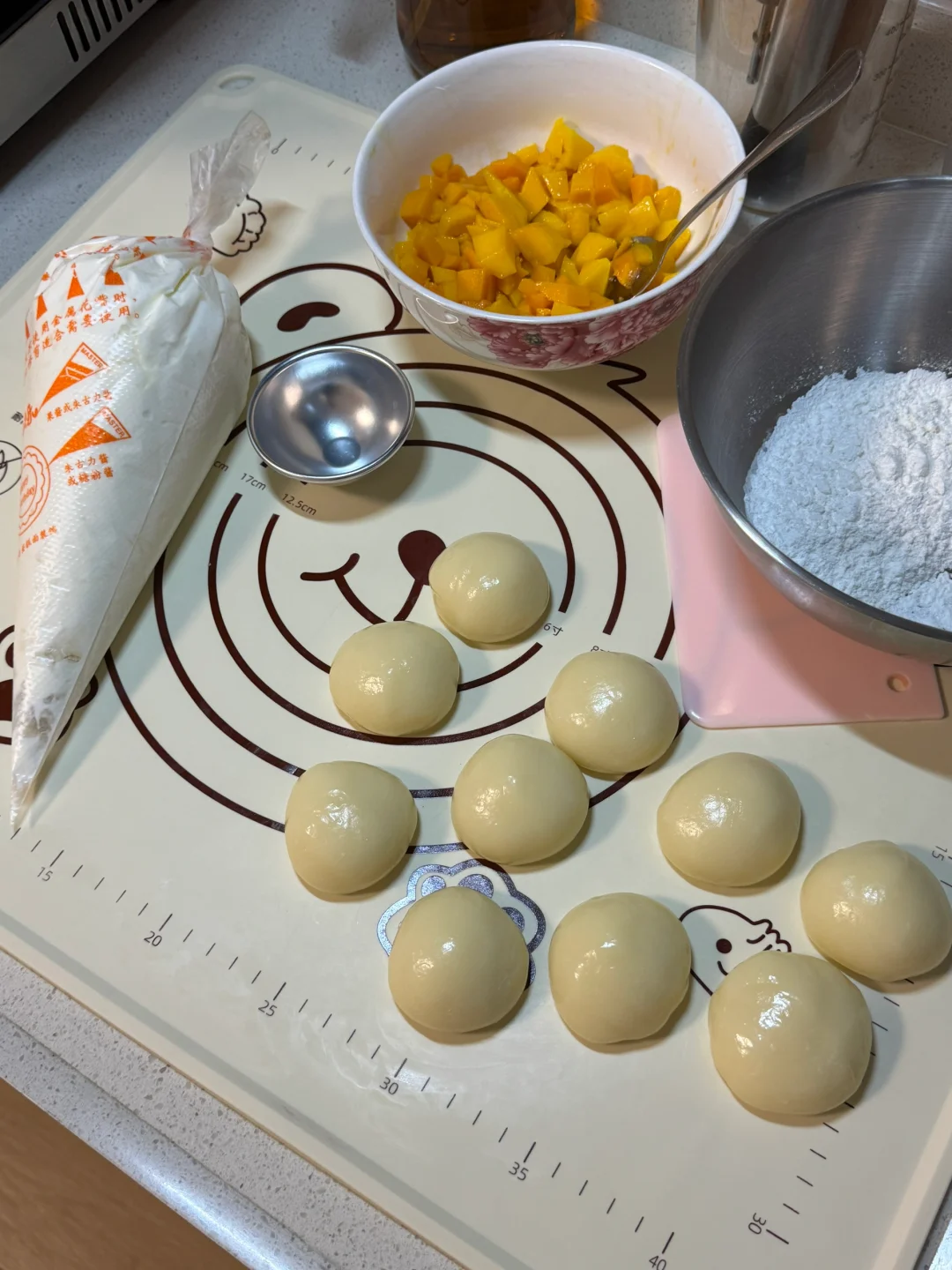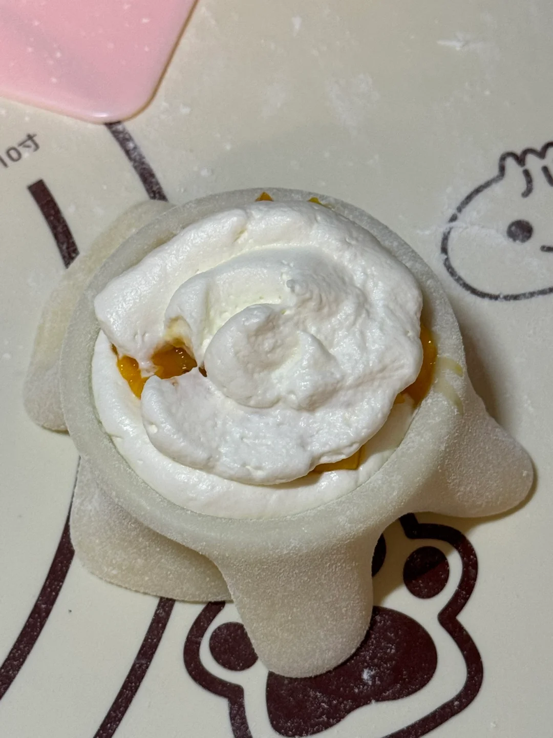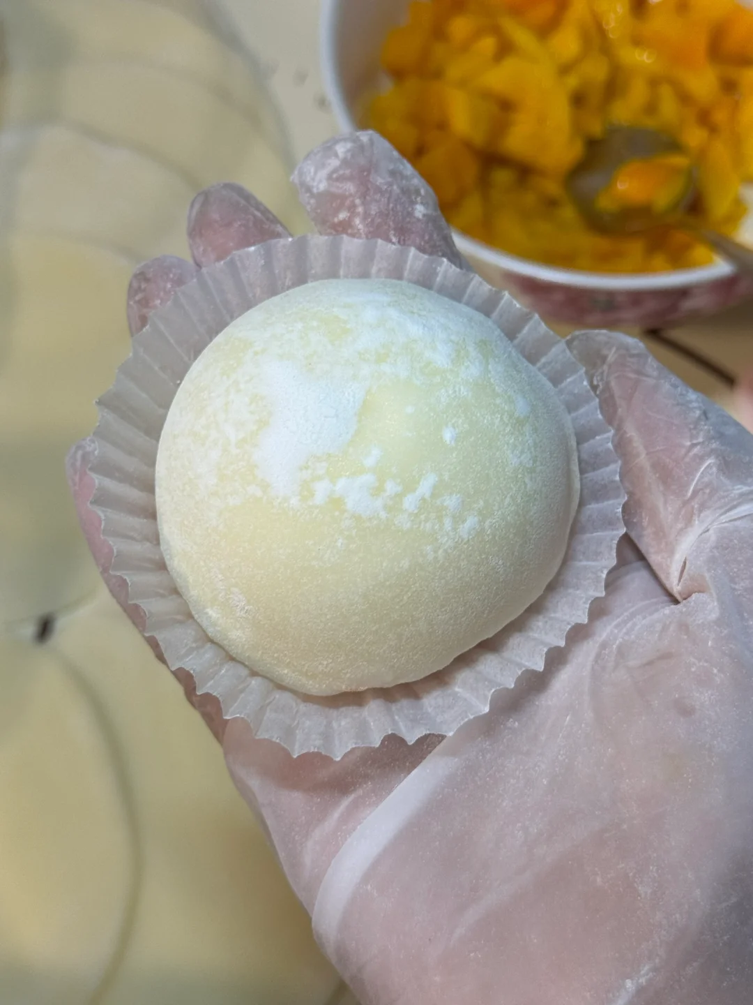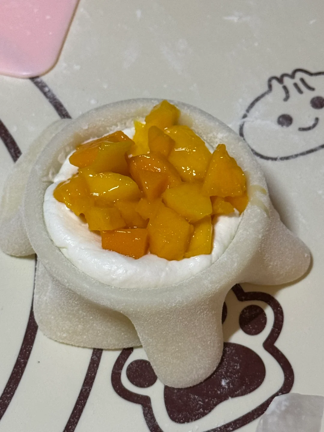 6.擀好的面皮放入模具中,挤上奶油、放入芒果,包包子一样包住,多余的用剪刀剪掉。做好的雪媚娘可以放冰箱冷藏一小时后再享用,口感会更好哦!