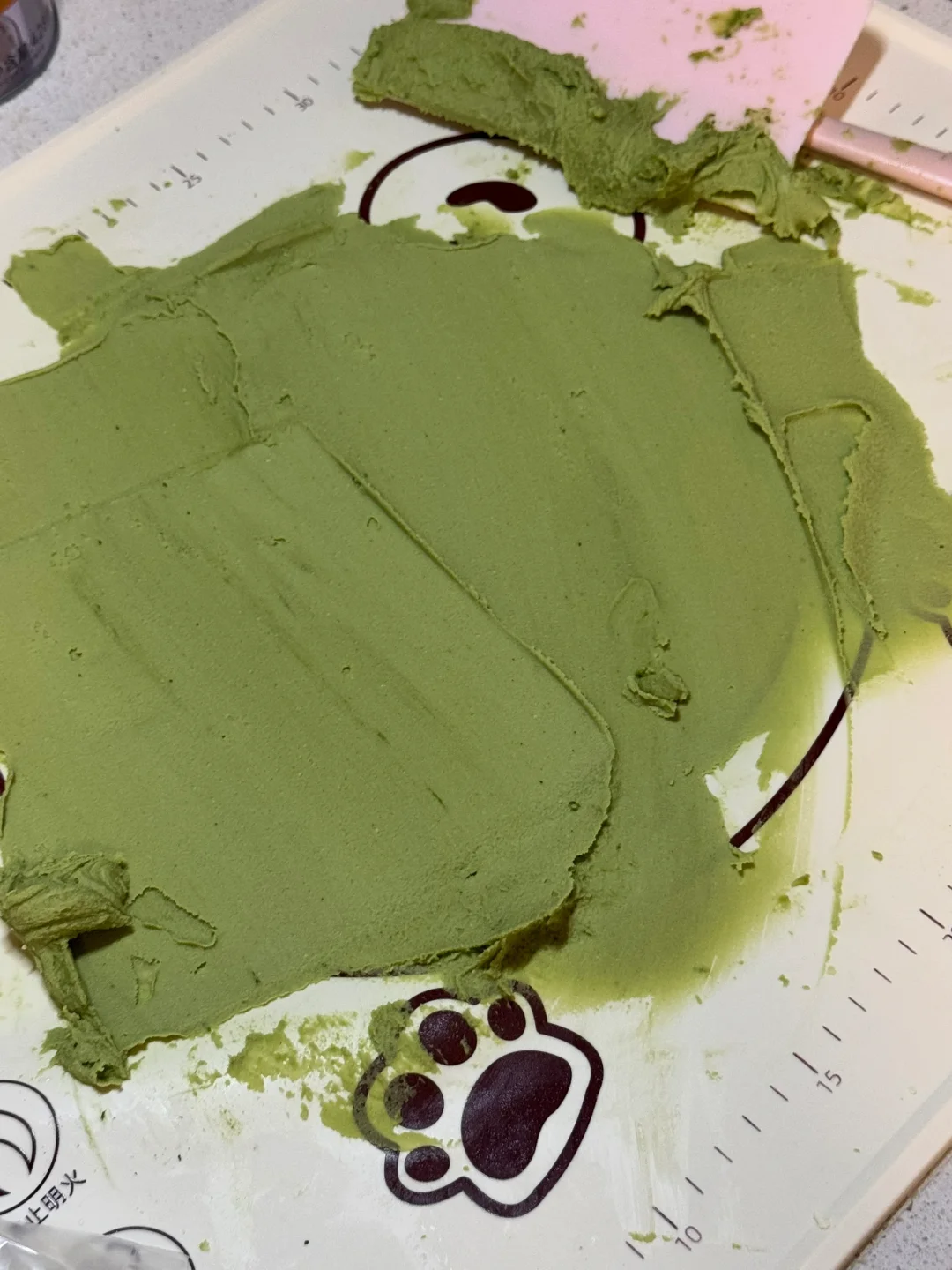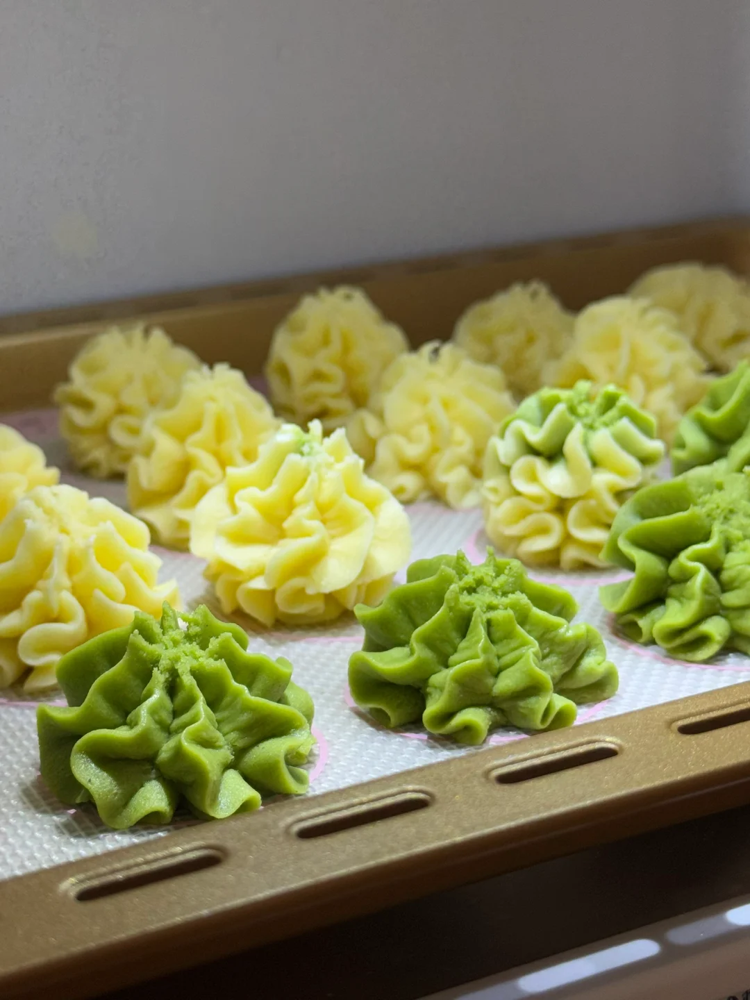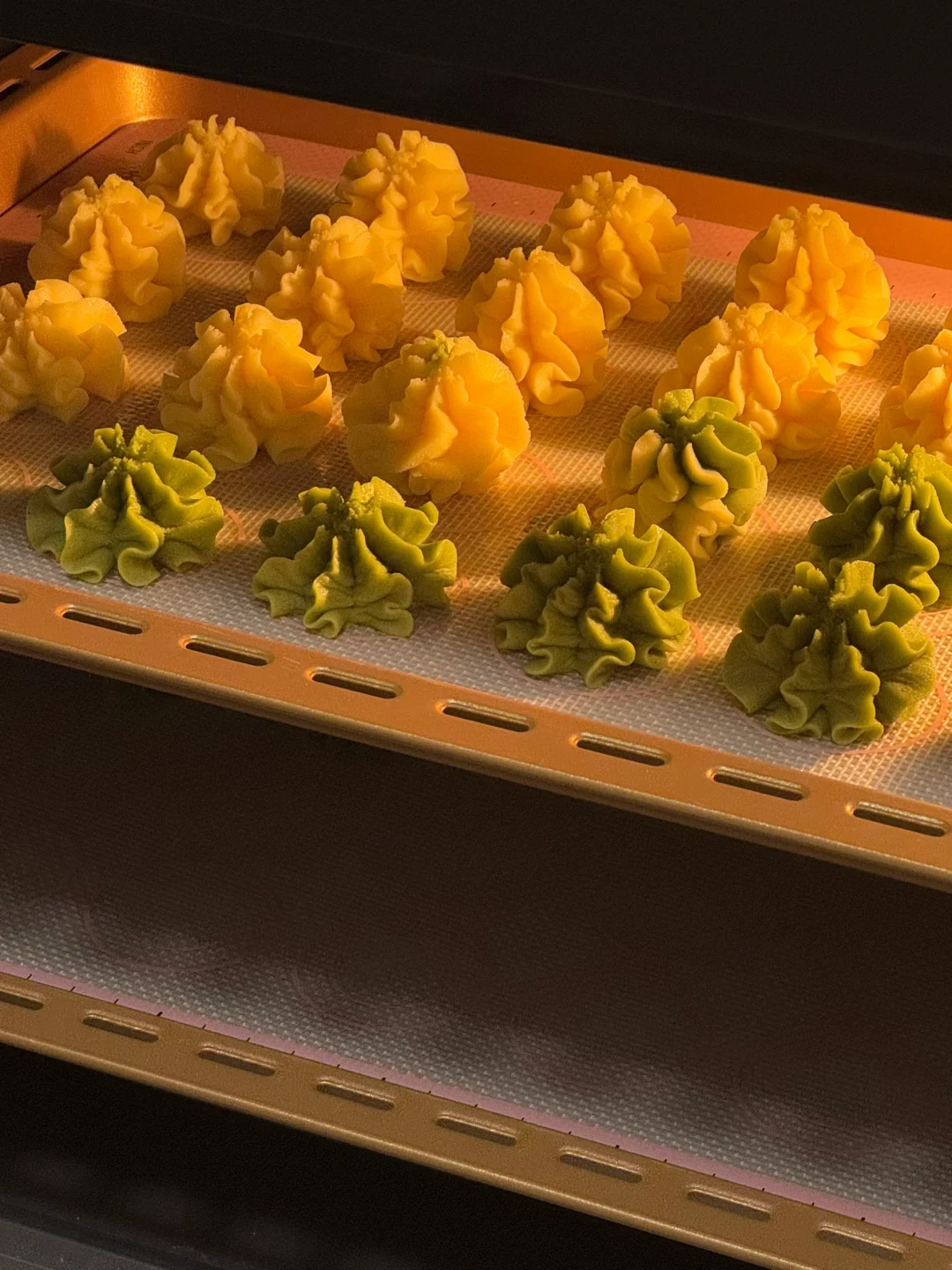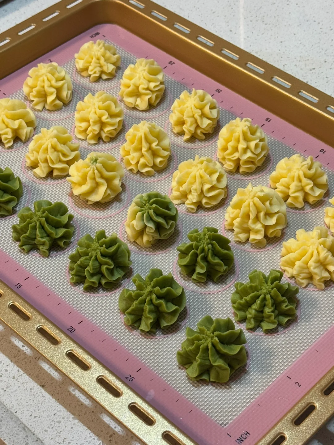 4.把面糊装入裱花袋,另一份加入抹茶粉3g,也是用刮刀反复刮细腻,刮掉裱花袋多余气泡,挤入烤盘(挤完放冰箱冷藏30分钟,烤完不会塌)