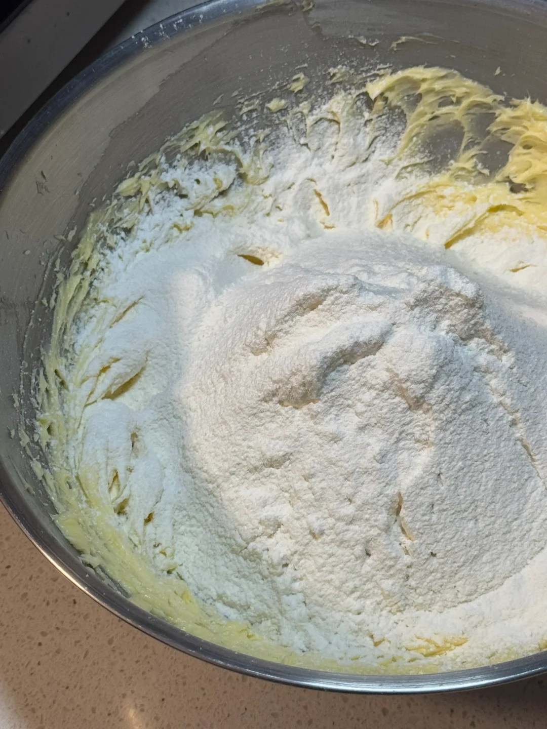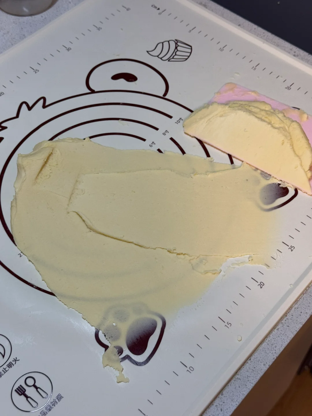 3.筛入低筋面粉、高筋面粉,玉米淀粉、奶粉、盐,用刮刀翻拌均匀,把面糊放在揉面垫上,用刮刀反复刮面糊。