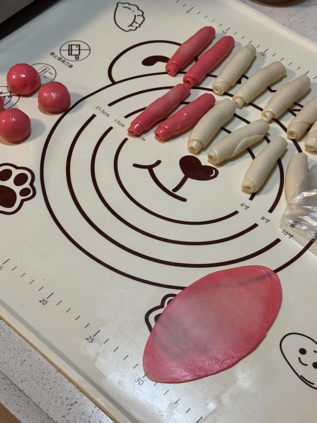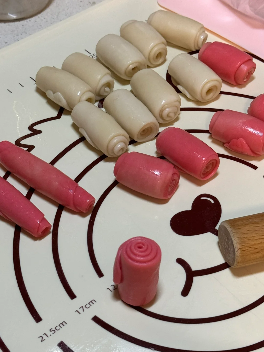 5.都完成后,进行第一次擀卷,把面团擀薄,擀的时候一定要轻一点,从上往下卷起,卷好后保鲜膜盖着防止风干,粉色的也一样,擀好之后松弛15分钟,再进行第二次擀卷,第二次的擀法跟第一次的一样,轻轻擀薄,都完成后,继续松弛15分钟。