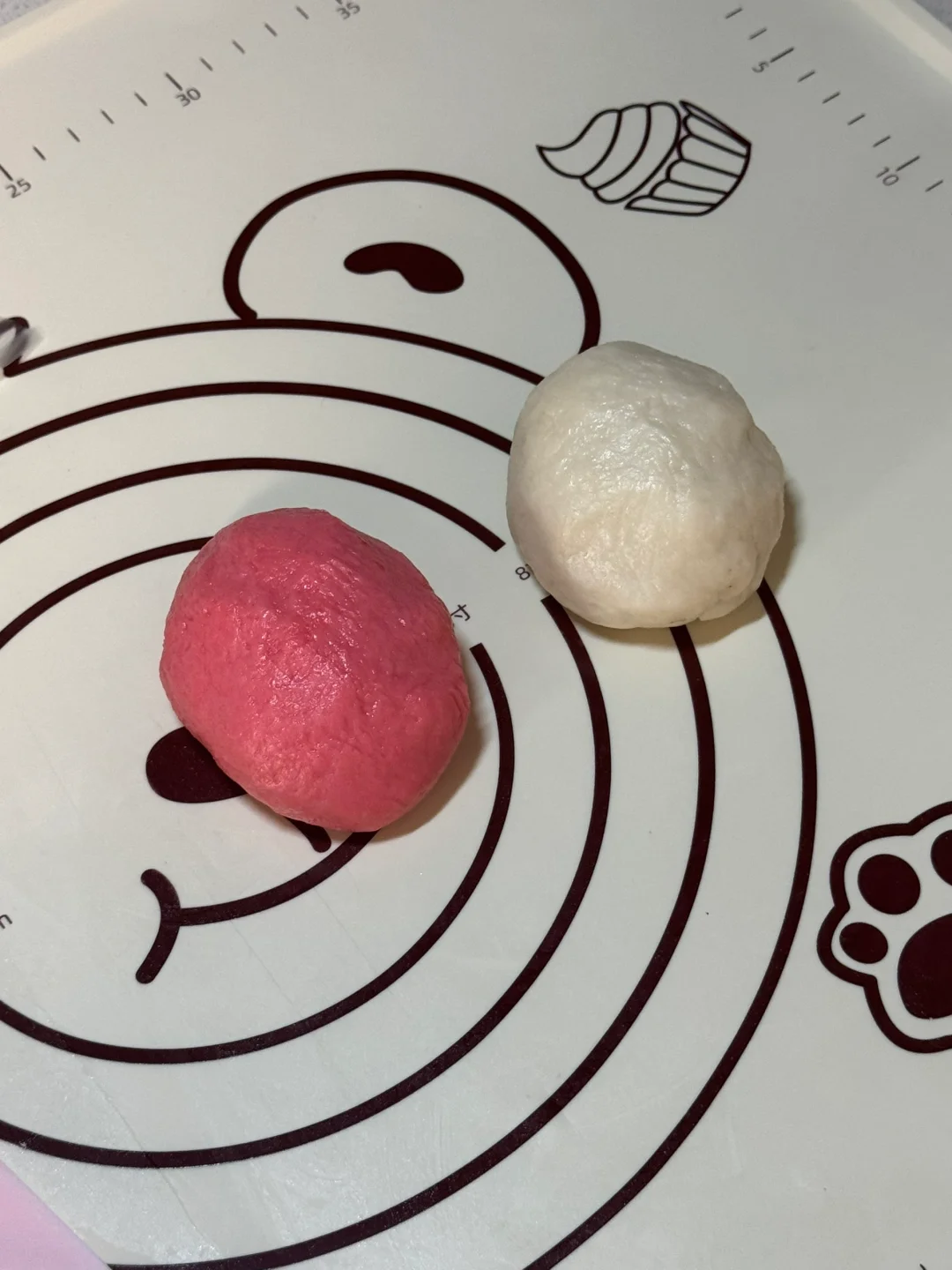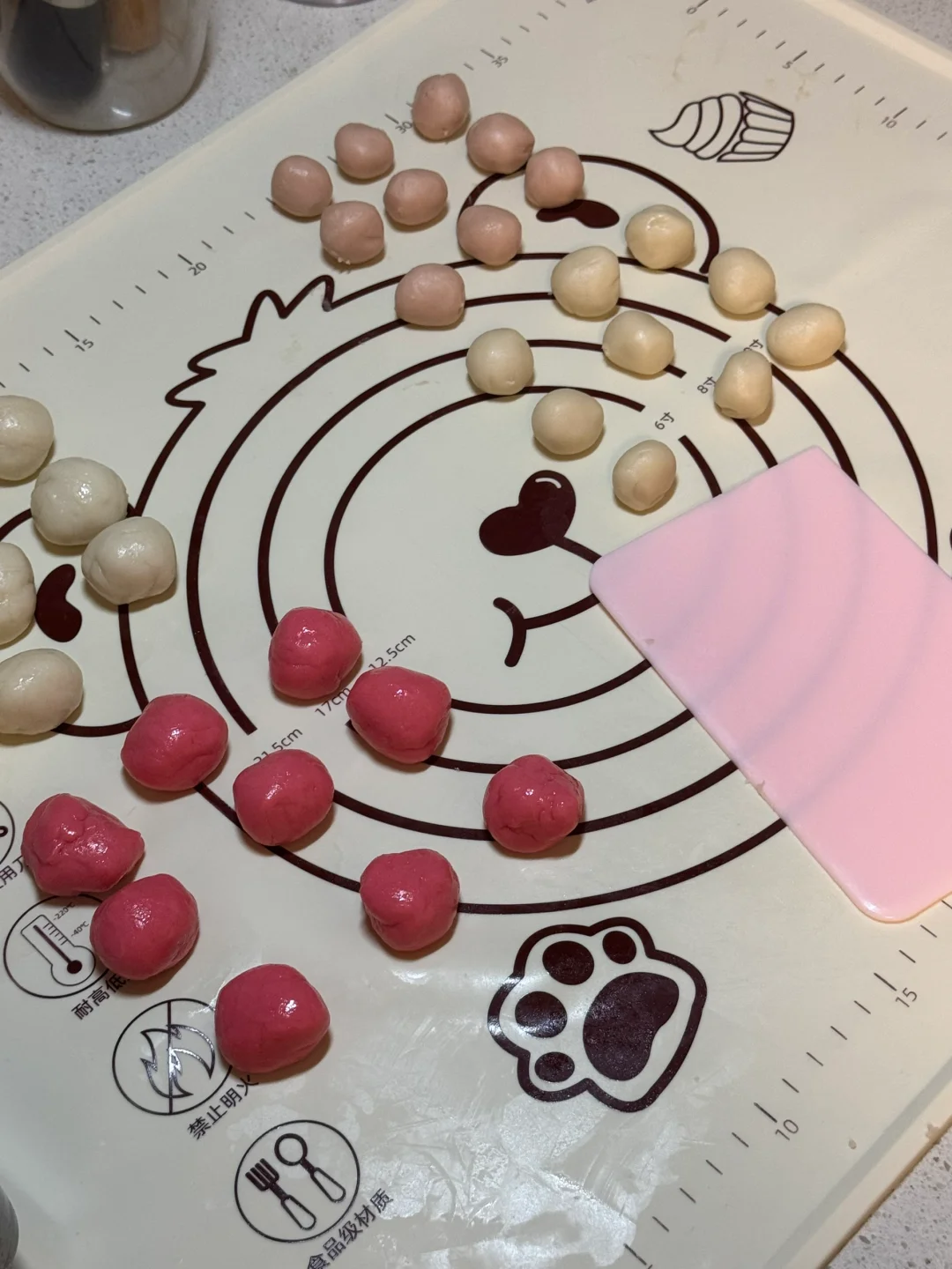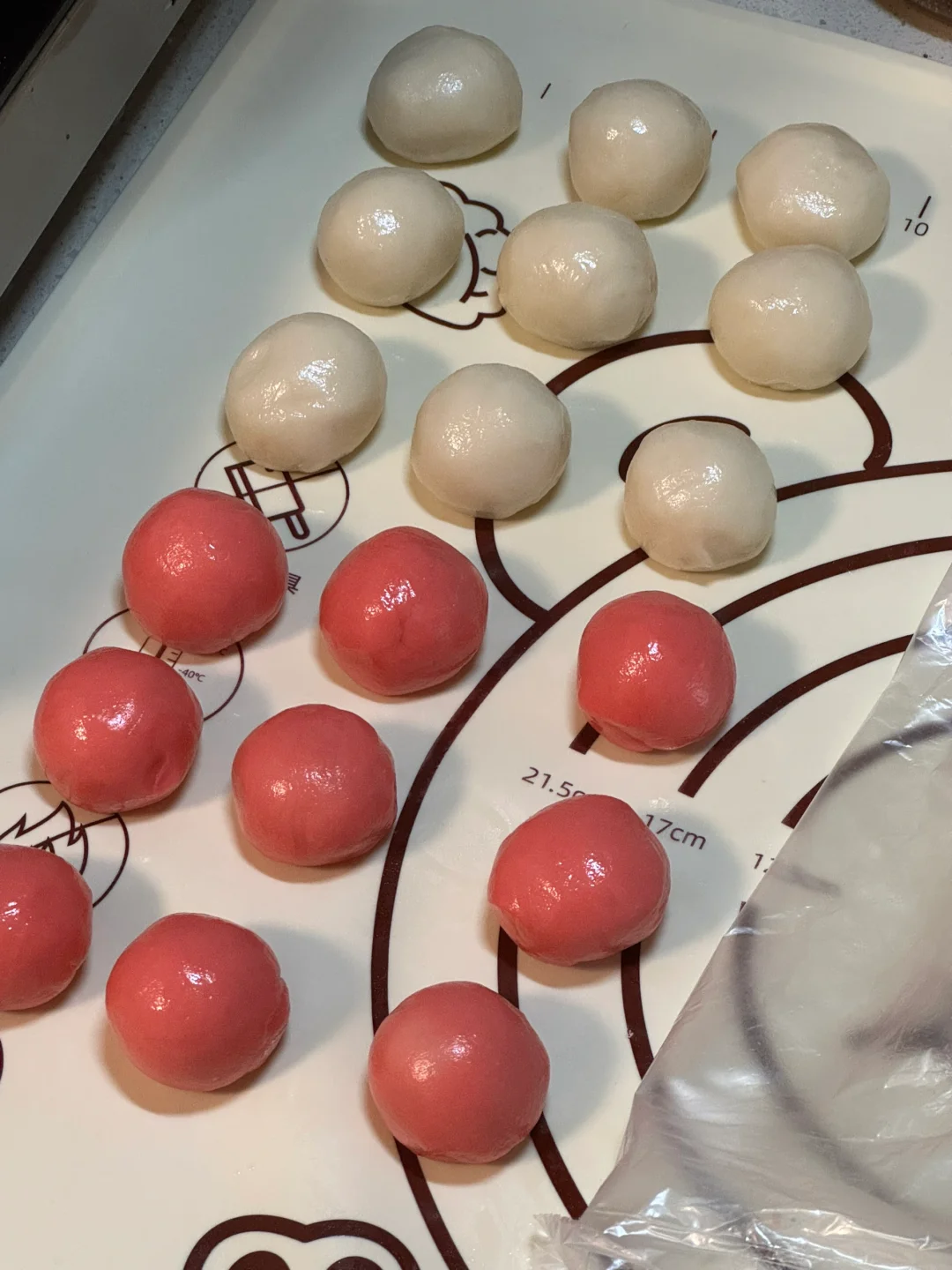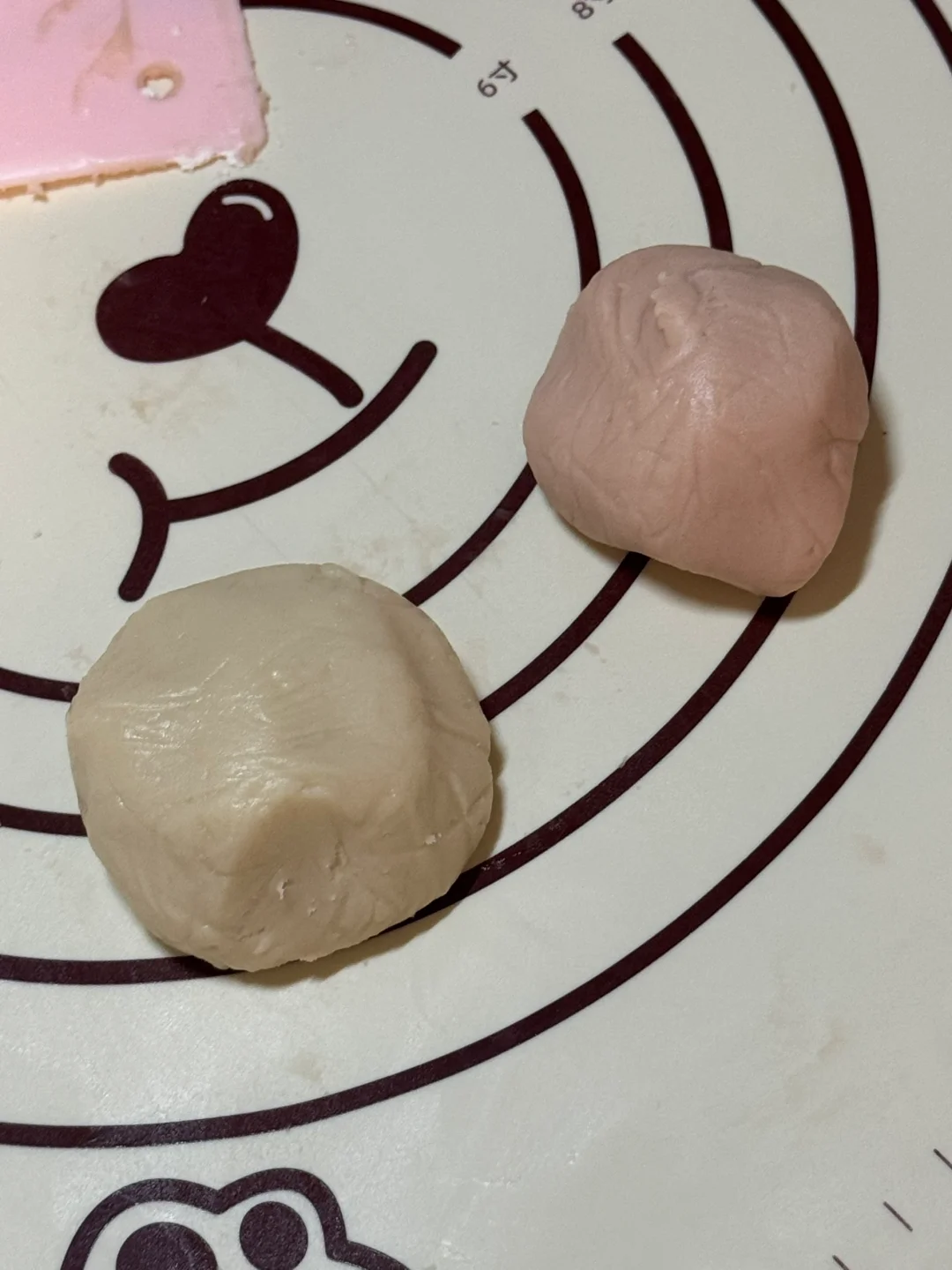 4.冷藏后把油皮、油酥均分成9份(一定要记得盖保鲜膜,防止风干)取一个油皮压扁包入油酥,底部要捏紧,然后搓圆,完成后放保鲜膜,粉色的的也一样,油皮包入油酥。