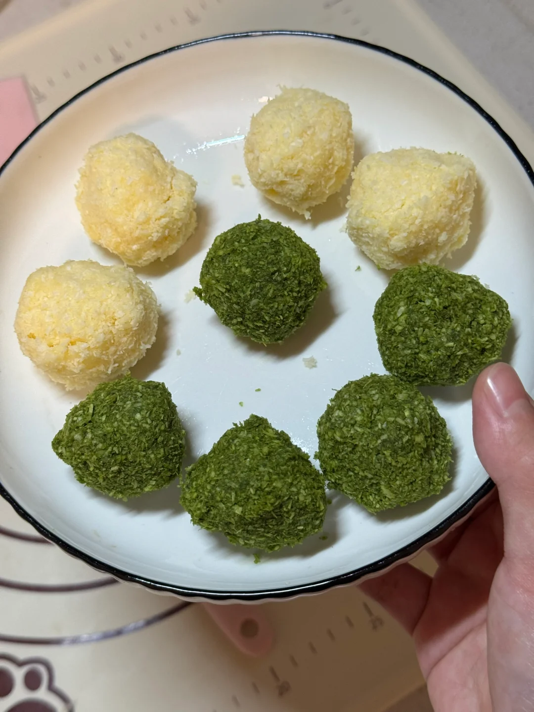 3.椰蓉馅全部混合均匀,(黄油要记得提前软化,我这边还做了一些抹茶口味的,就加了一些抹茶粉)均分成18g,揉圆放冷冻备用。