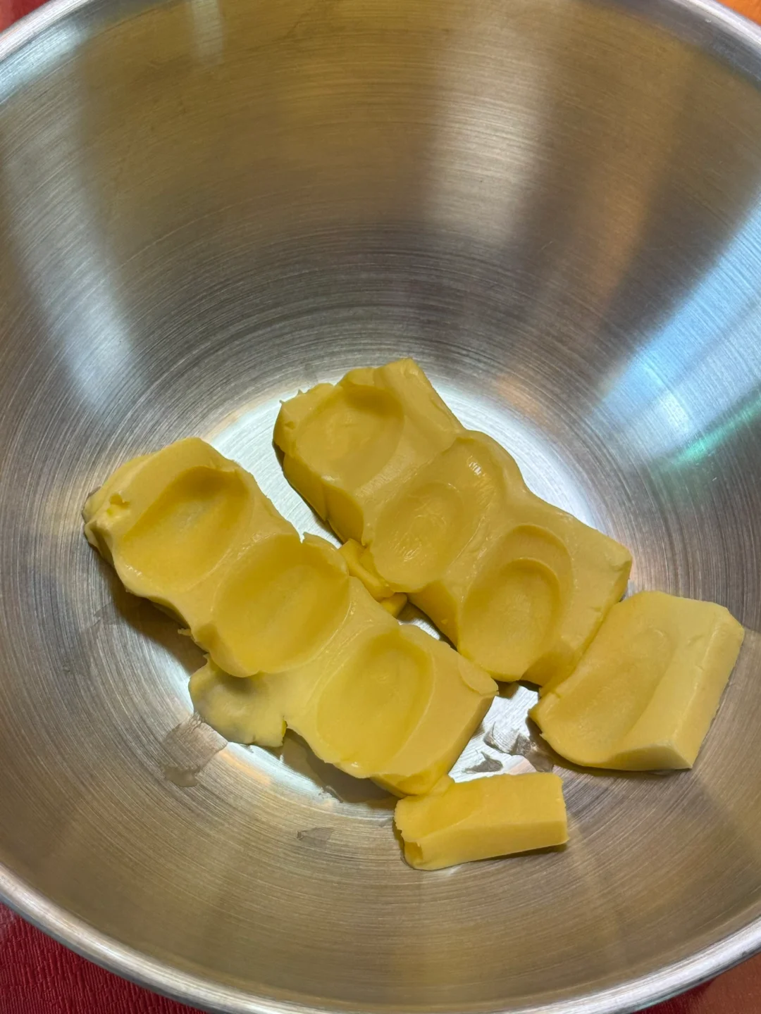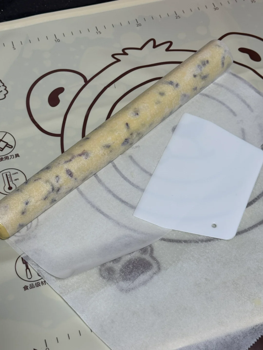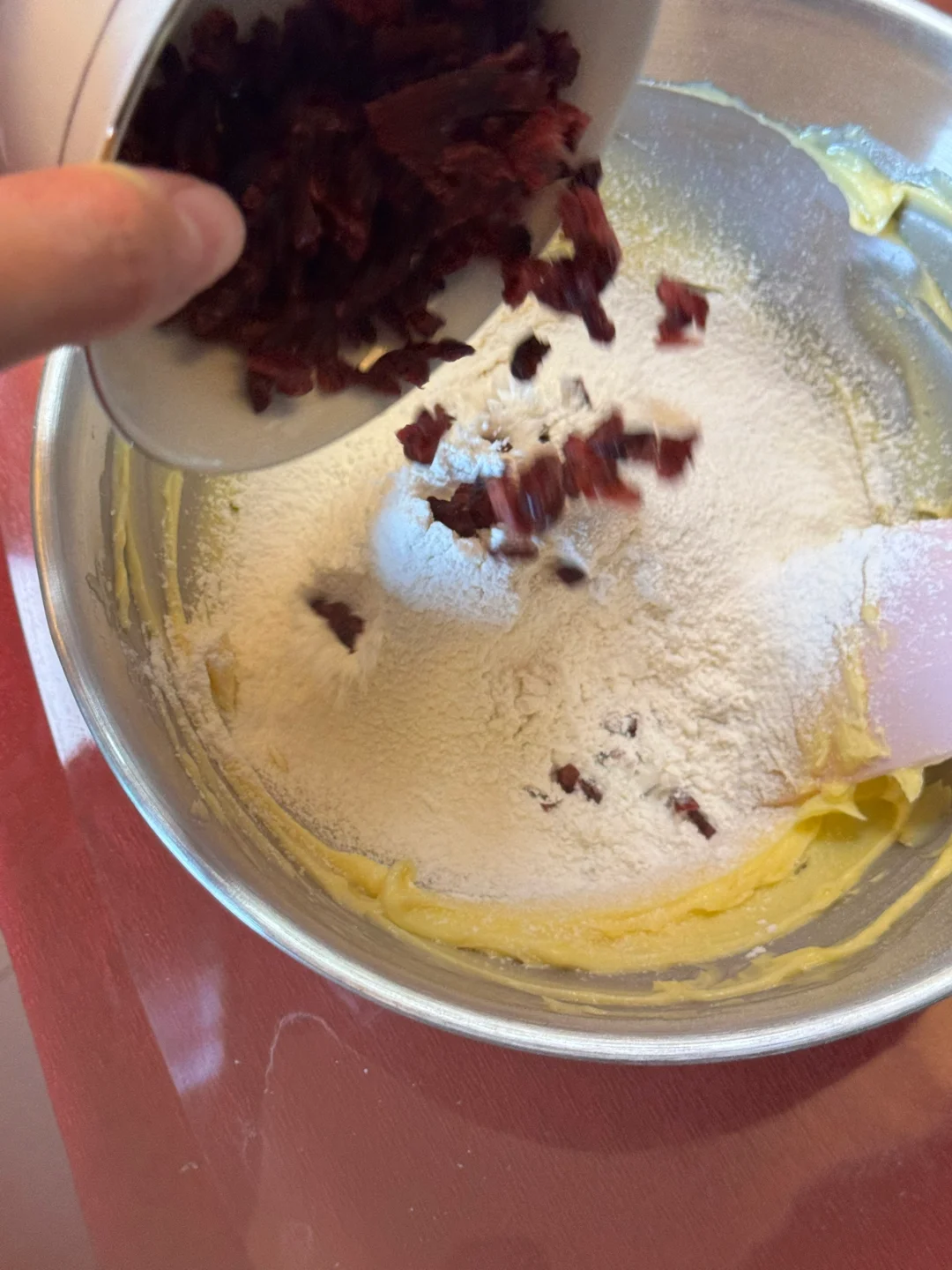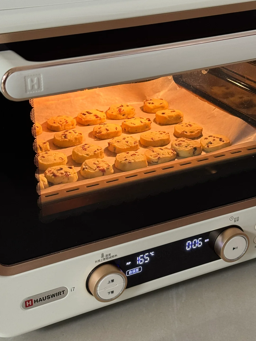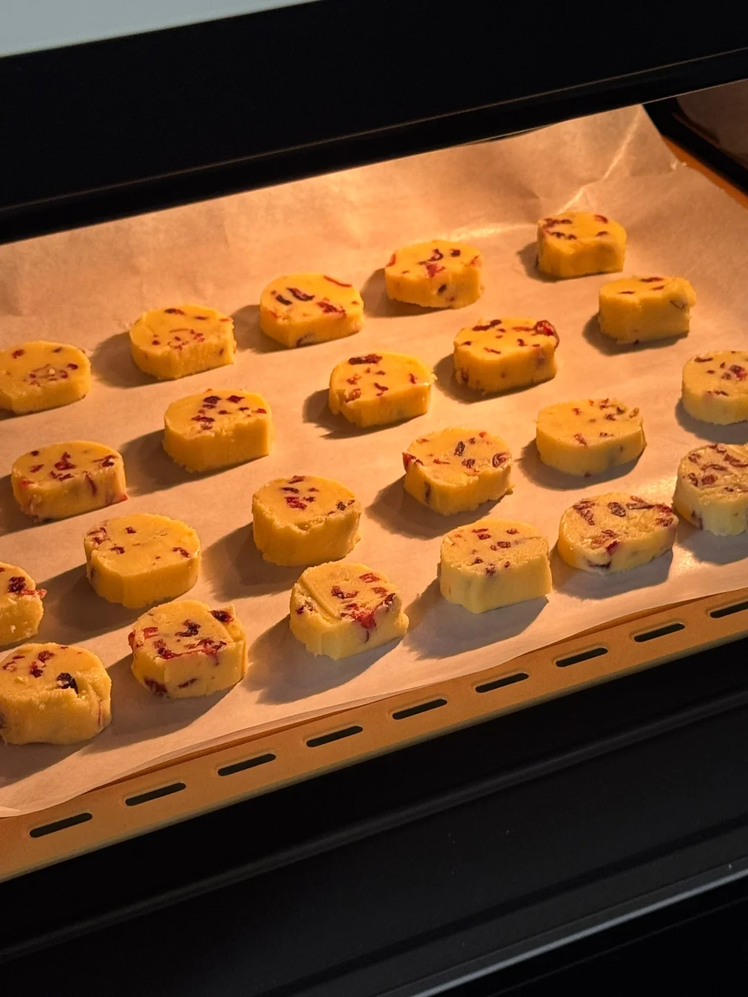 🌷食材: 黄油75g 糖粉55g 常温蛋液15g 低筋面粉115g 蔓越莓干碎40g 🌷做法: 1.黄油软化后,加入糖粉搅拌至顺滑。 2.加入常温蛋液搅拌至顺滑。 3.筛入低筋面粉、蔓越莓干碎,先用切拌的手法再下手揉成团。 4.面团整理成圆柱形冷冻1小时,烤箱提前预热,取出回温10分钟,切成片,放入烤盘,165度烘烤20-25分钟。 🌷口感非常酥脆,奶香味很浓郁,快去试试吧[哇R]