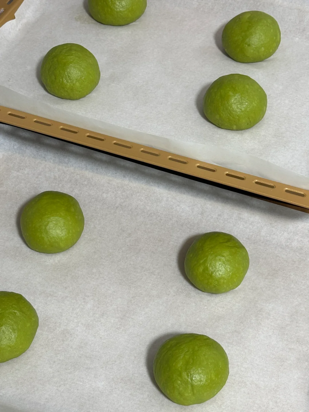 2.放入烤箱28度发酵1小时,取出排气均分成8份,每个面团中间收拢,然后揉圆,全部揉圆摆入烤盘盖上保鲜膜,进行二次发酵35度40分钟。