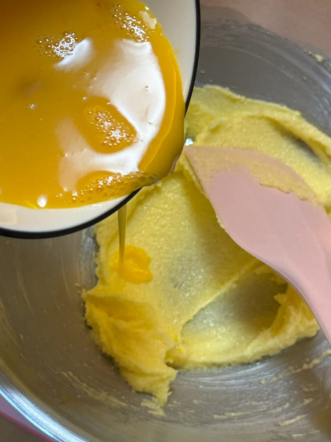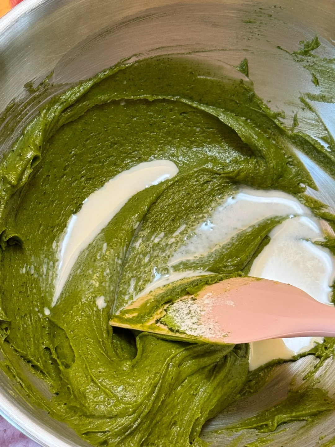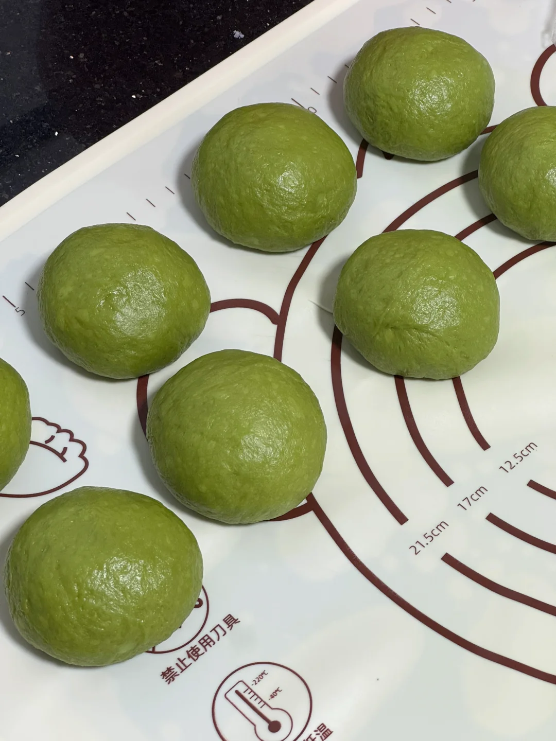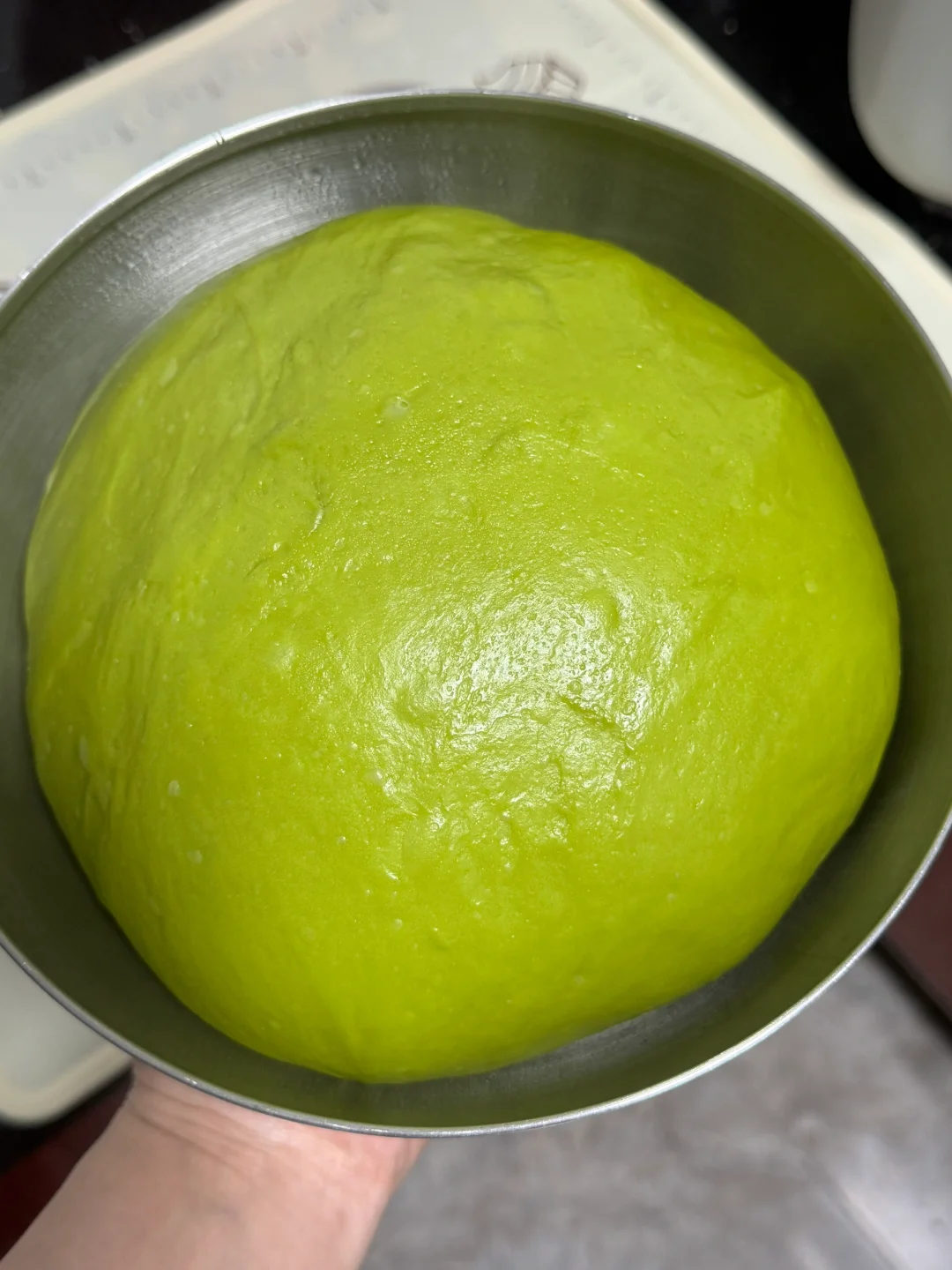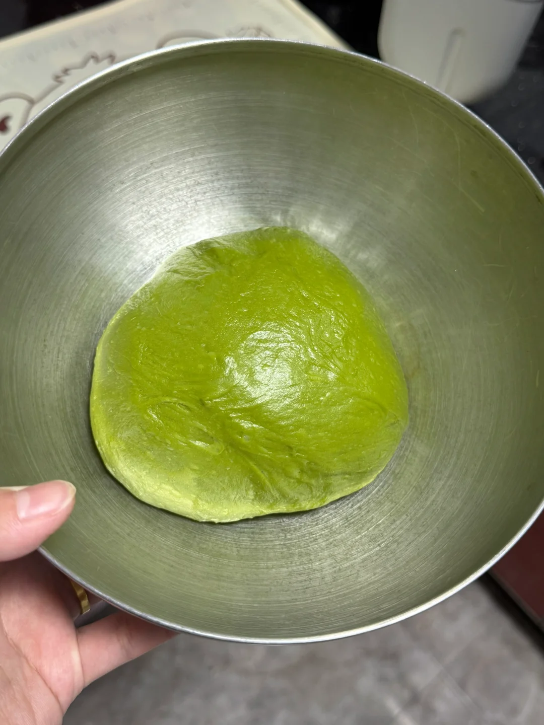 3.发酵的时间可以做酥皮酱,软化好的黄油加入细砂糖拌匀,加入鸡蛋液、抹茶粉、低筋面粉搅拌均匀,再倒入牛奶混匀,挤入发酵好的面团表面。