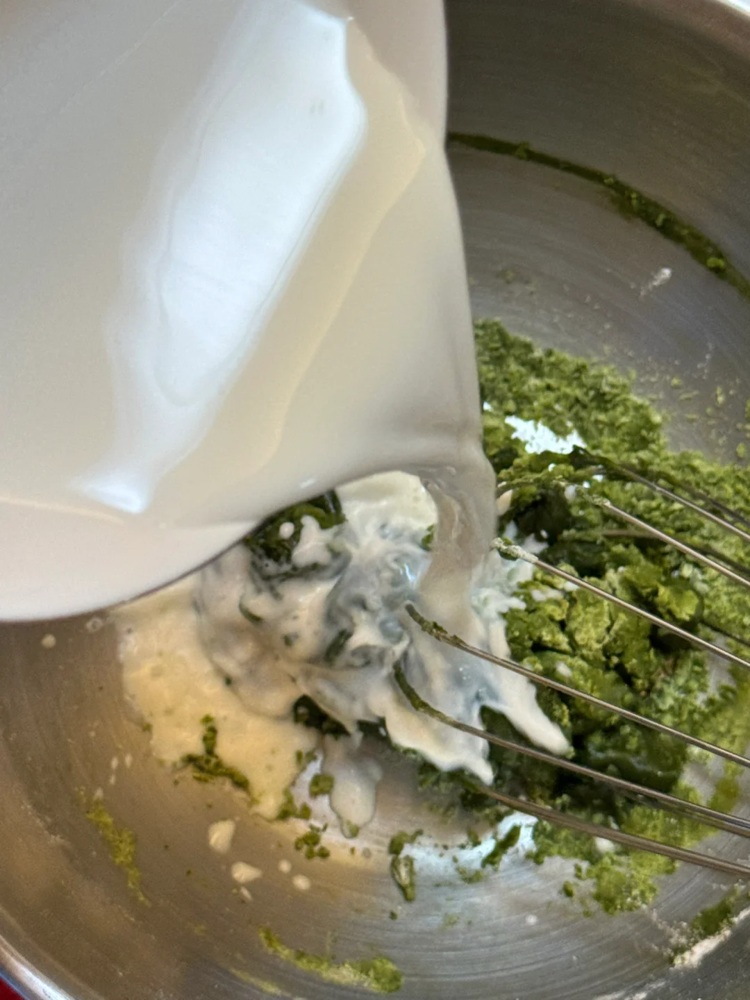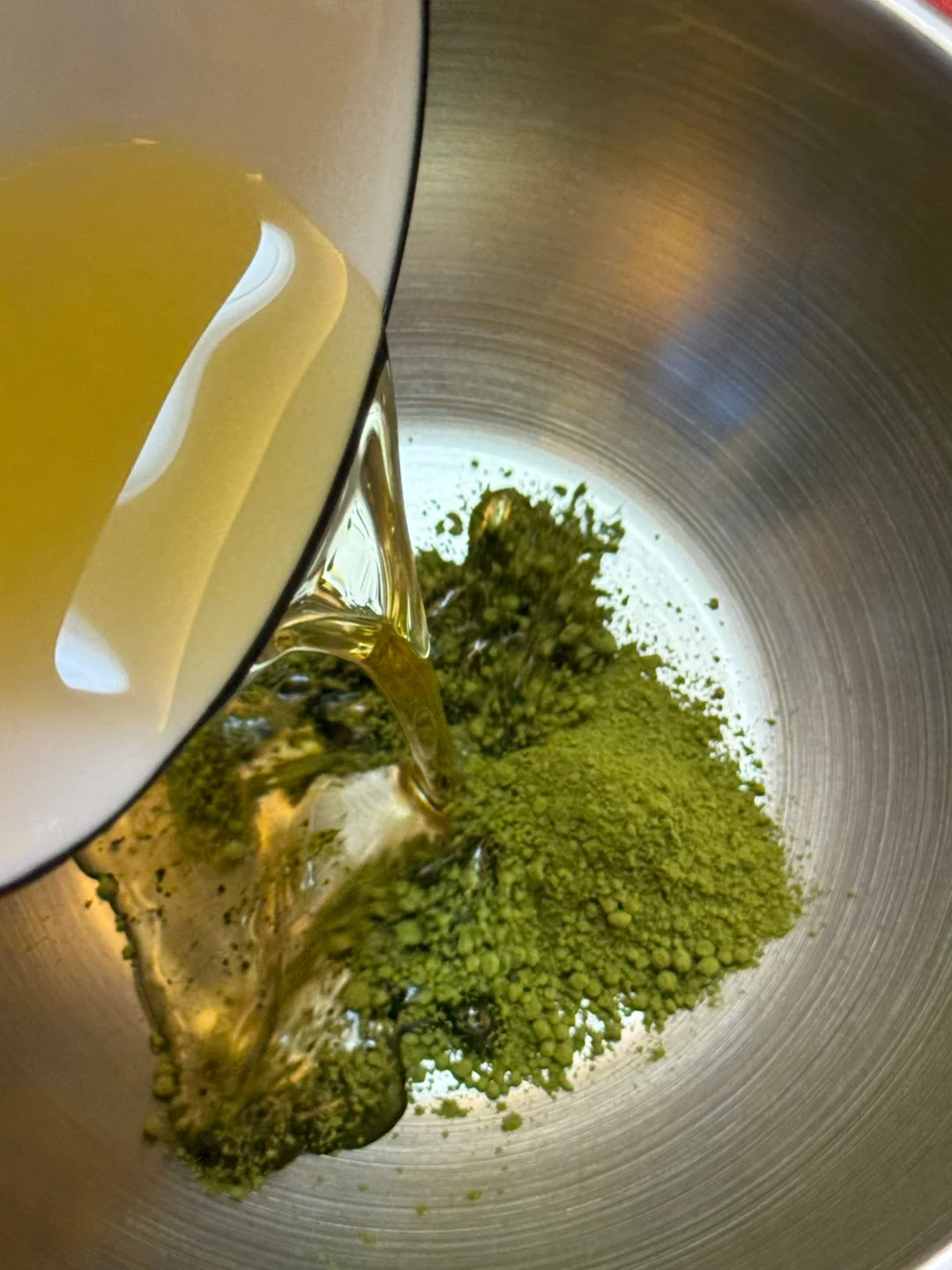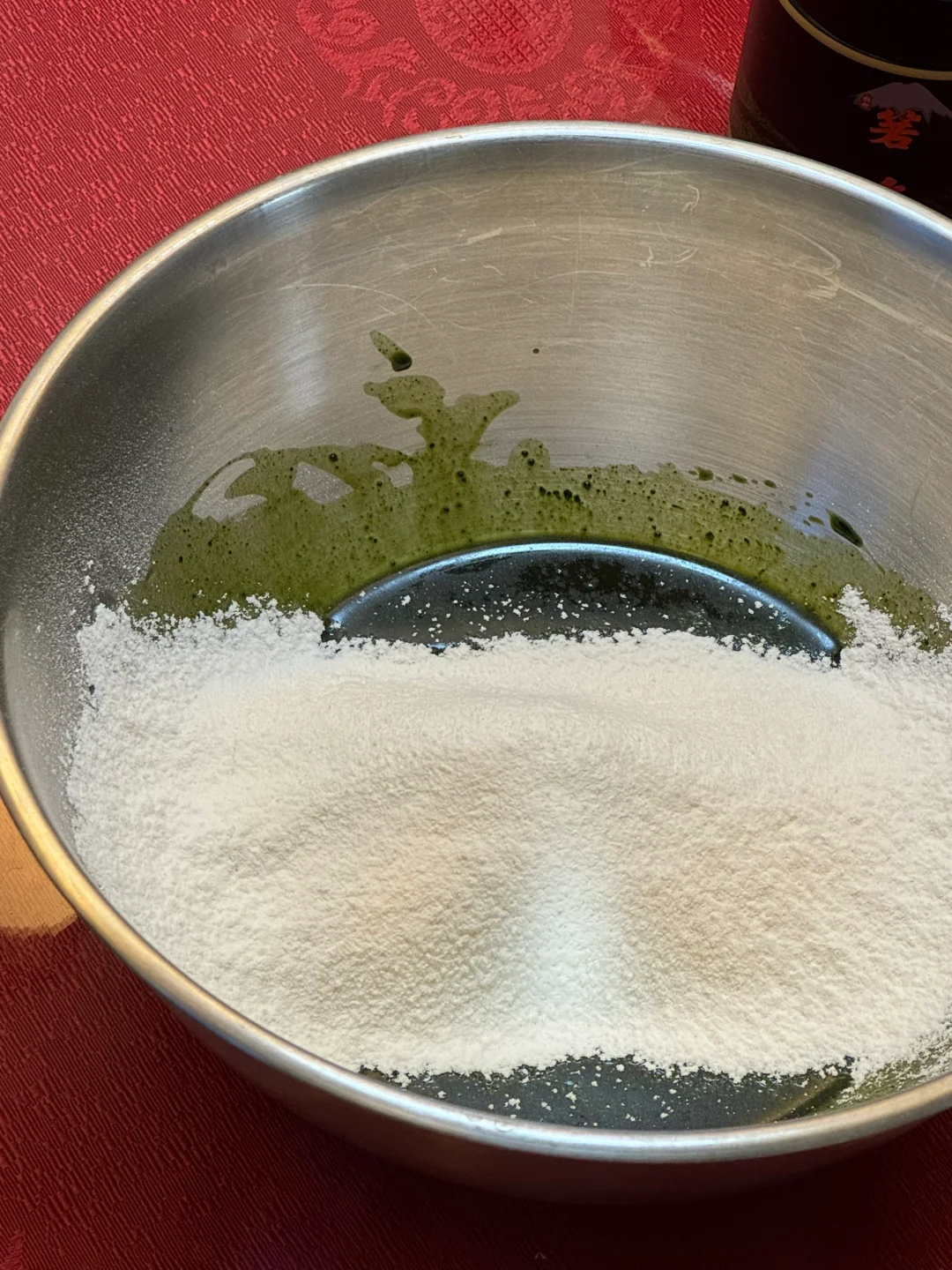 1.抹茶粉、玉米油(稍微加热)搅拌均匀,筛入低筋面粉搅拌均匀,再倒入纯牛奶搅拌均匀(全程用Z字形的手法搅拌)