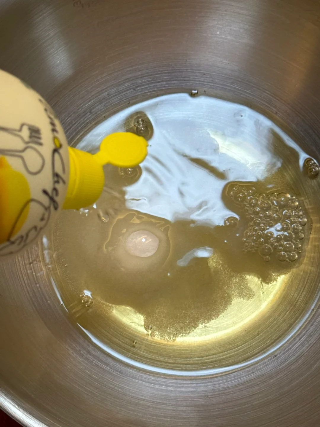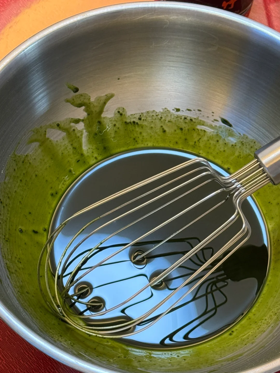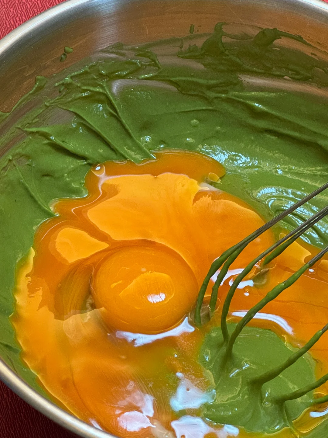 1.抹茶粉、玉米油(稍微加热)搅拌均匀,筛入低筋面粉搅拌均匀,再倒入纯牛奶搅拌均匀(全程用Z字形的手法搅拌)