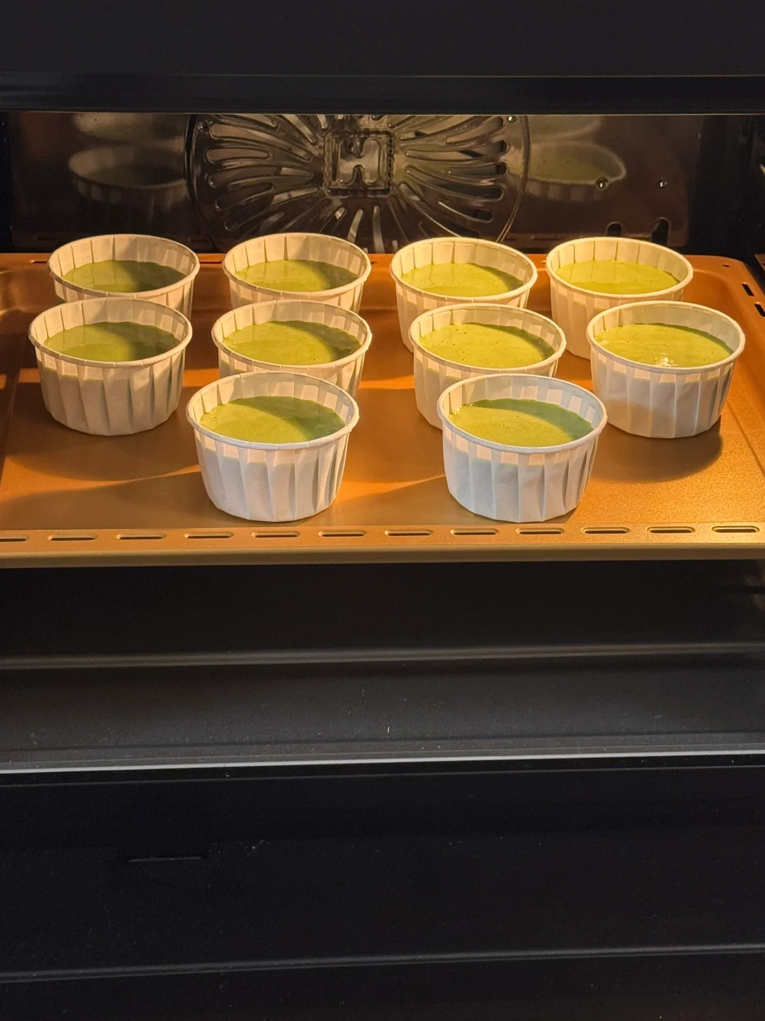3.取1/3蛋白霜到抹茶糊翻拌均匀,再倒回蛋白霜中翻拌均匀,装入裱花袋,挤入纸杯,用牙签划拉划拉一下,消除表面气泡,烤箱提前预热,110度烘烤20分钟转130度烘烤30分钟。