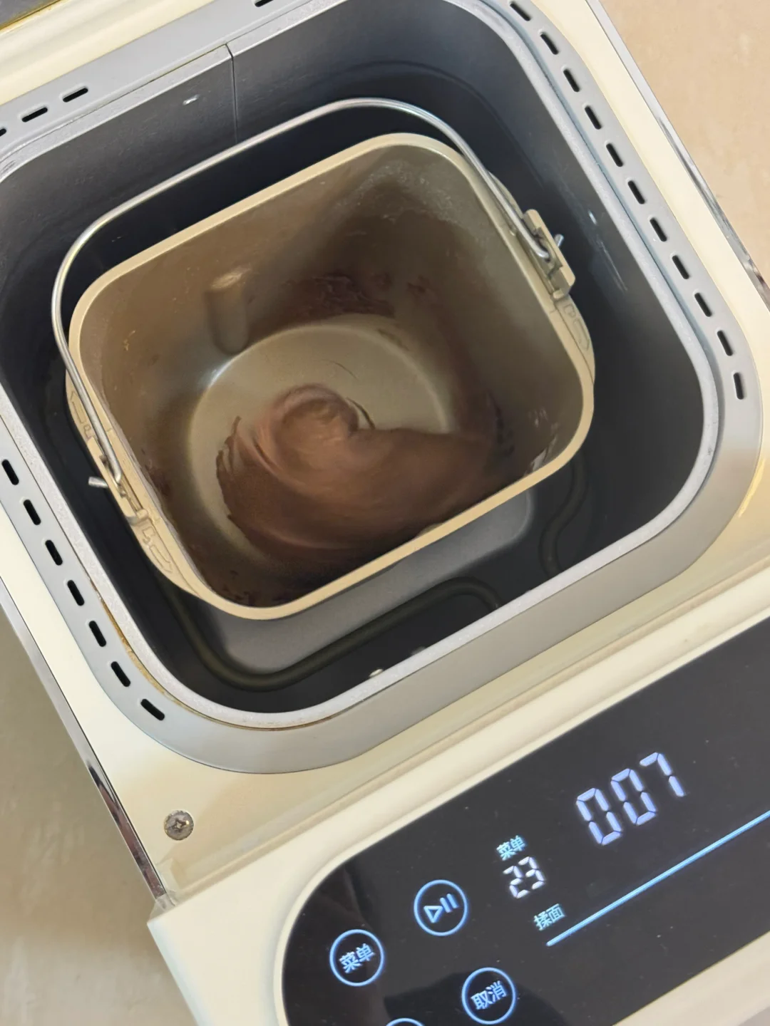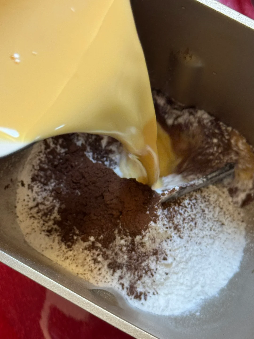 2.面包桶里倒入麻薯预拌粉、可可粉,再倒入牛奶鸡蛋混合液,开启揉面模式15分钟,揉至5分钟时放入软化好的黄油,继续揉(如果喜欢浓一点的巧克力味可以加一些耐高温巧克力豆)如果没有面包机,就除黄油外,揉至无干粉,再加入黄油揉至光滑面团(全程大概8分钟)