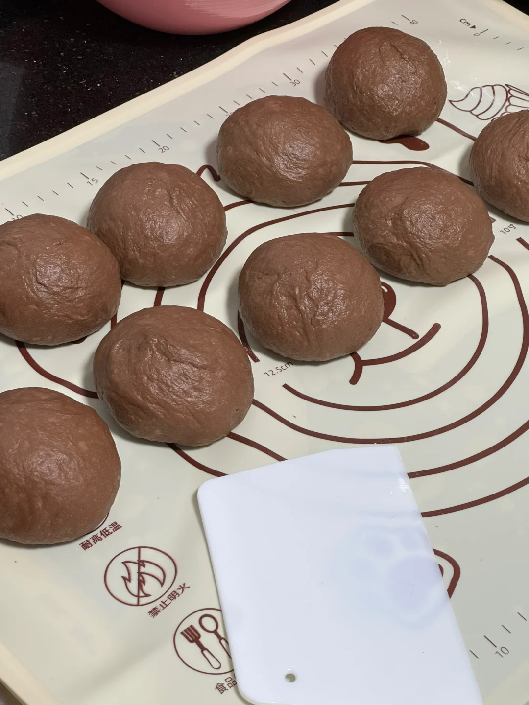 2.取排气均分成10份,每个大约100g,揉圆,盖上保鲜膜松弛20分钟,再取出一个面团,按扁,放入巧克力,再包起来,收口处捏紧,表面喷水沾满奥利奥碎,放入烤盘。
