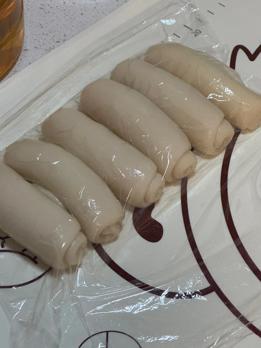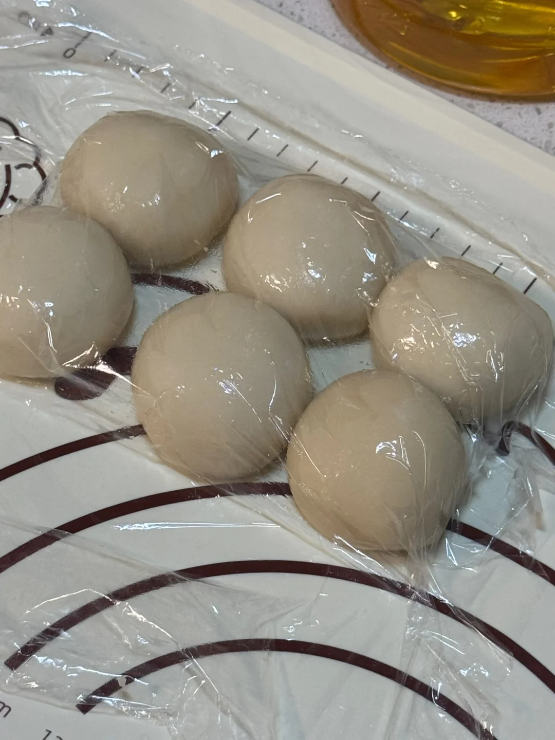 3.水油皮包入油酥,滚圆。然后再次按扁,擀长,卷起,保鲜膜盖住,盖保鲜膜室温松弛20分钟。