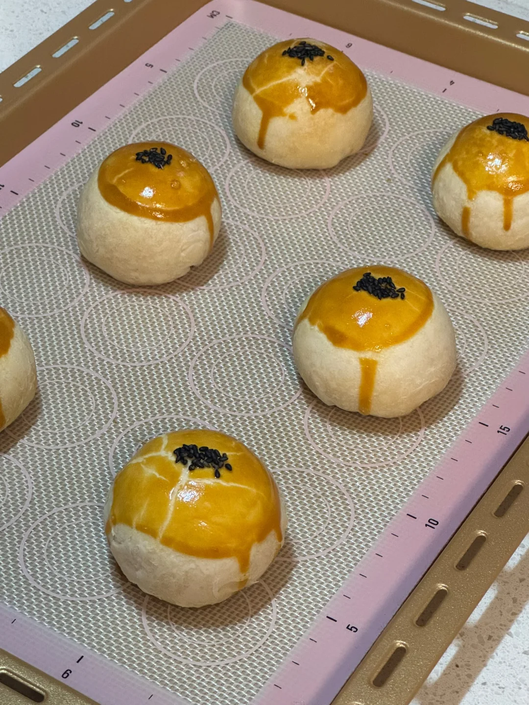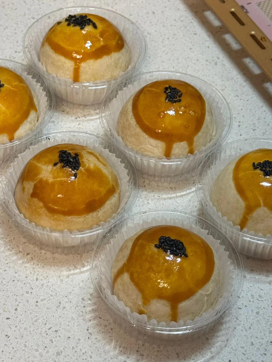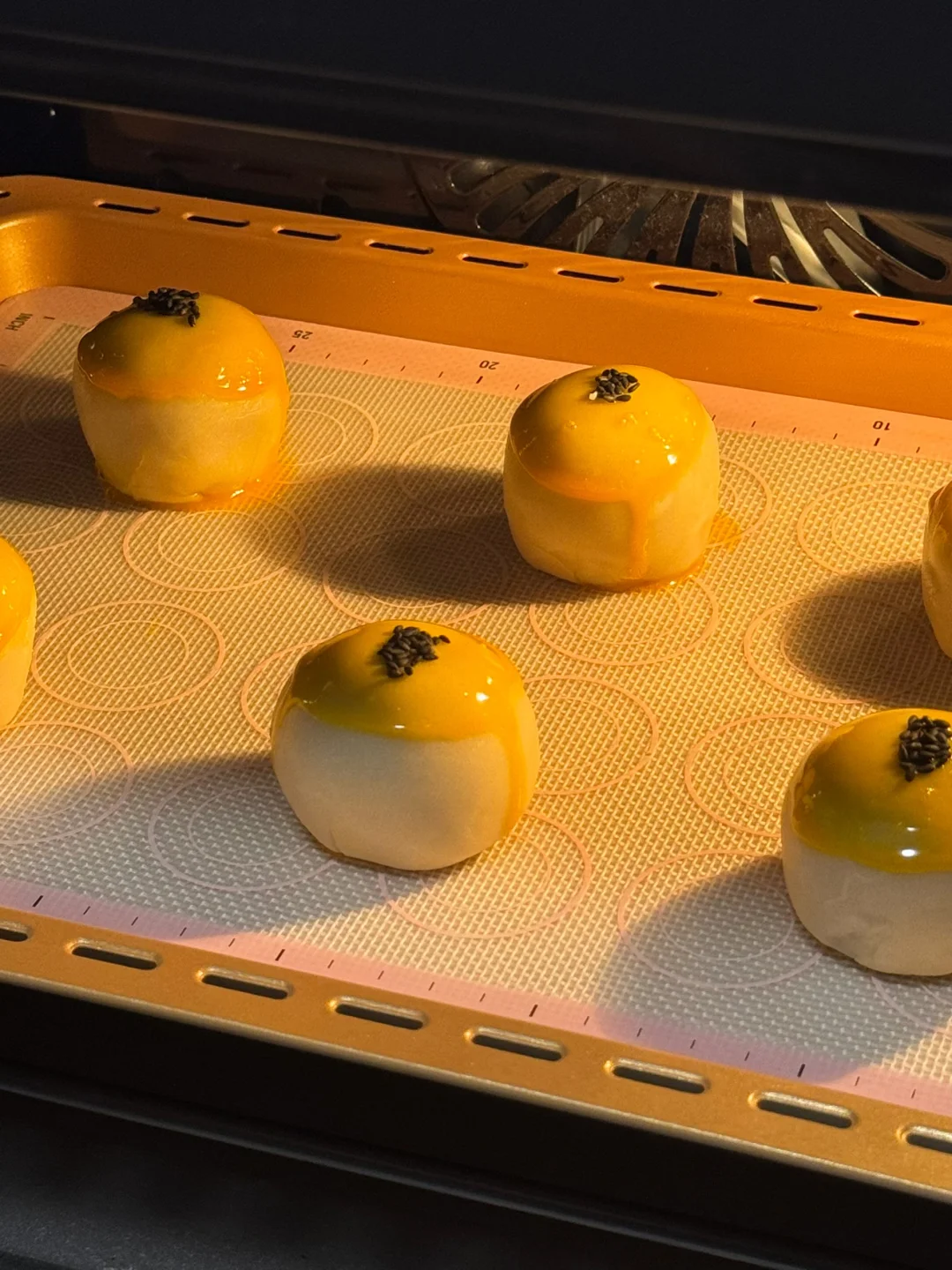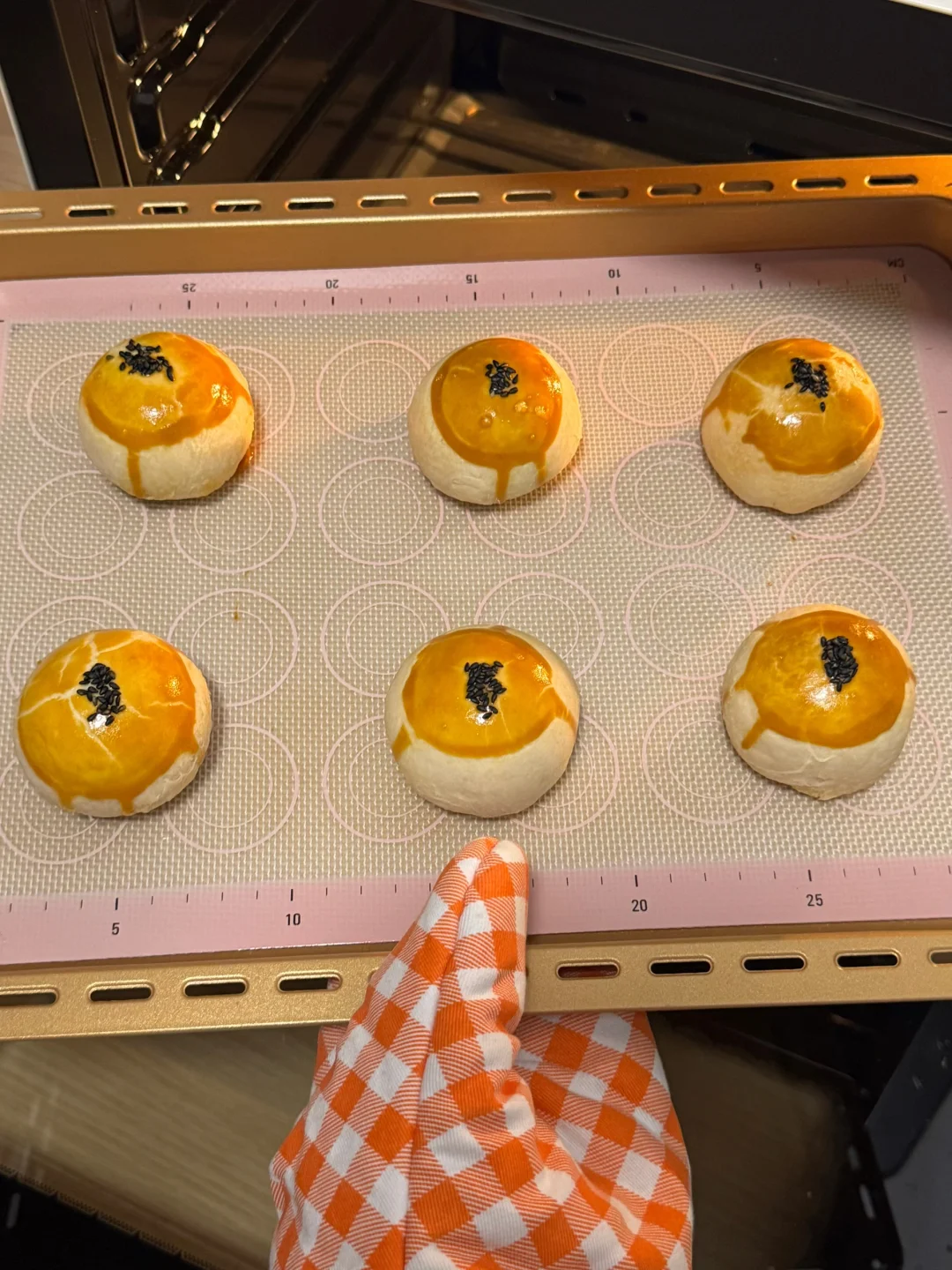 5.蛋黄酥的咸蛋黄生包怕腥可以喷点高度白酒,烘烤的时间一定要足够哦!