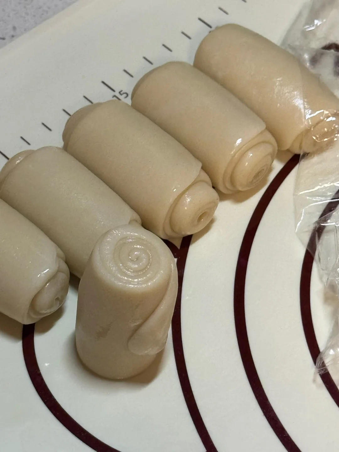 5.松弛好的水油皮,接口向上,按扁,再次擀长,卷起,室温松弛20分钟。